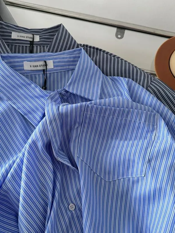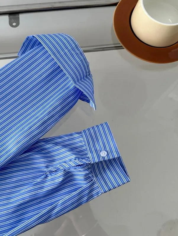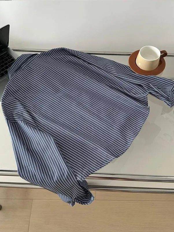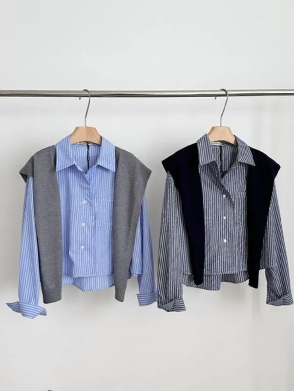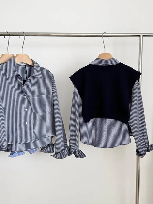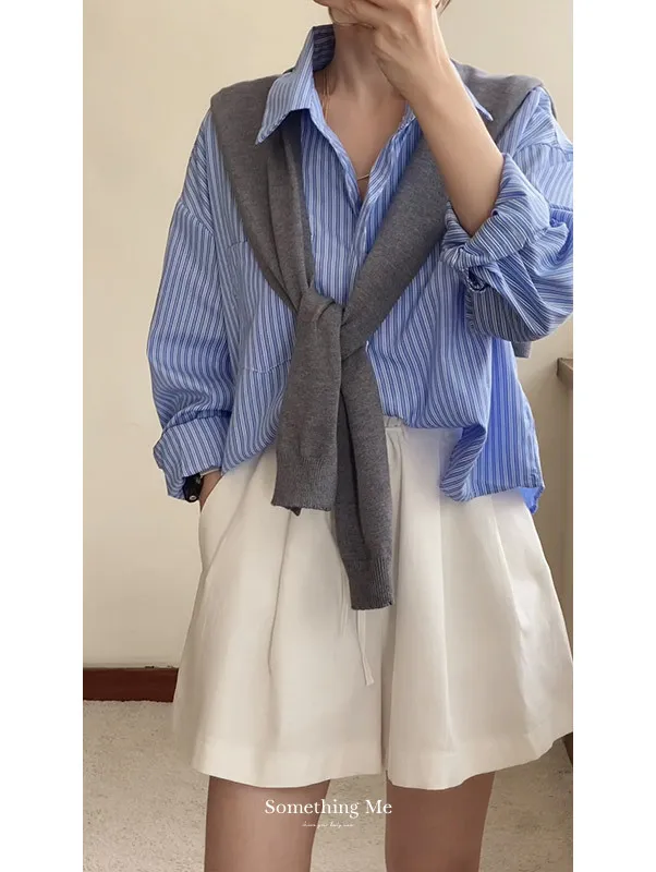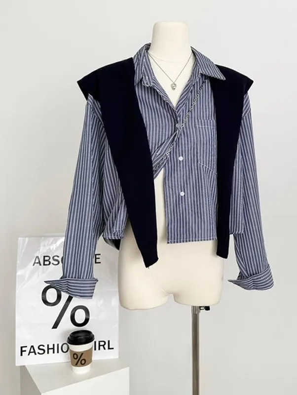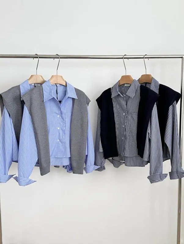 現貨!時髦豎紋短版長袖襯衫(附披肩) 2色