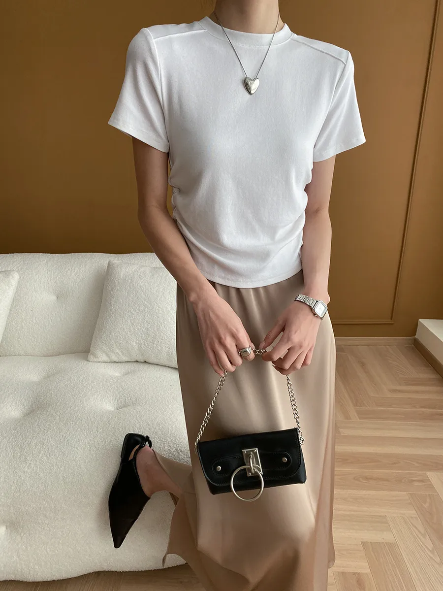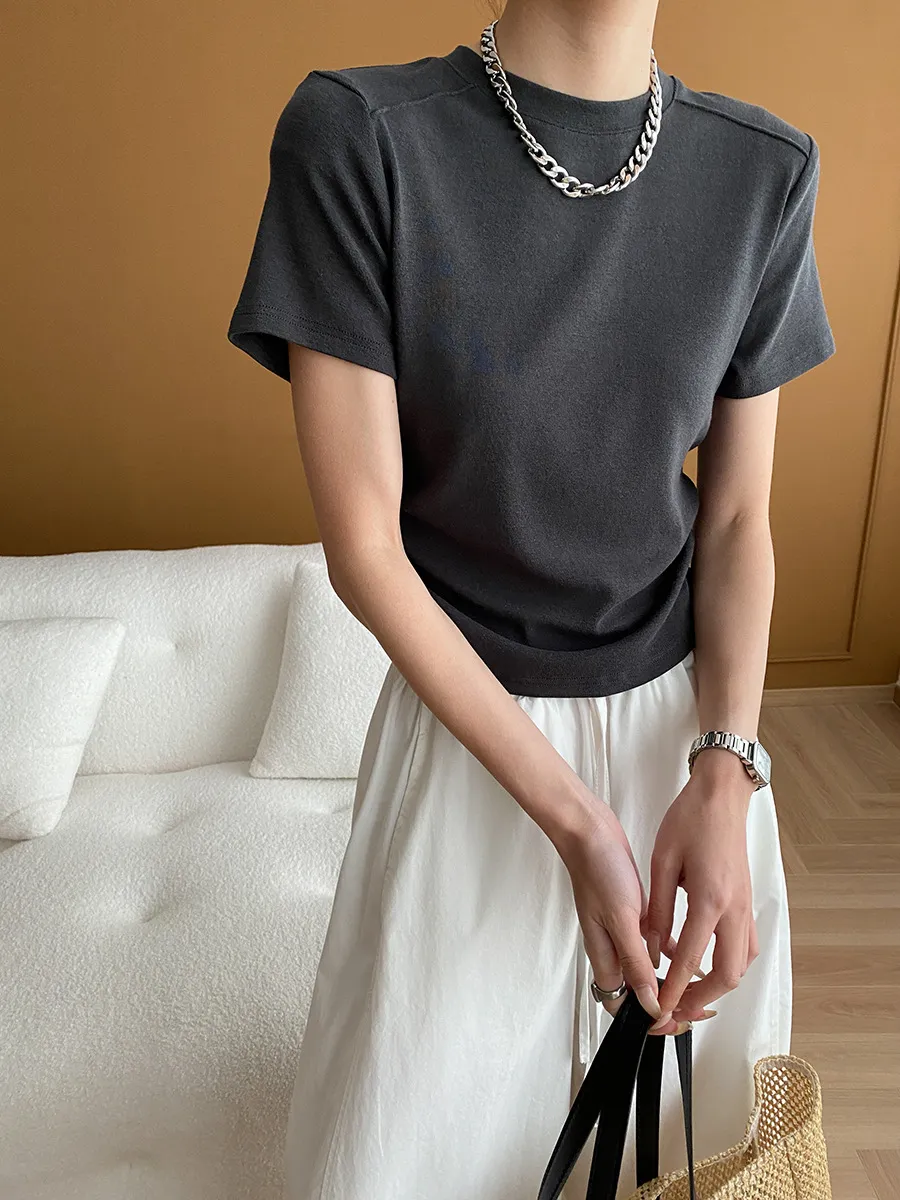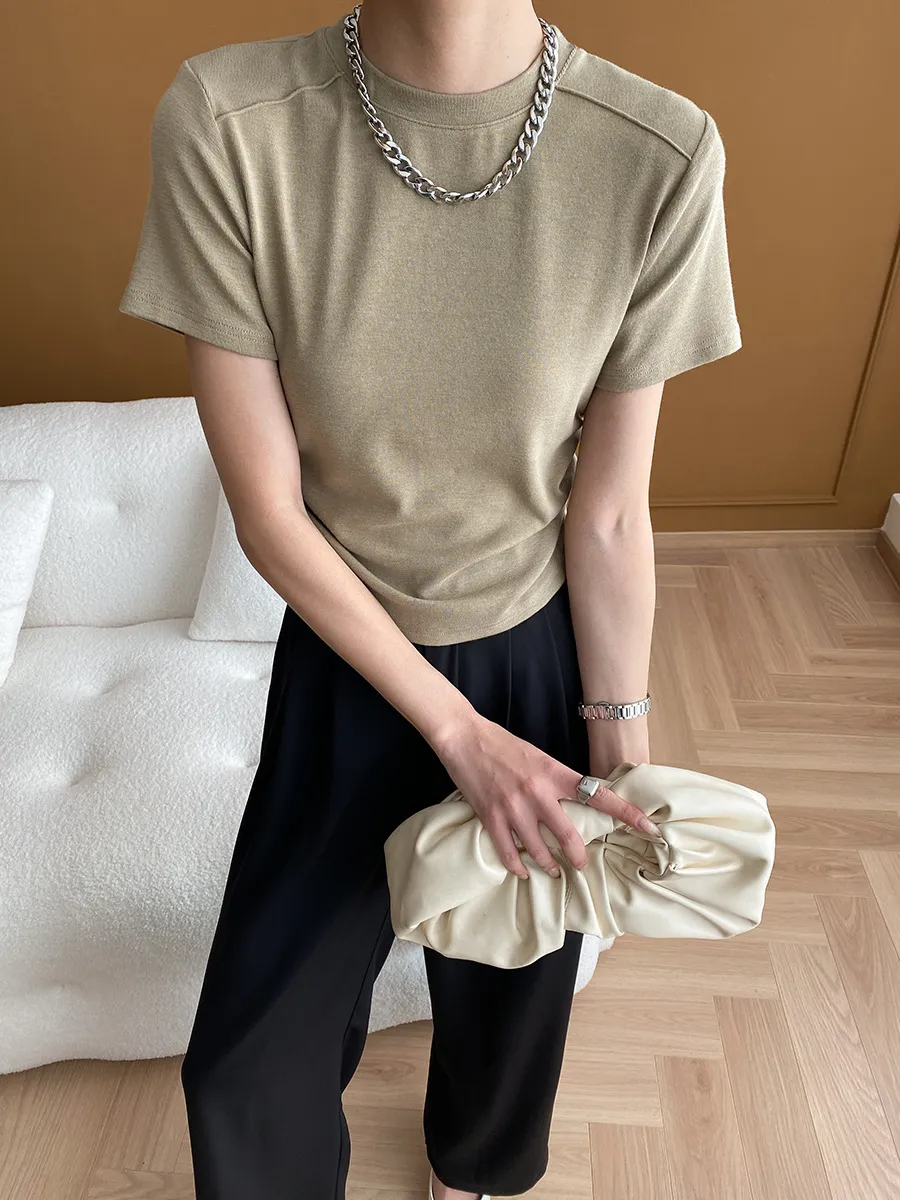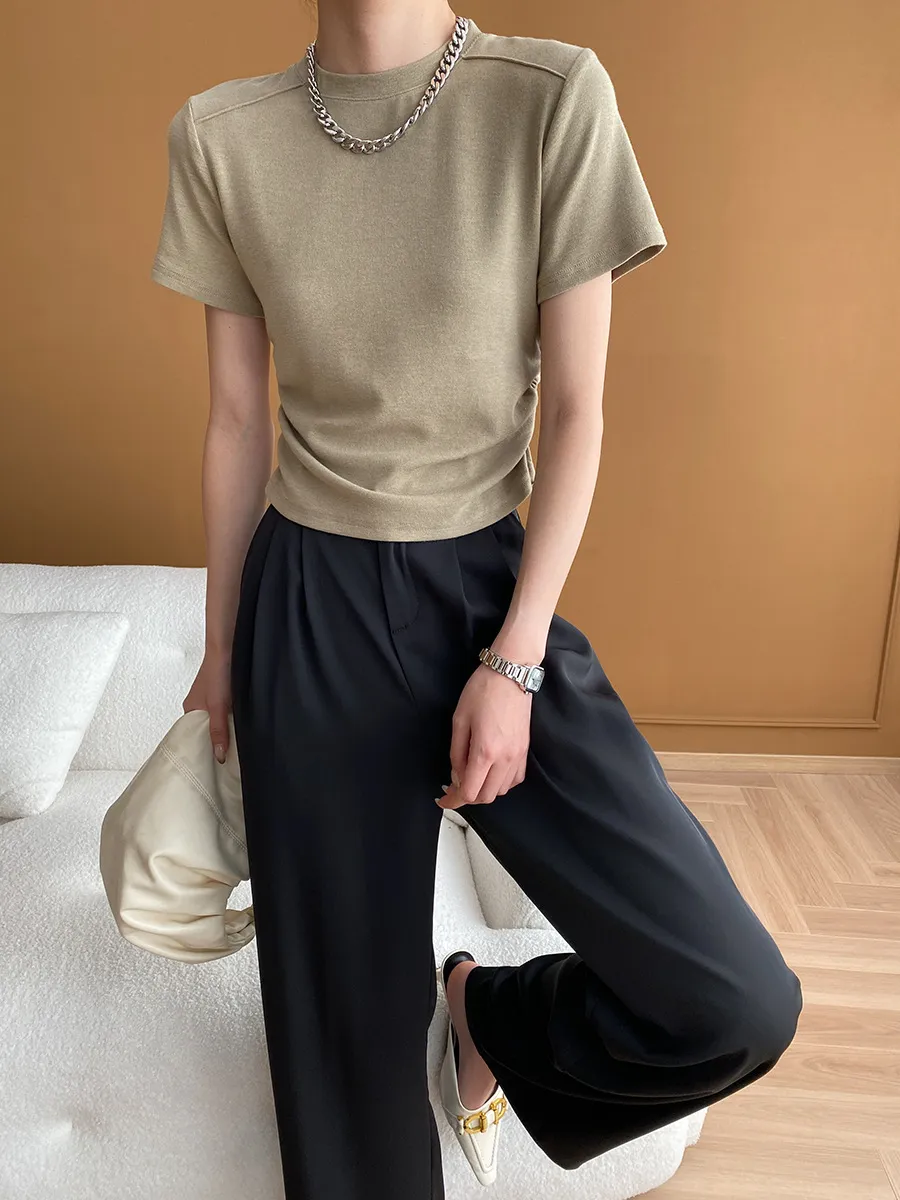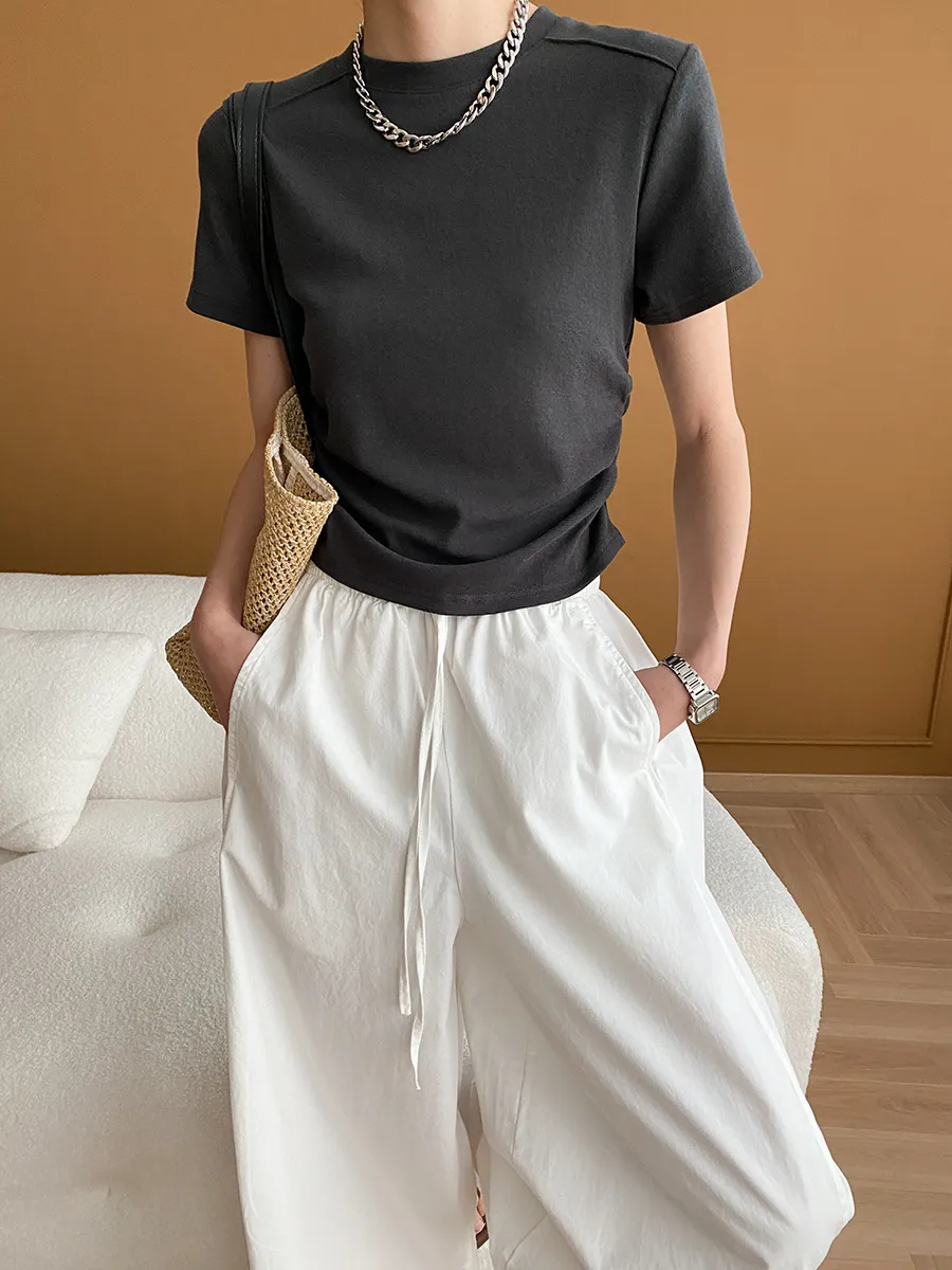 立體肩線!小圓領側皺收腰棉Tee 4色