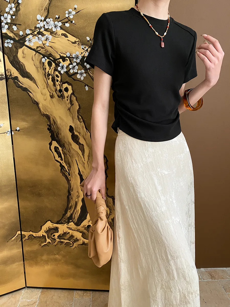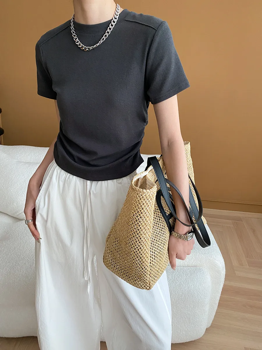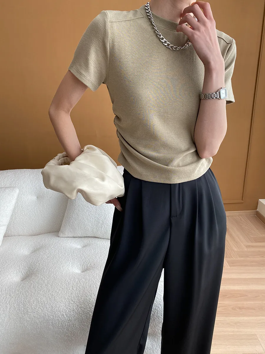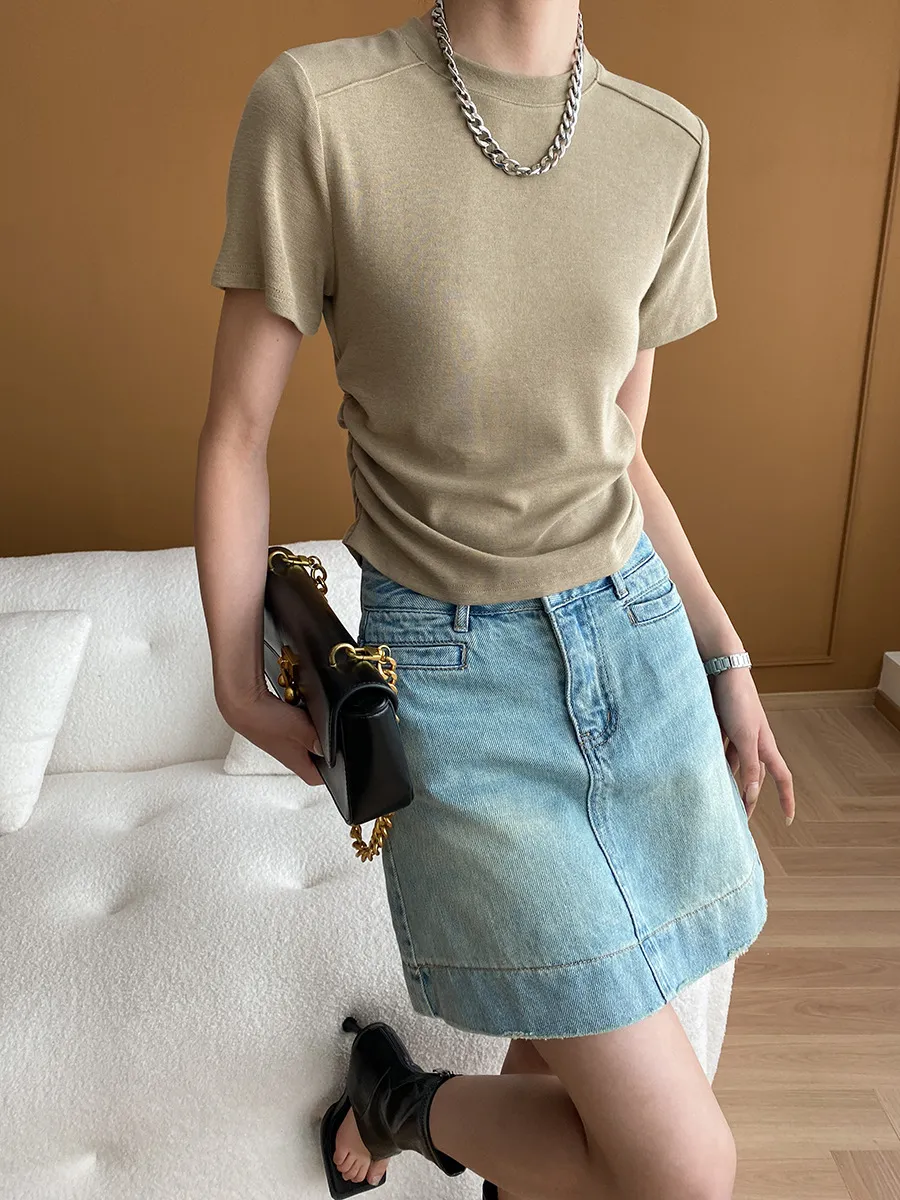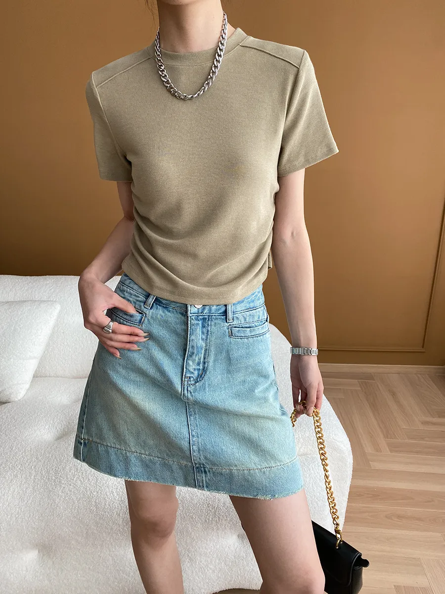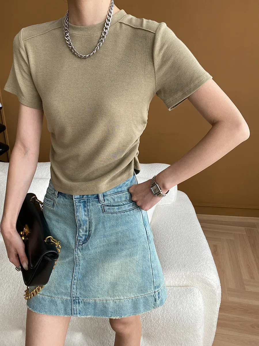 立體肩線!小圓領側皺收腰棉Tee 4色