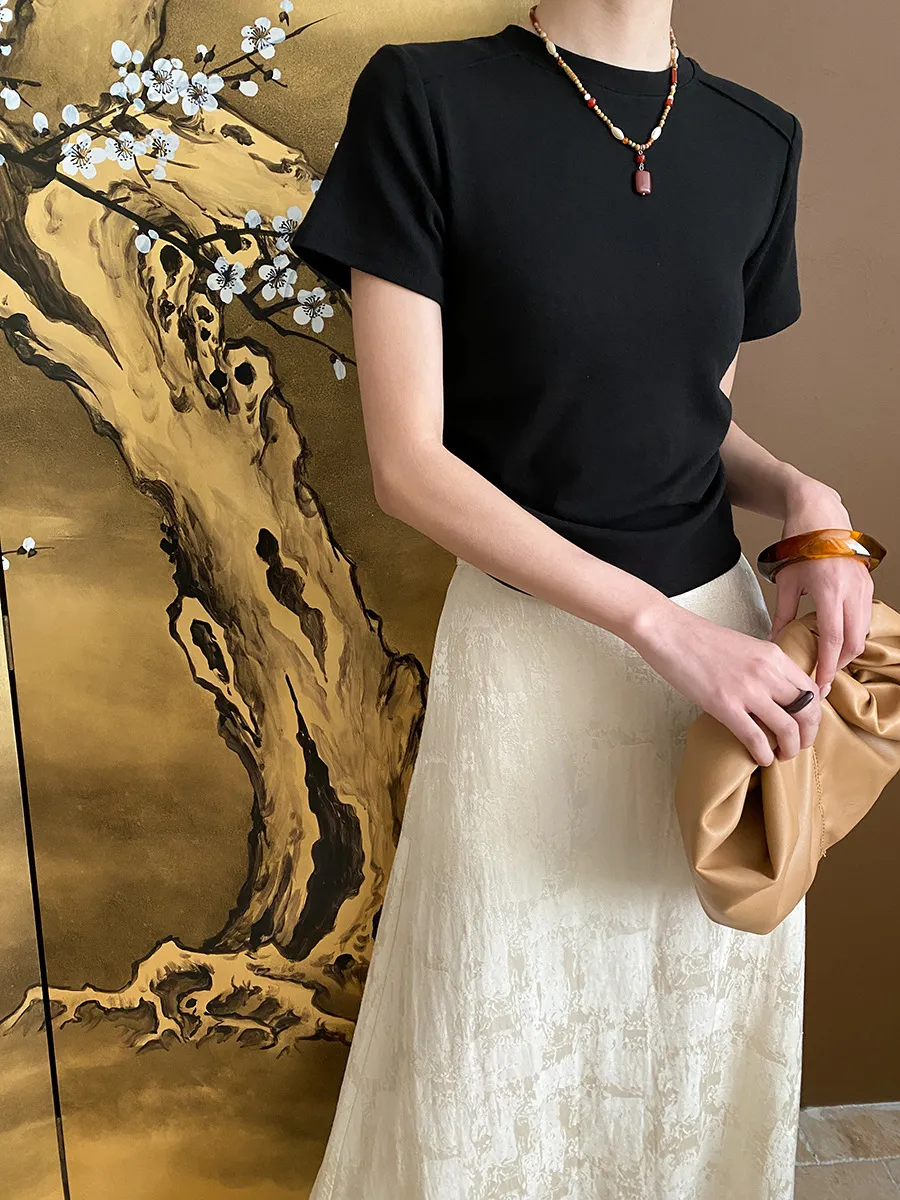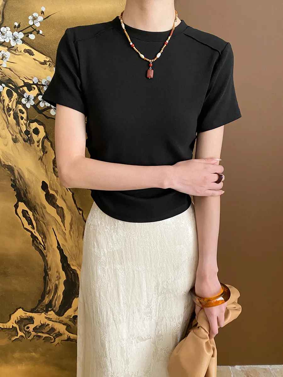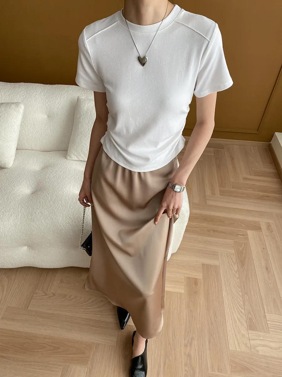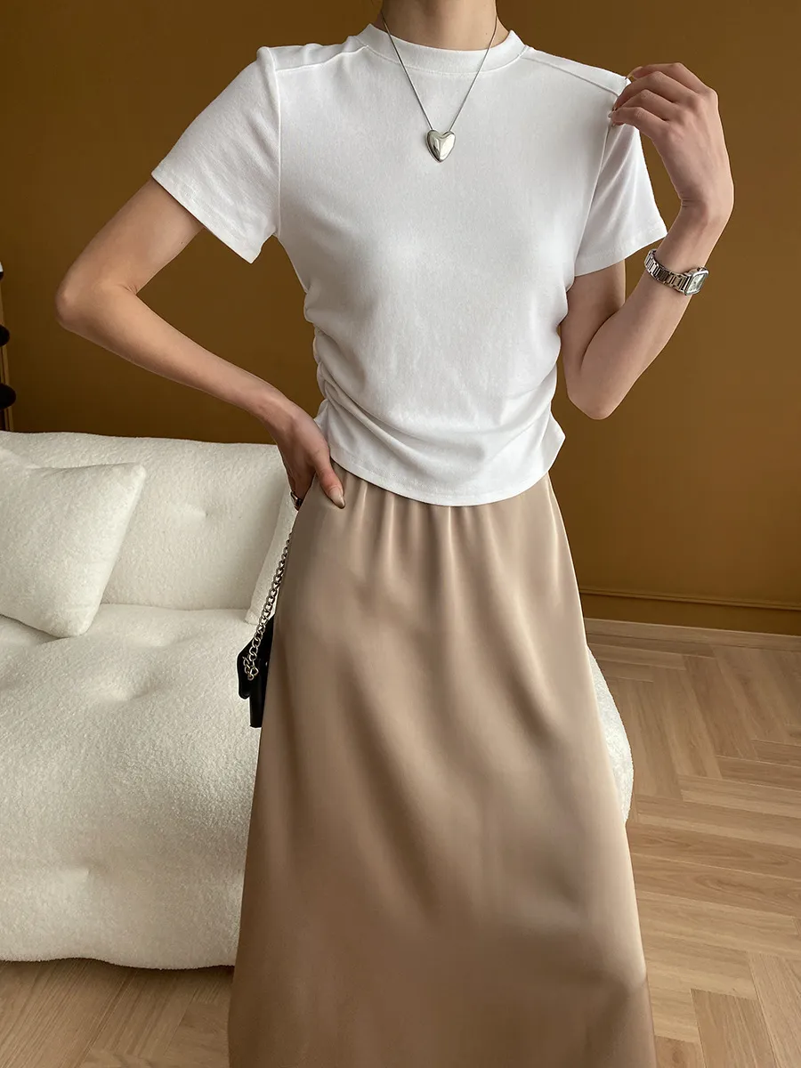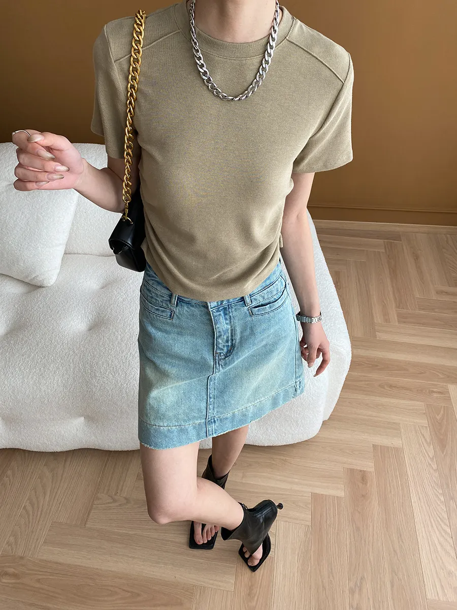 立體肩線!小圓領側皺收腰棉Tee 4色