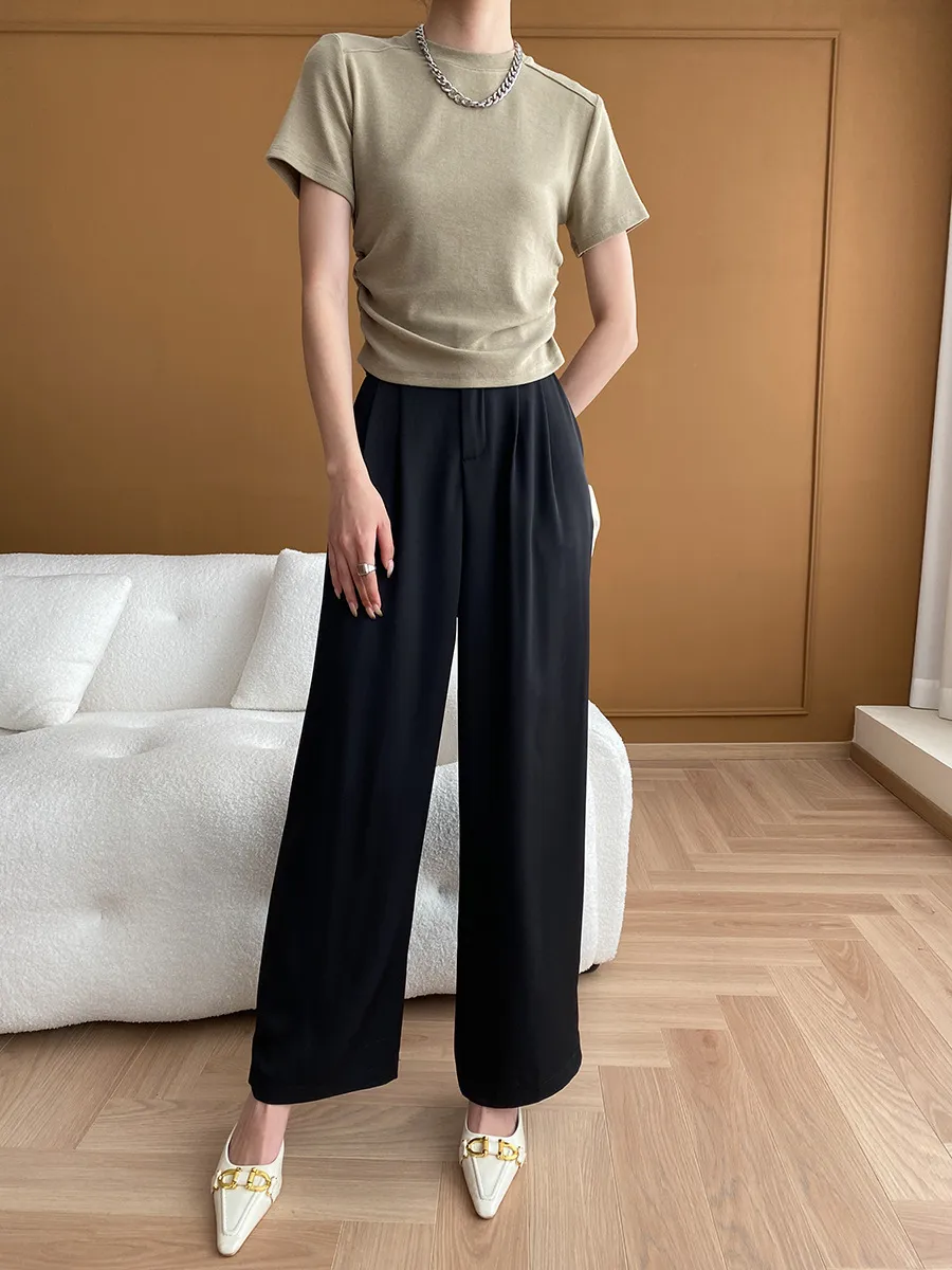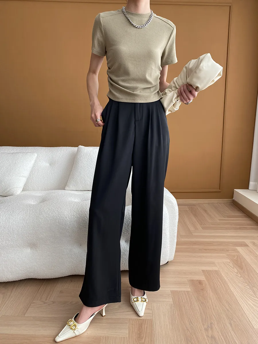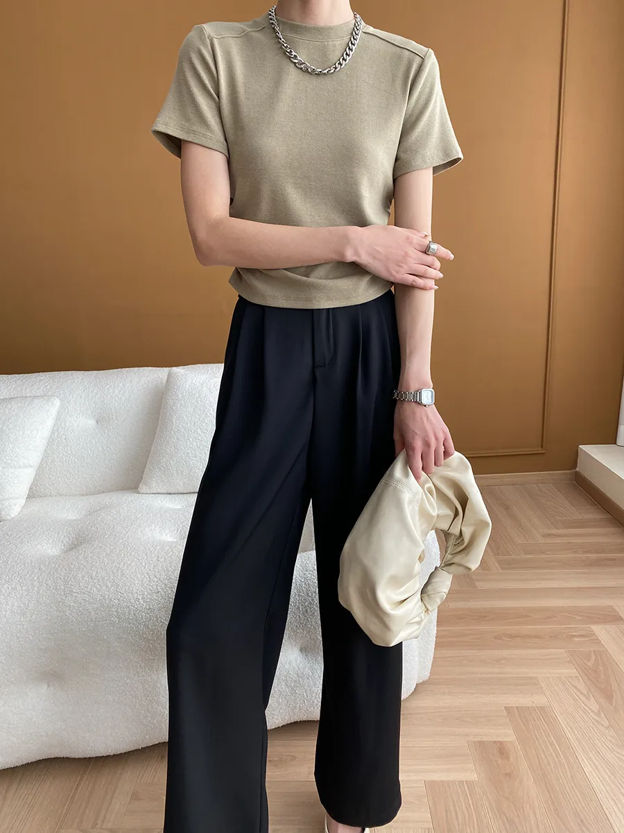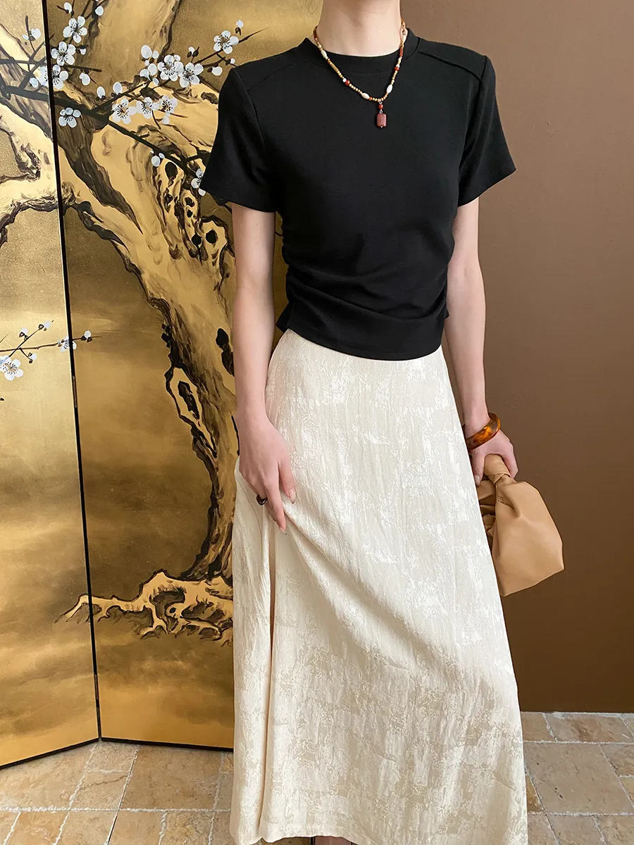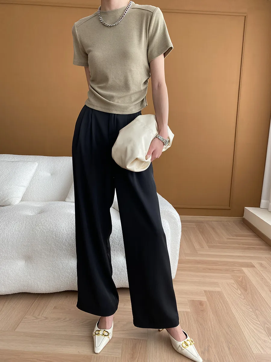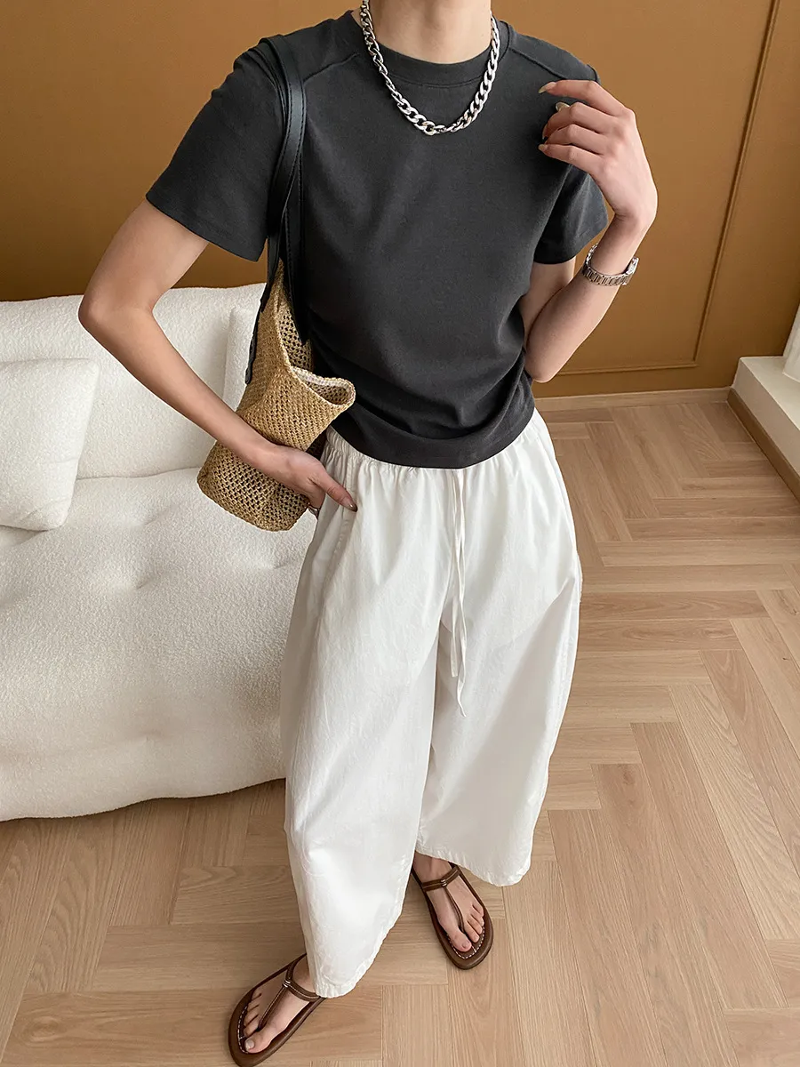 立體肩線!小圓領側皺收腰棉Tee 4色