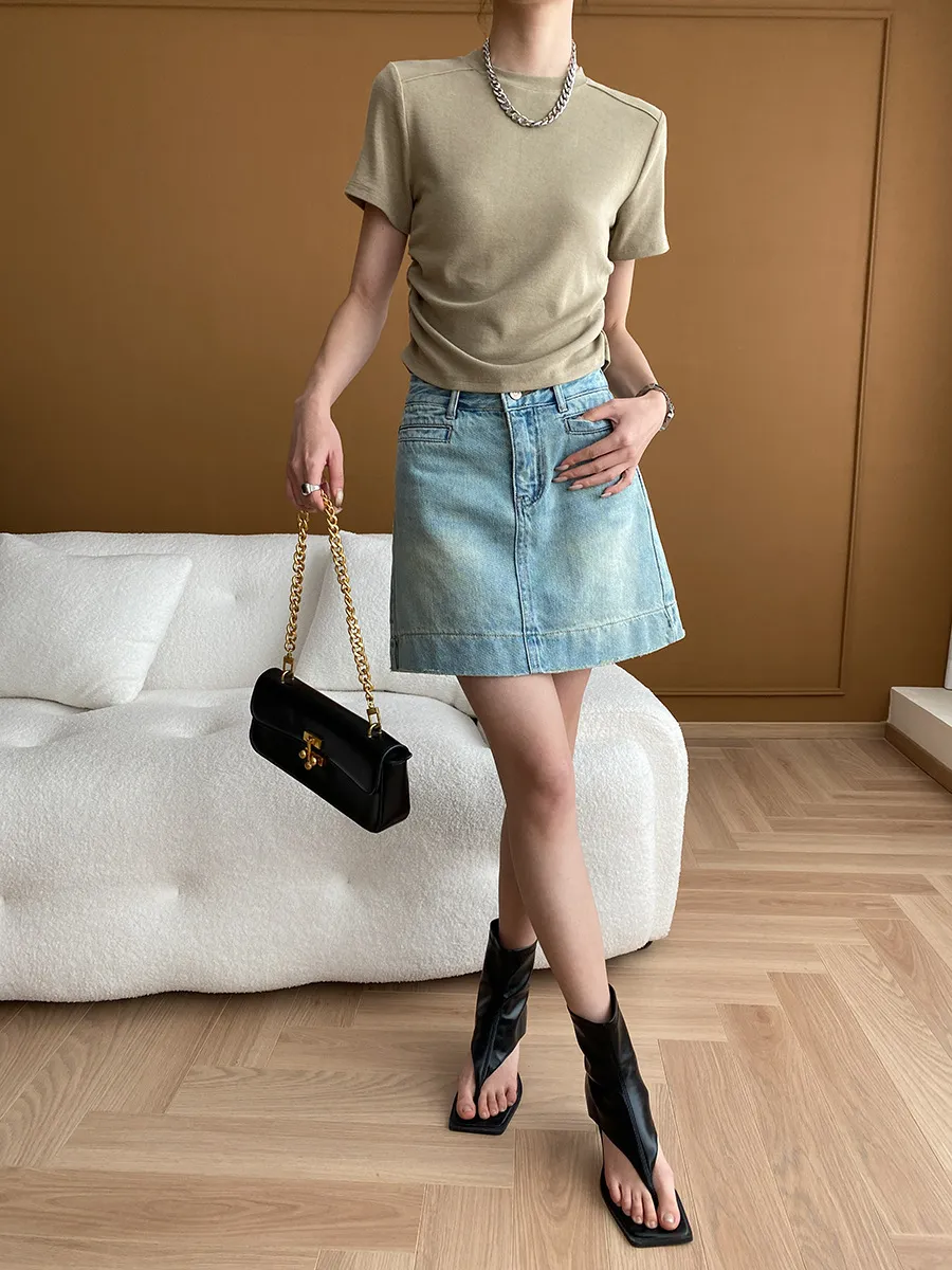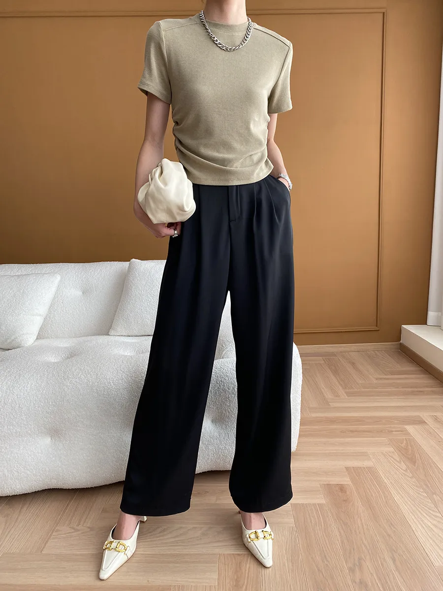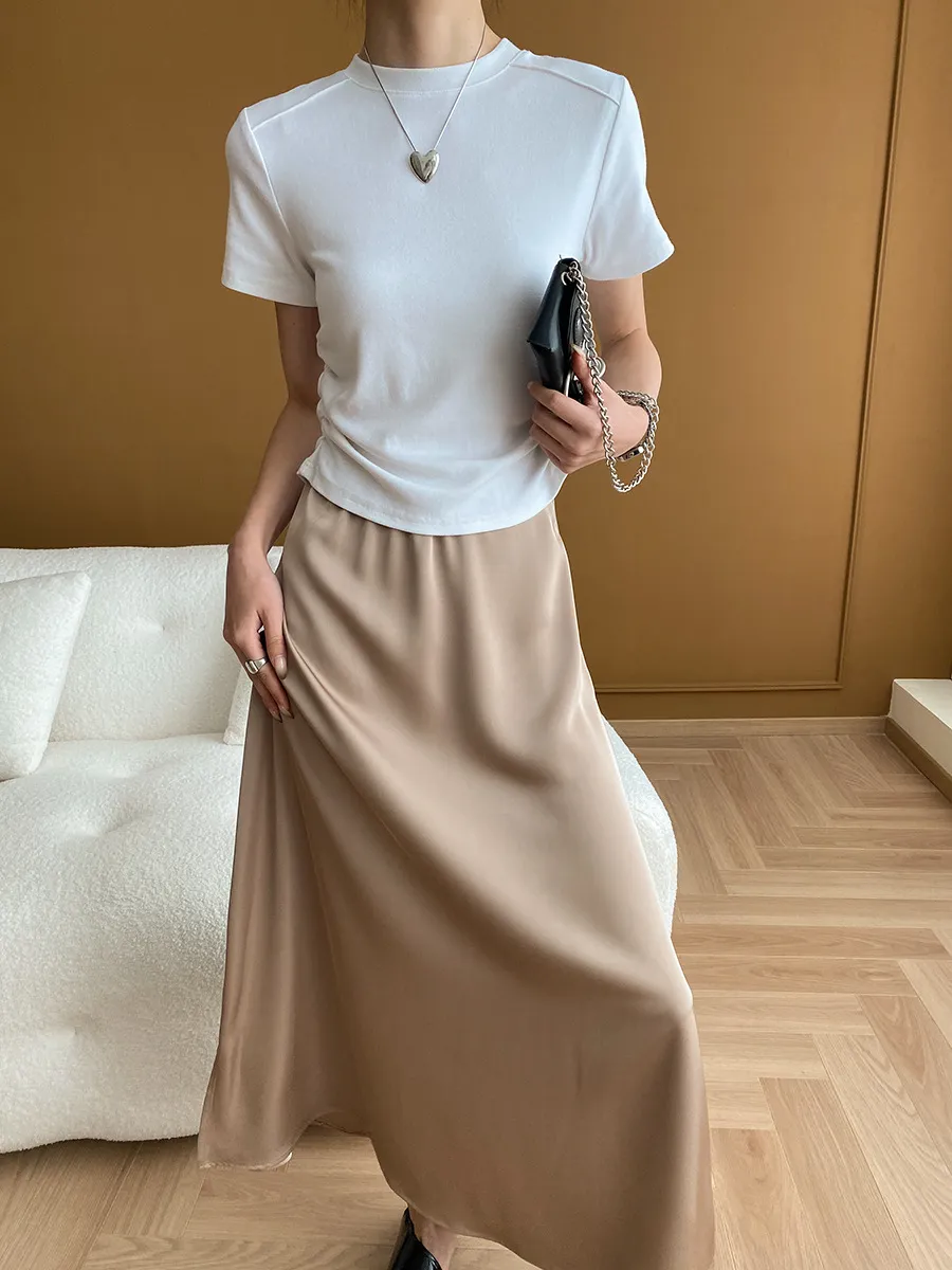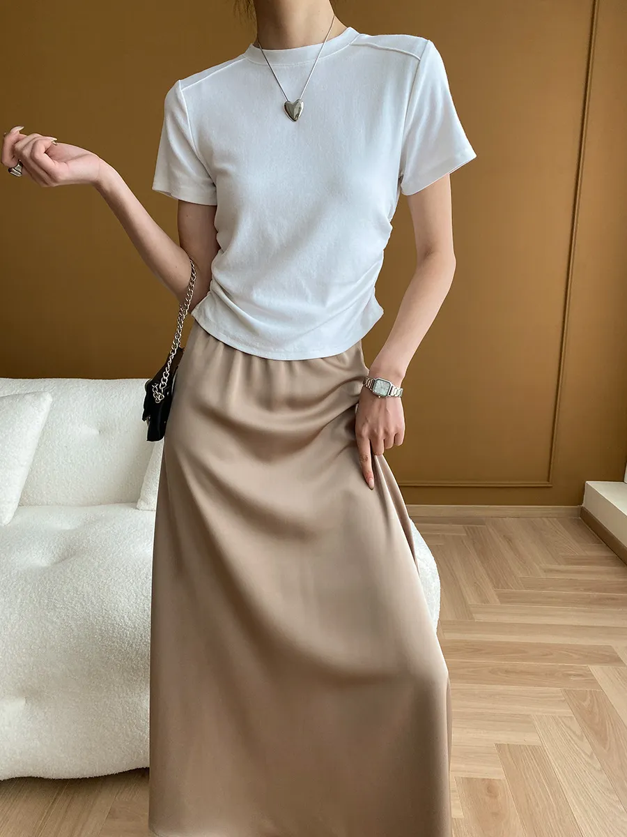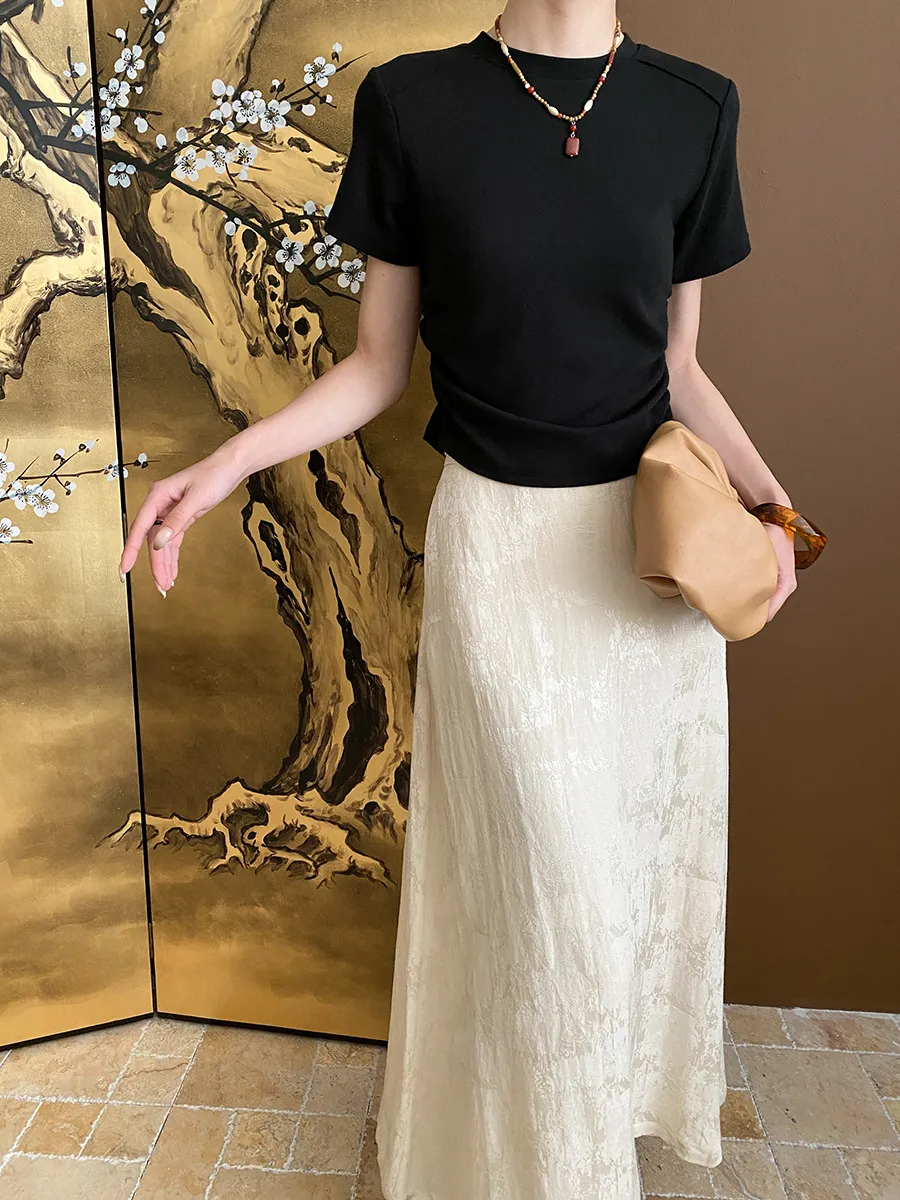 立體肩線!小圓領側皺收腰棉Tee 4色