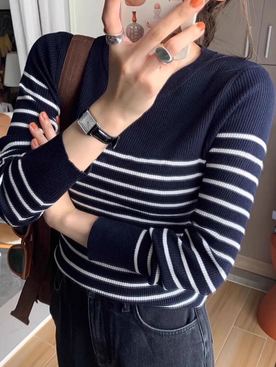 TF240903 小編直播搭配款歐膩圓領條紋彈力針織上衣 藍