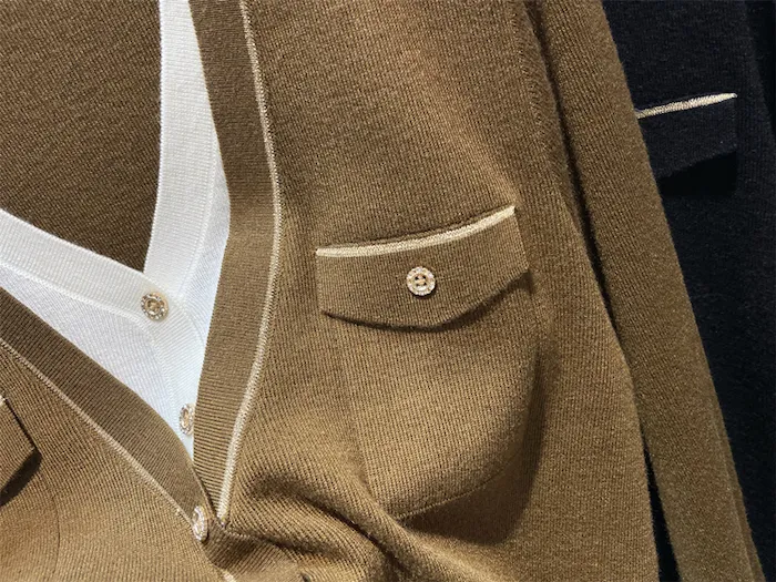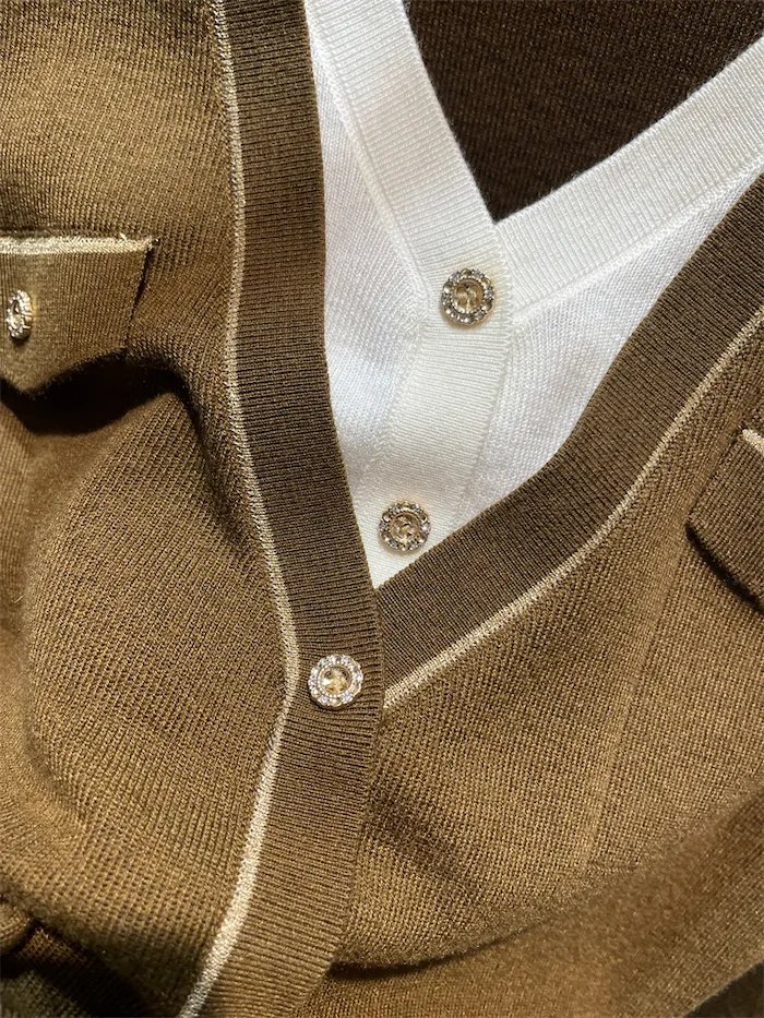 V領剪裁與金色鑲鑽釦飾,讓整體更顯質感