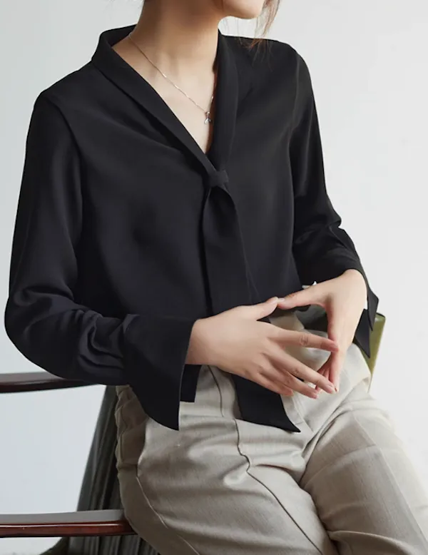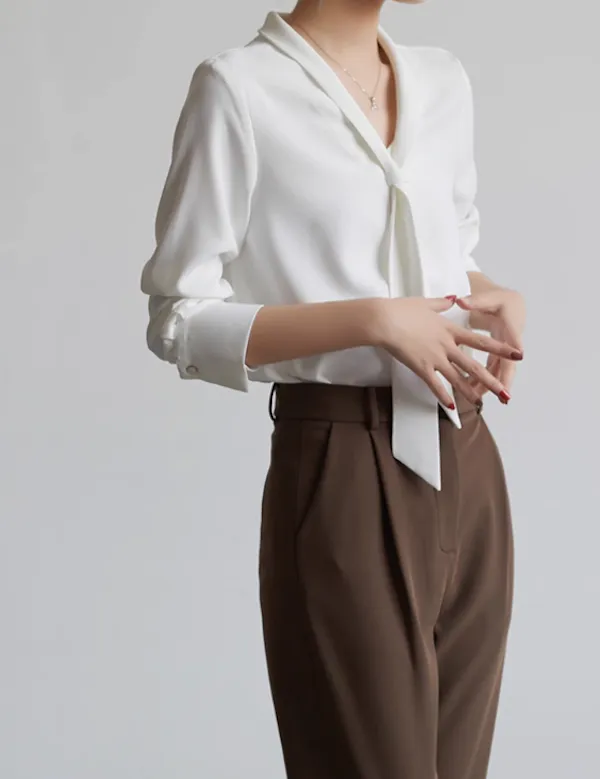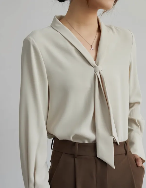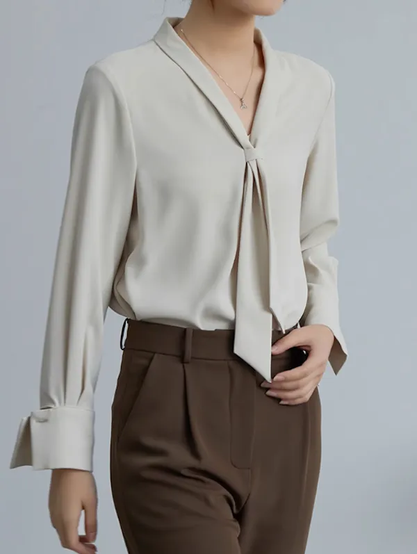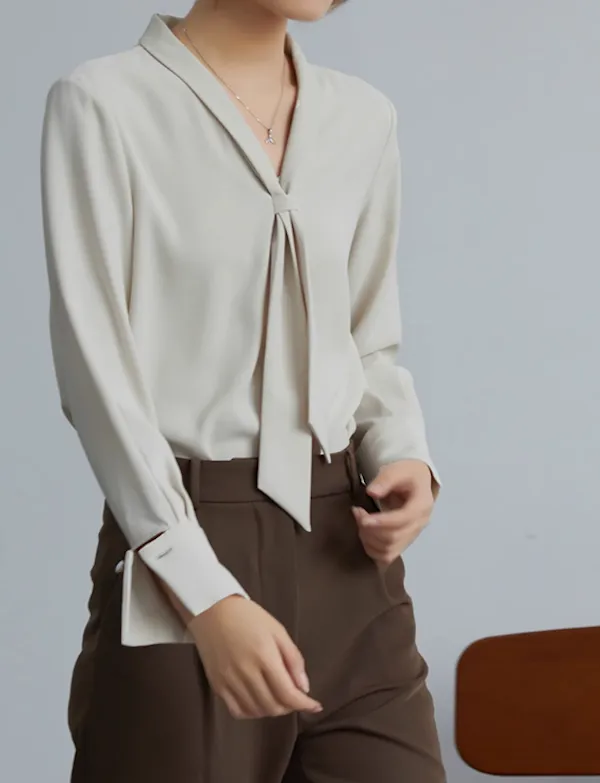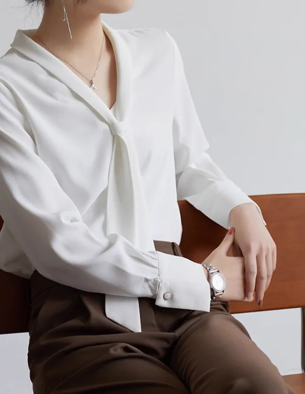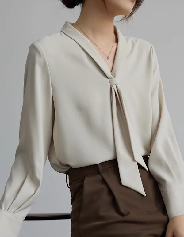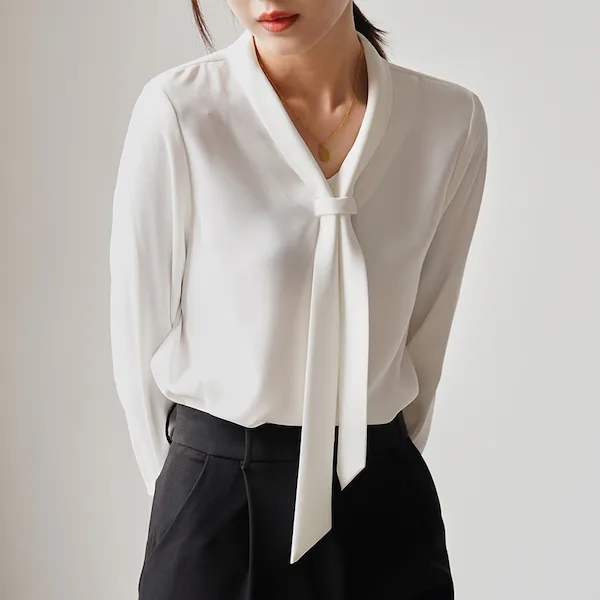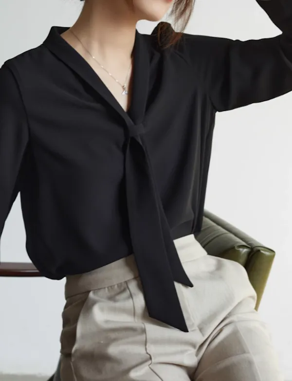 咖啡時光.輕奢飄帶V領氣質雪紡襯衫 3色