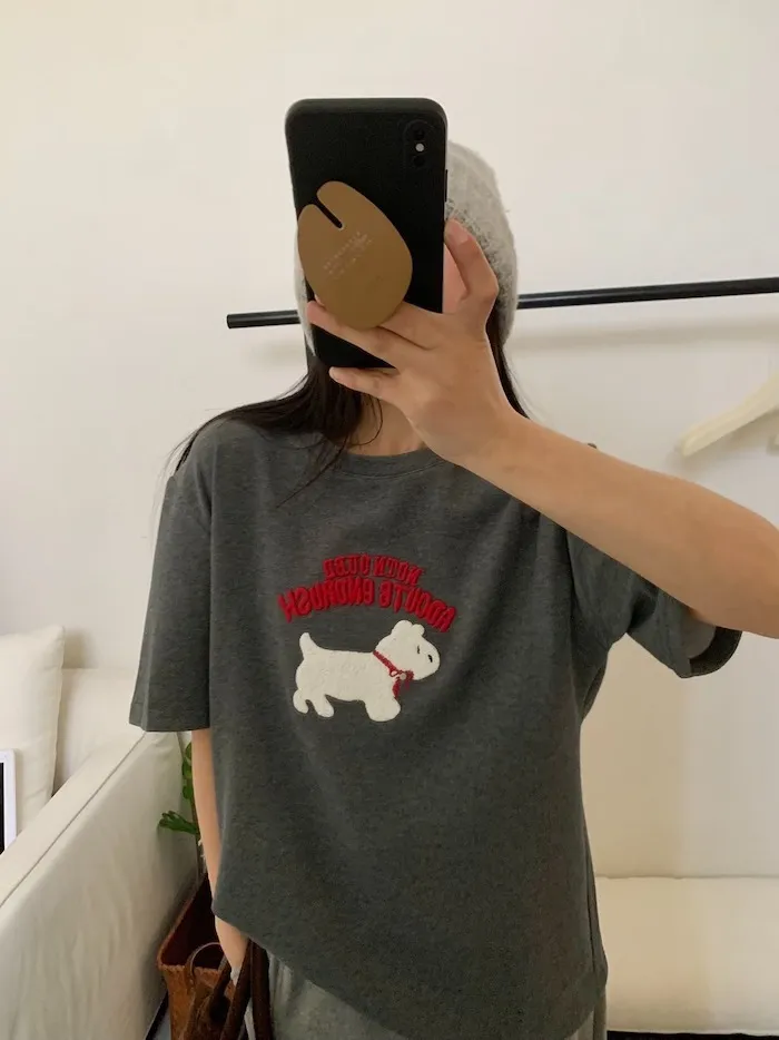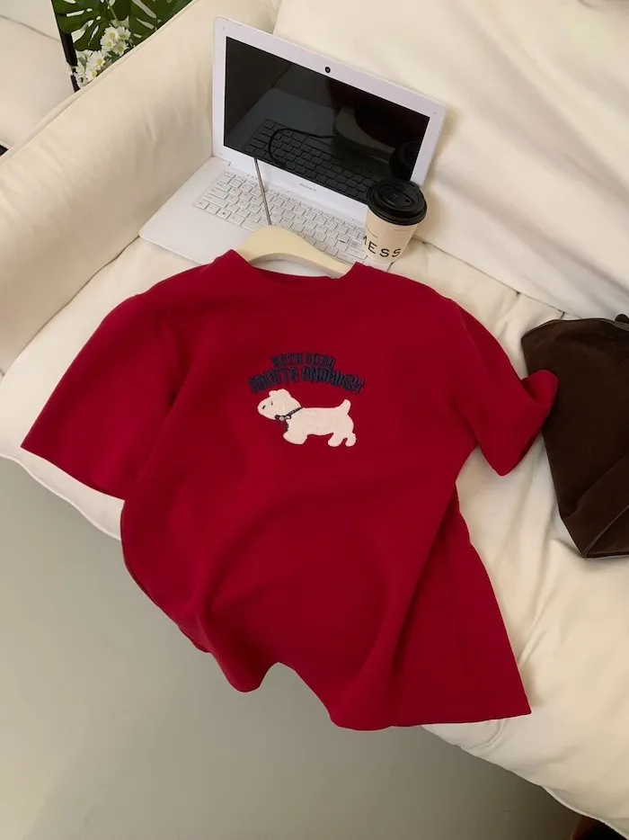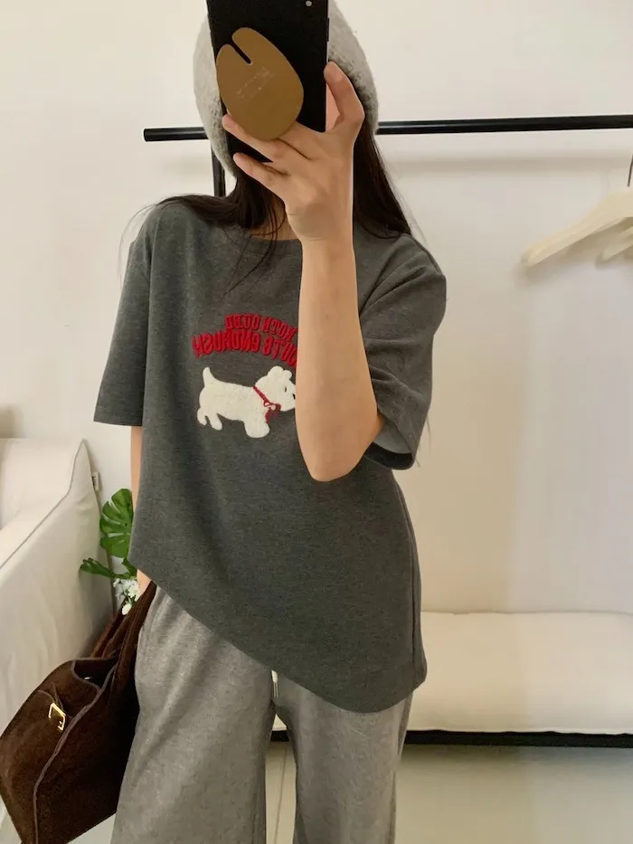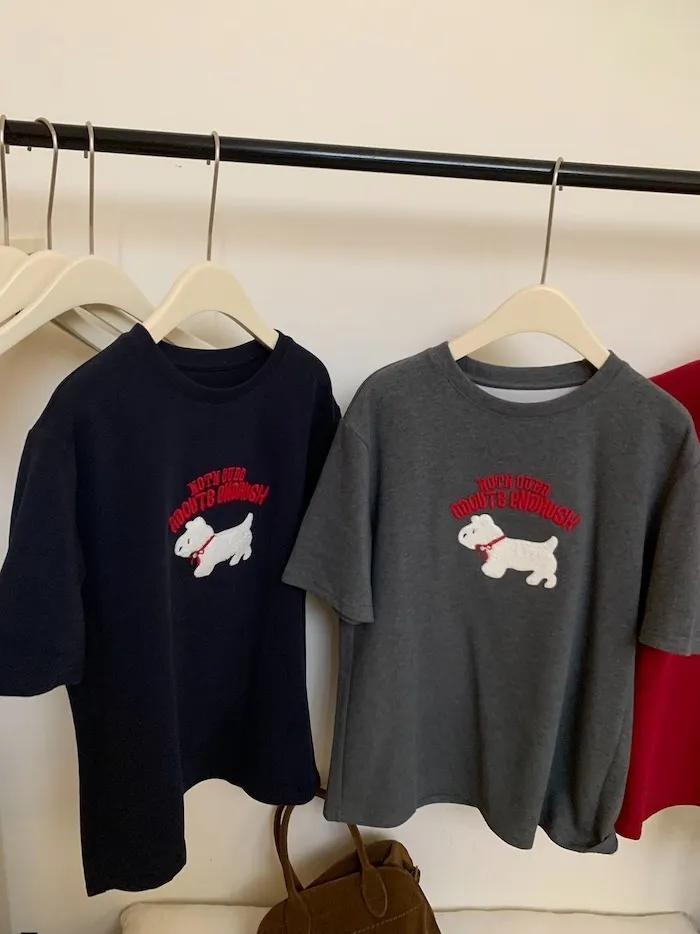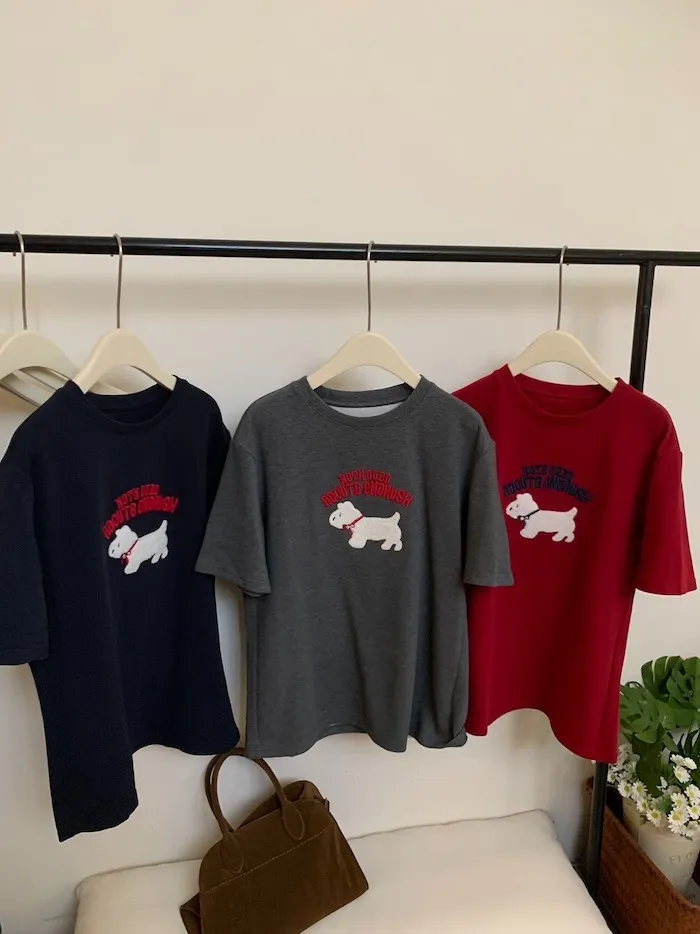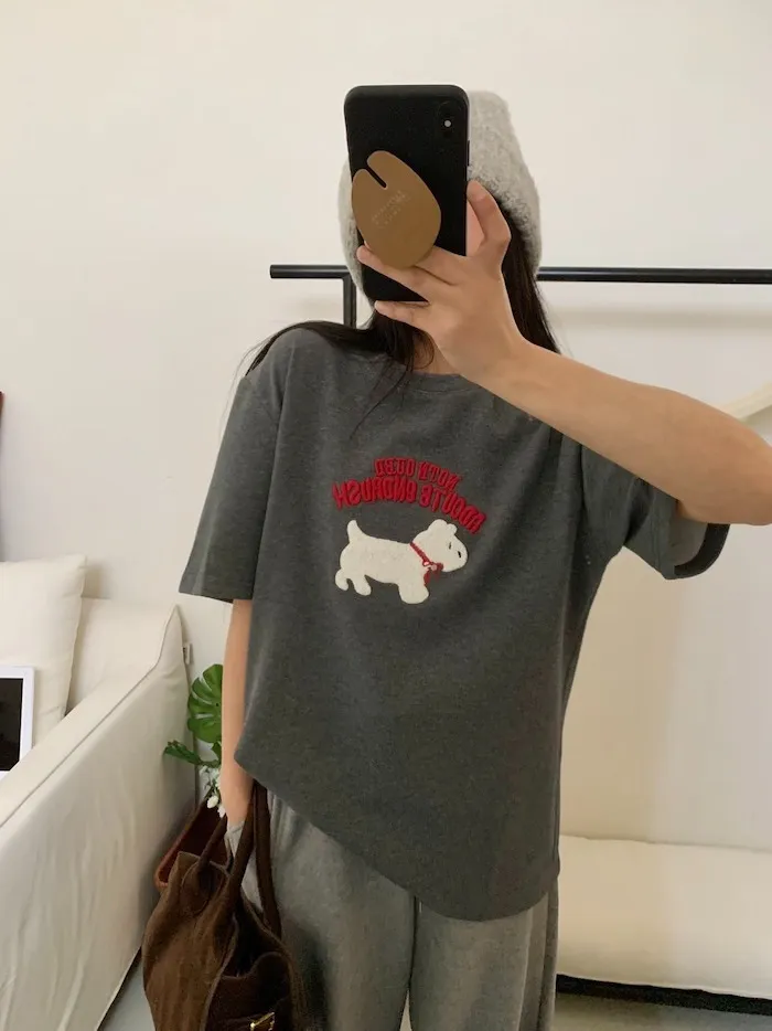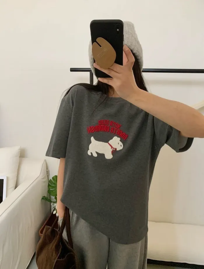 微笑小狗刺繡隨性慵懶短袖上衣 3色
