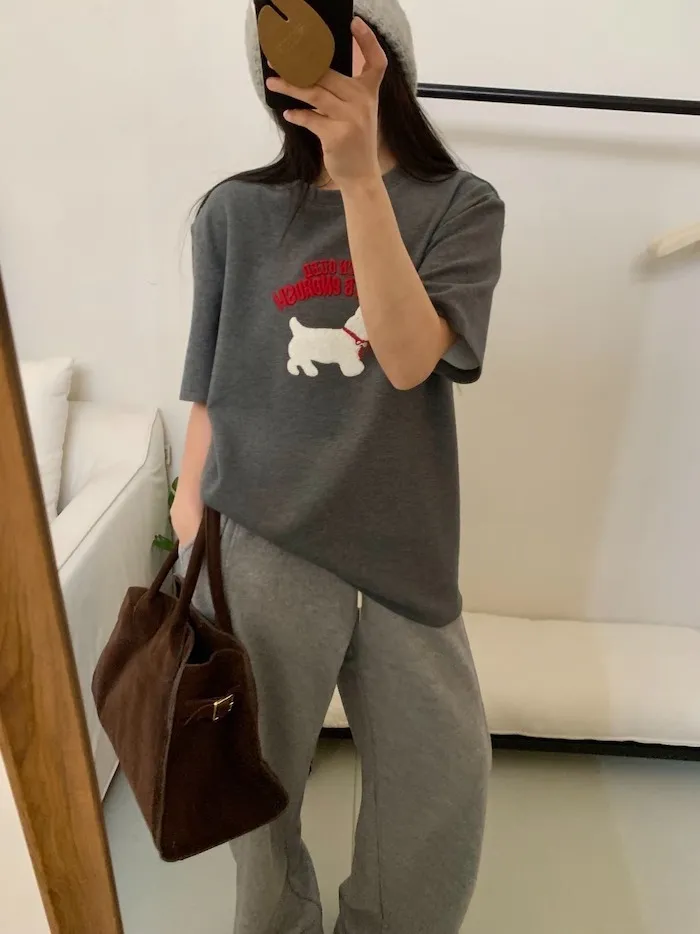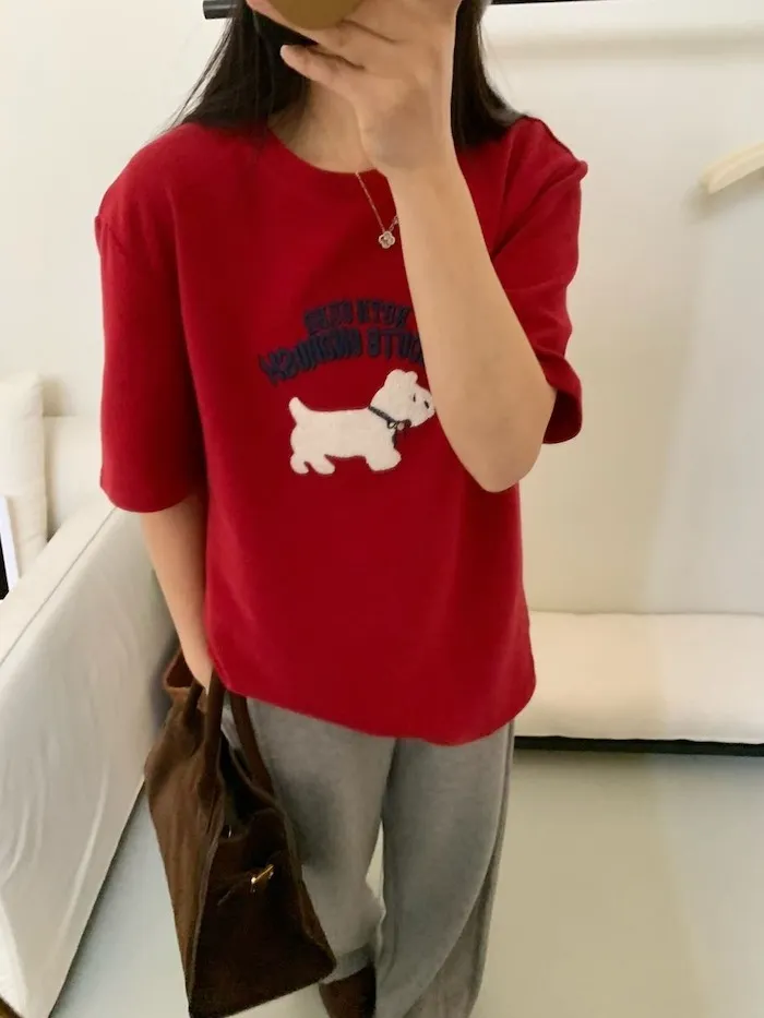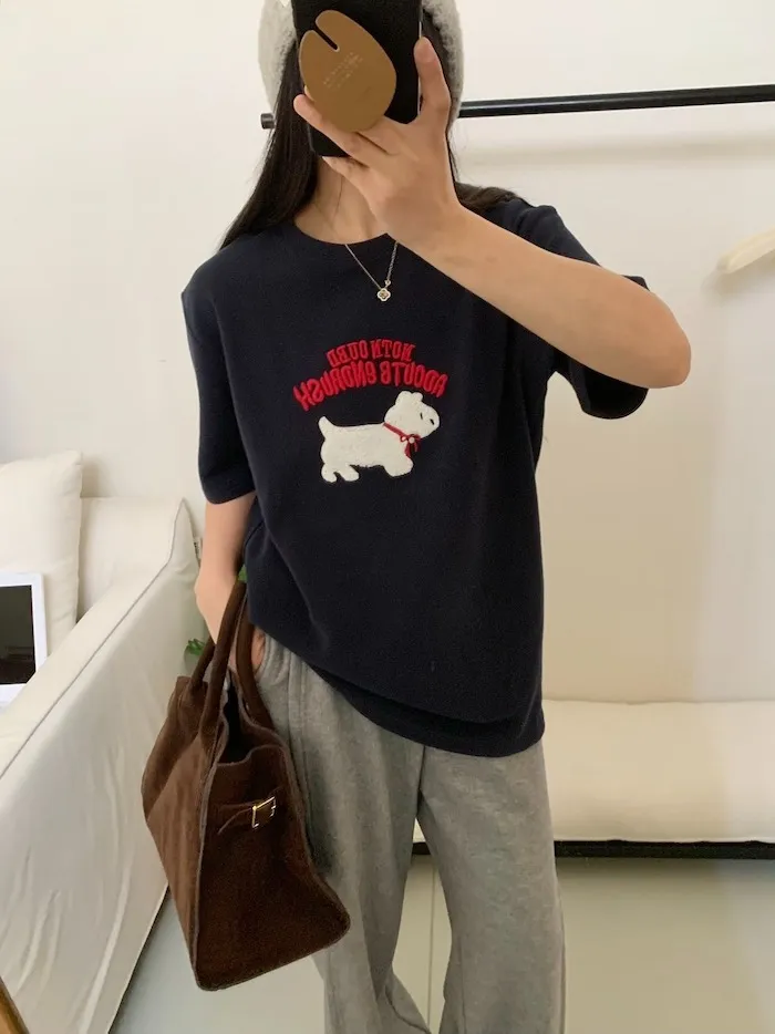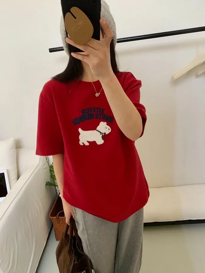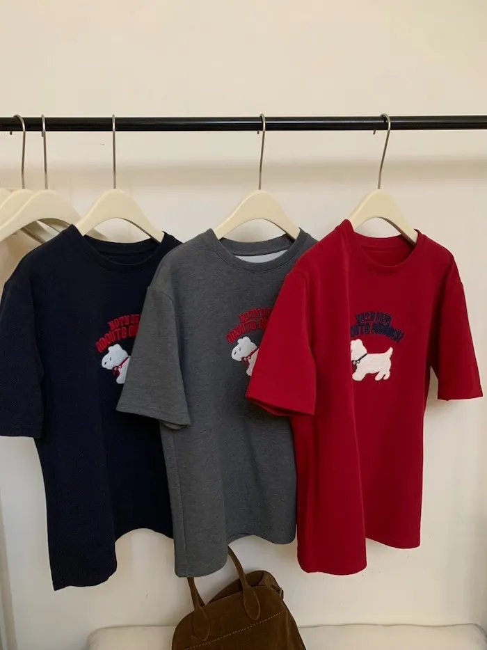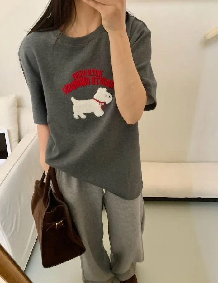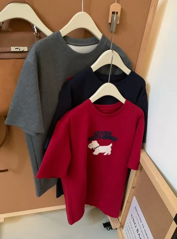 微笑小狗刺繡隨性慵懶短袖上衣 3色