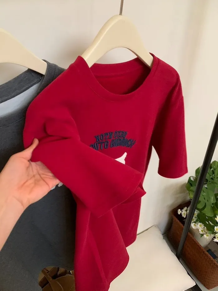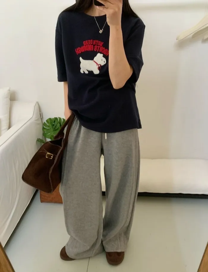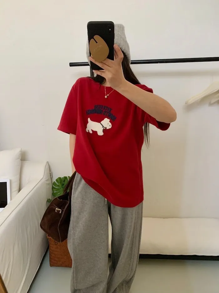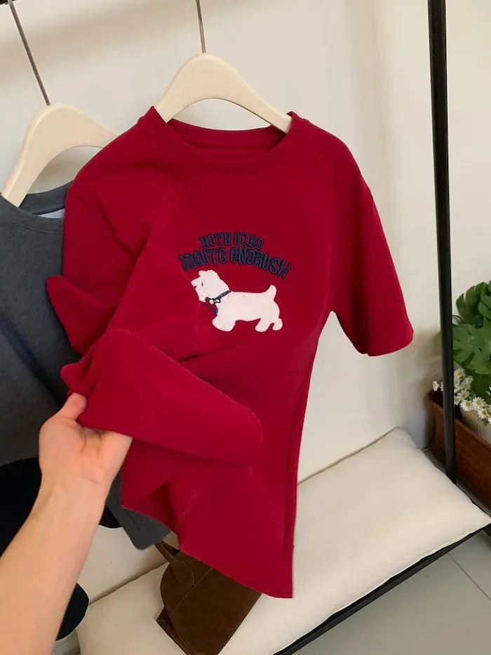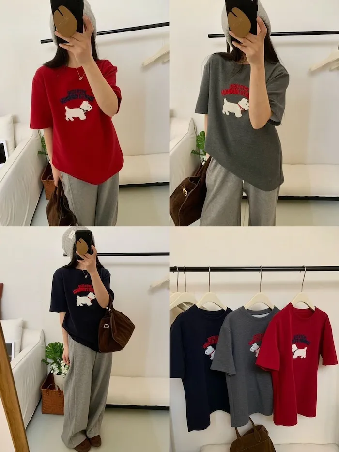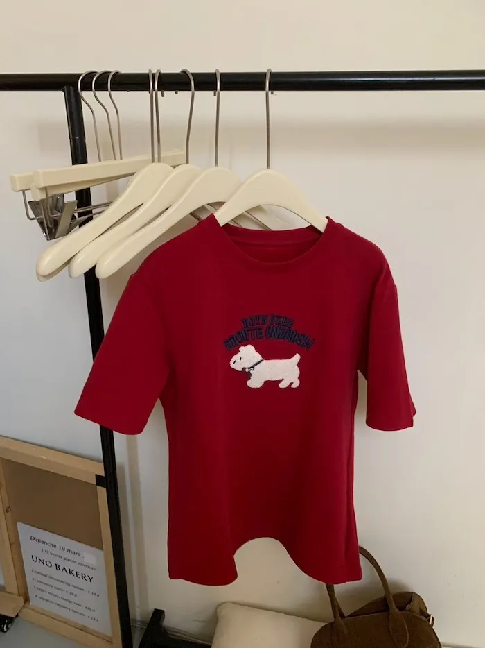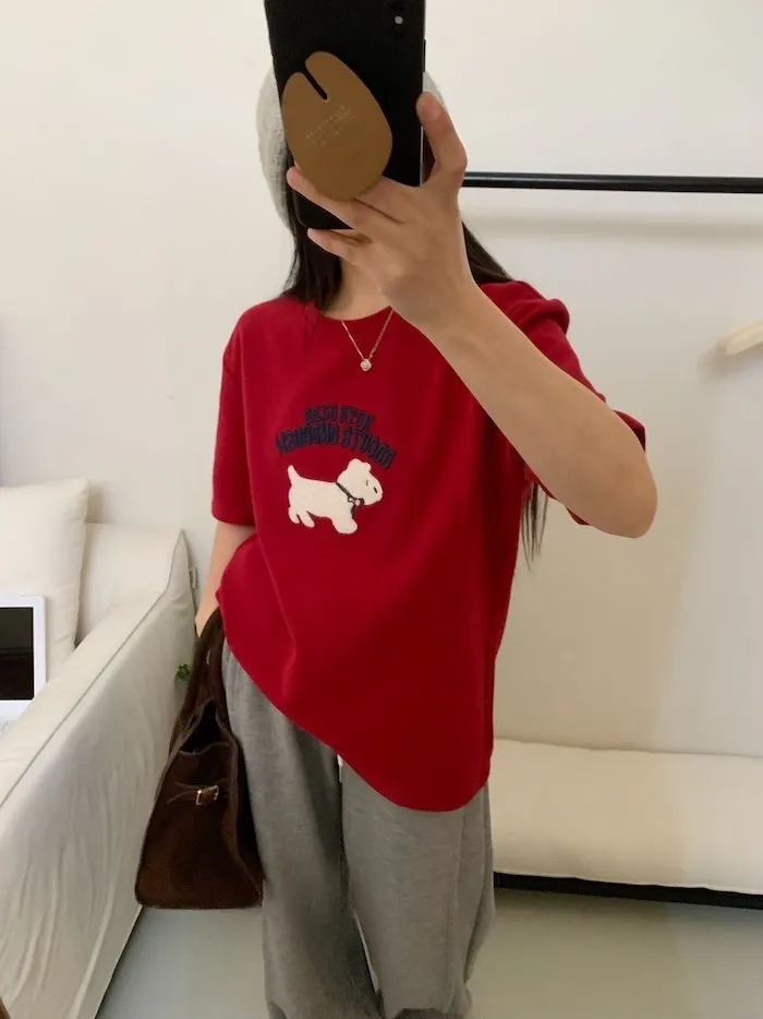 微笑小狗刺繡隨性慵懶短袖上衣 3色