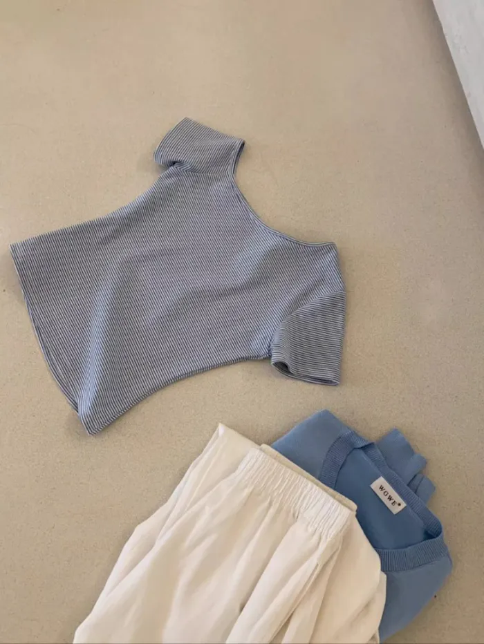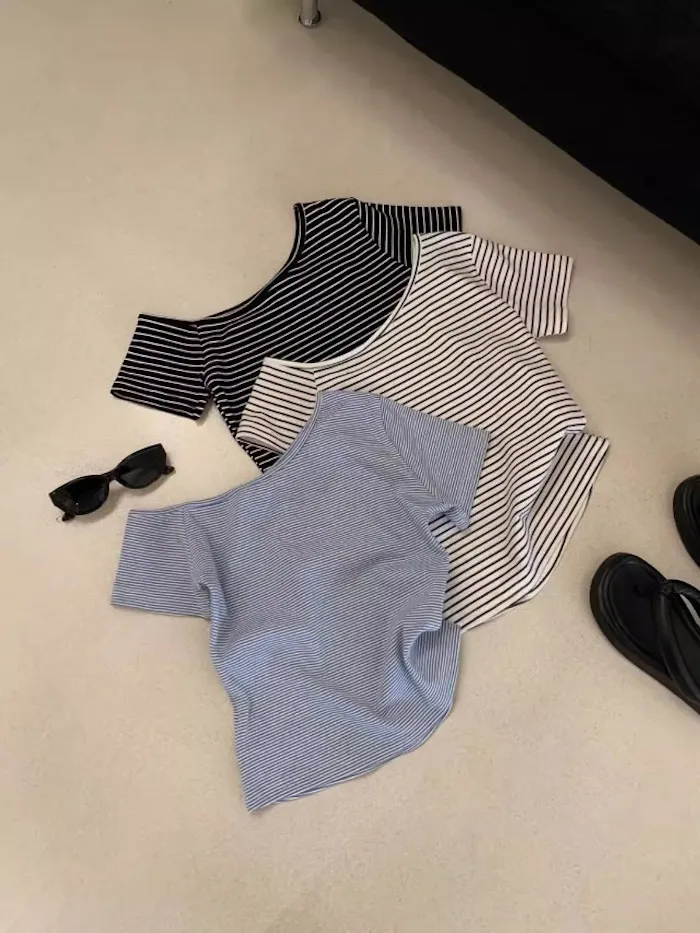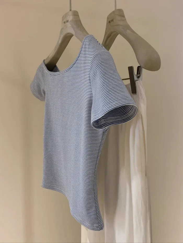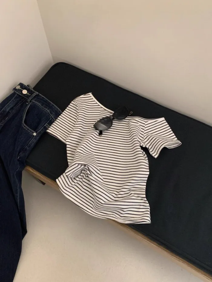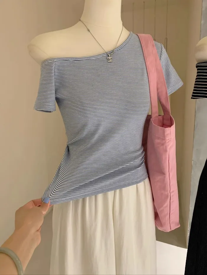 海島假期.慵懶斜肩條紋短袖T恤 3色