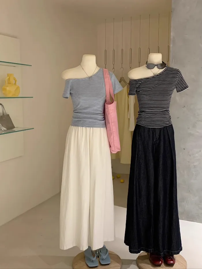 隨性斜肩設計展現鎖骨線條,一側露肩引人遐想