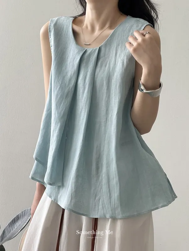 漫步雲間 亞麻褶皺無袖娃娃衫 2色