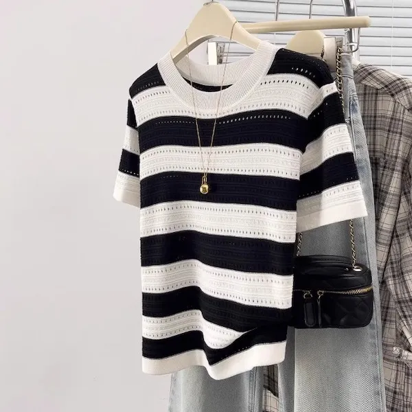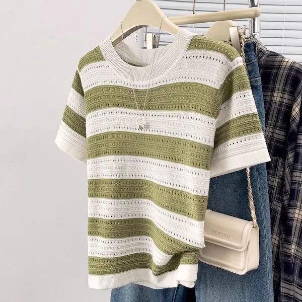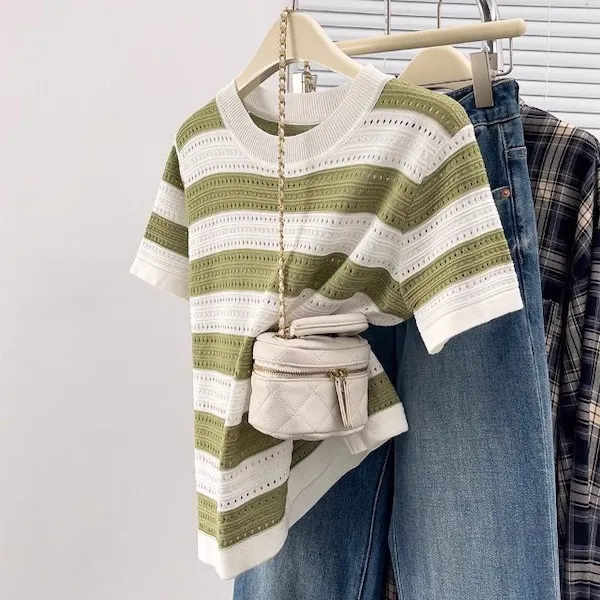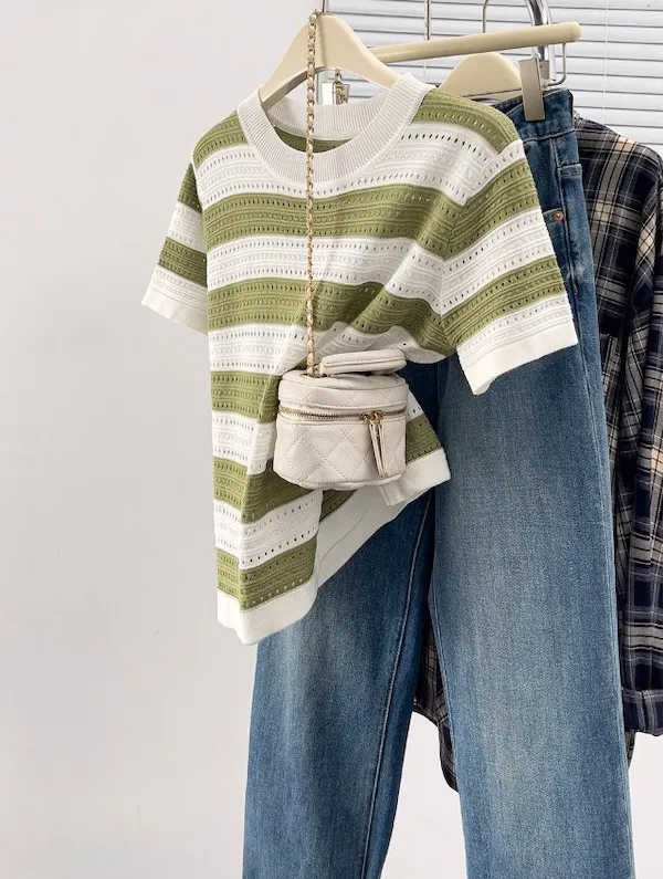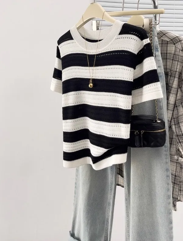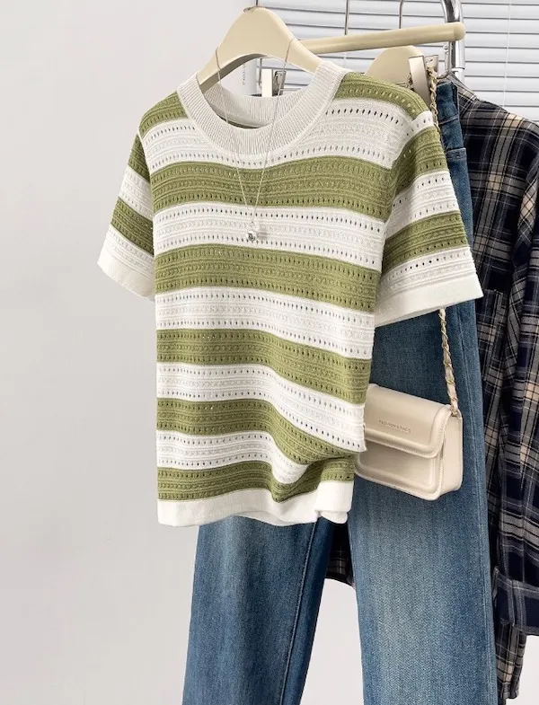 織影交錯 條紋鏤空針織短袖上衣 2色