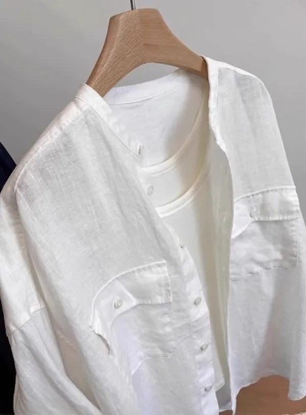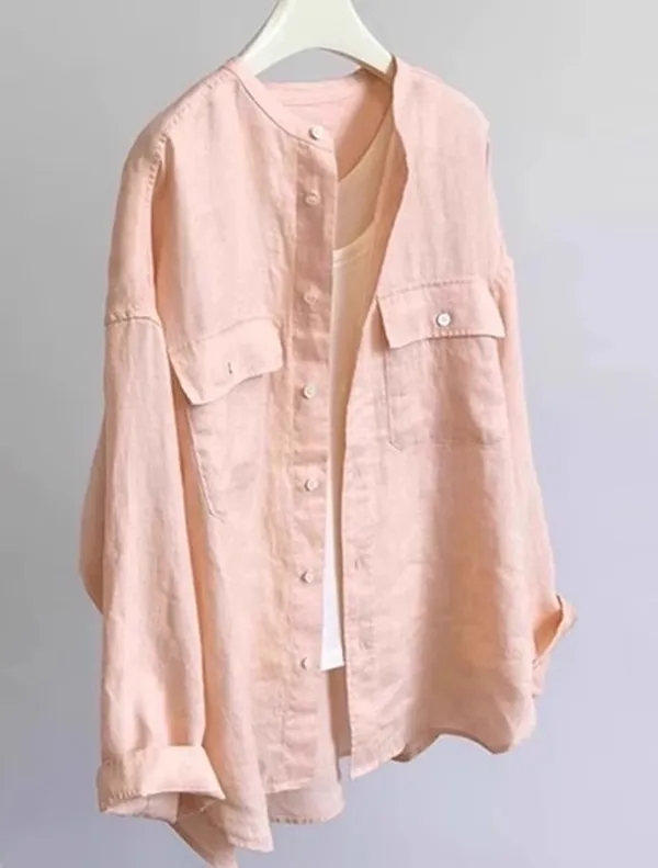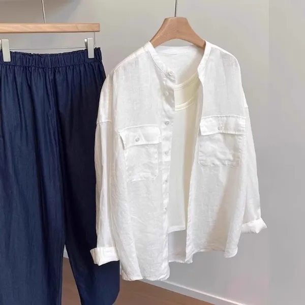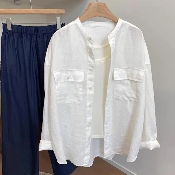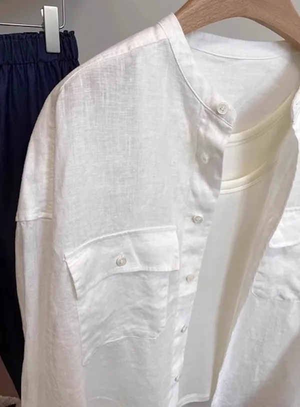 法式慵懶圓領口袋長袖襯衫 2色