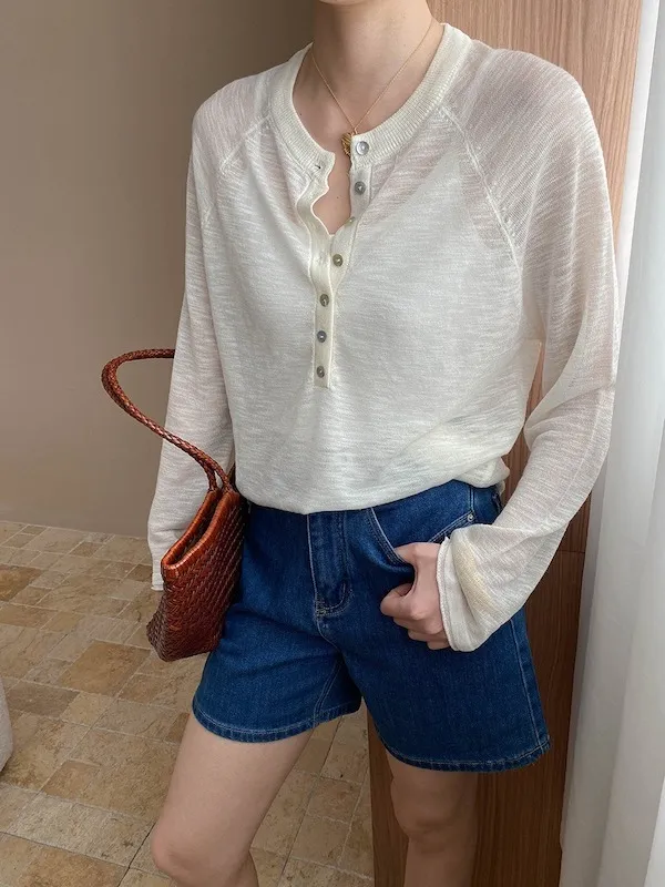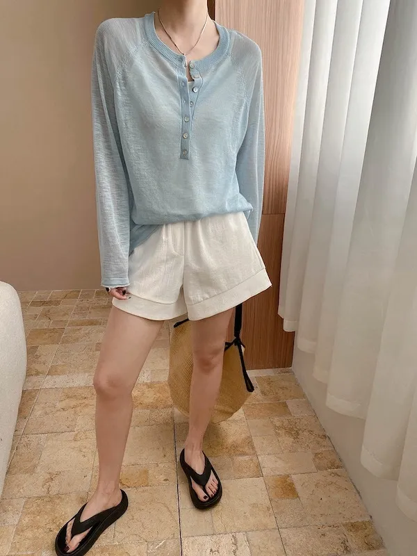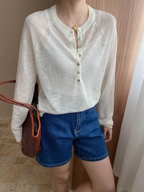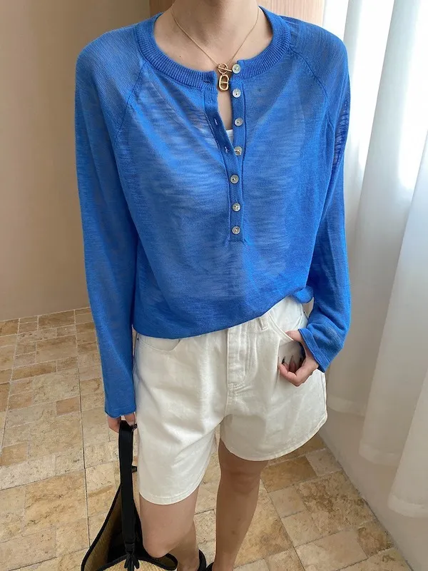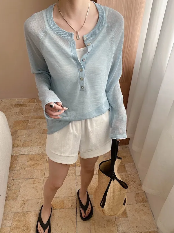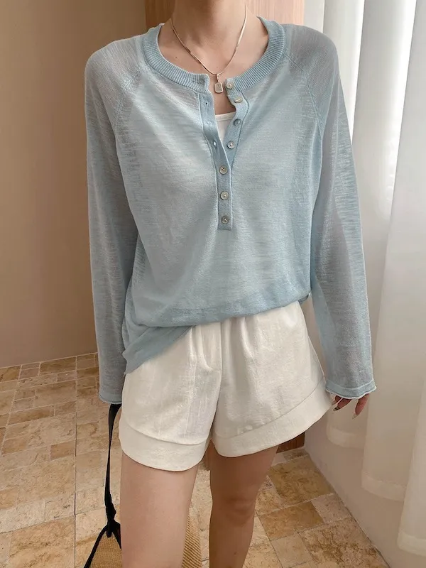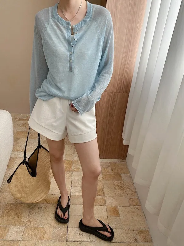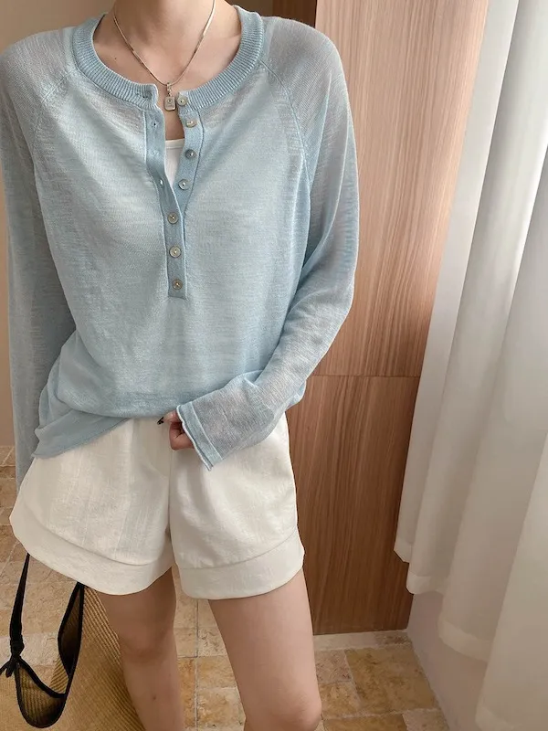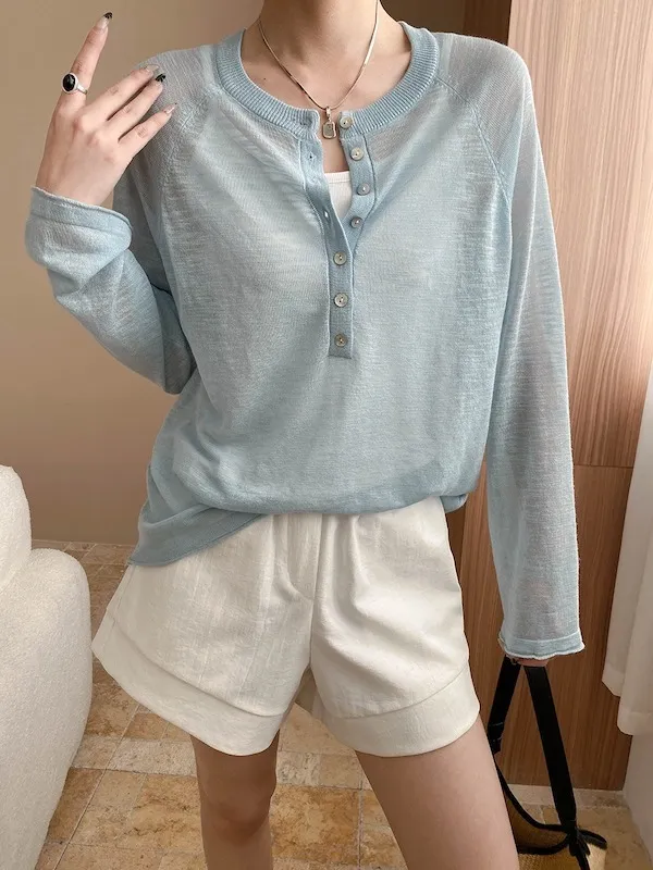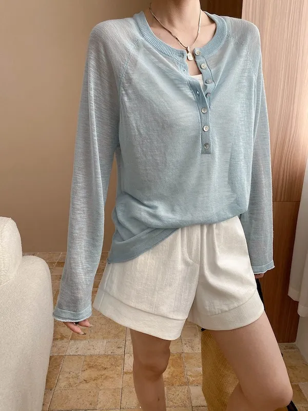 輕氧隨性 冰絲亨利領薄長袖針織衫 5色