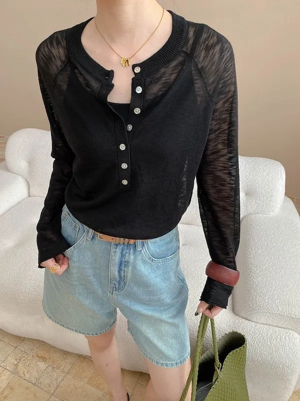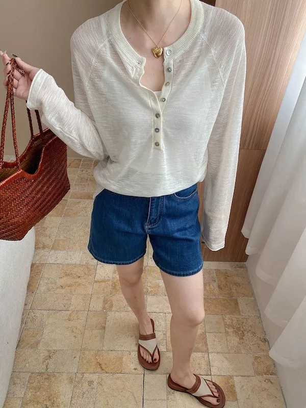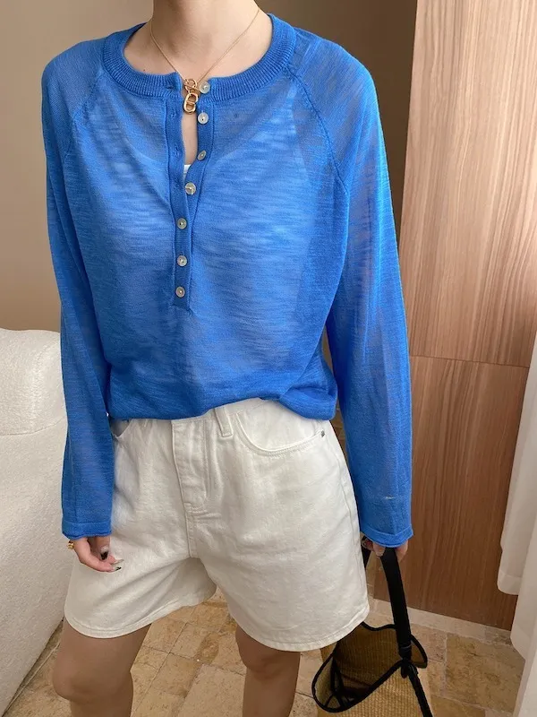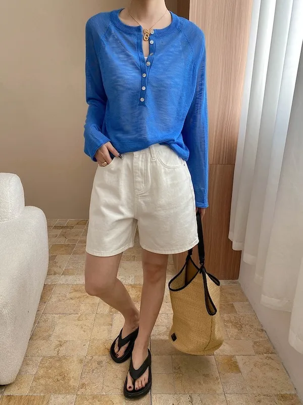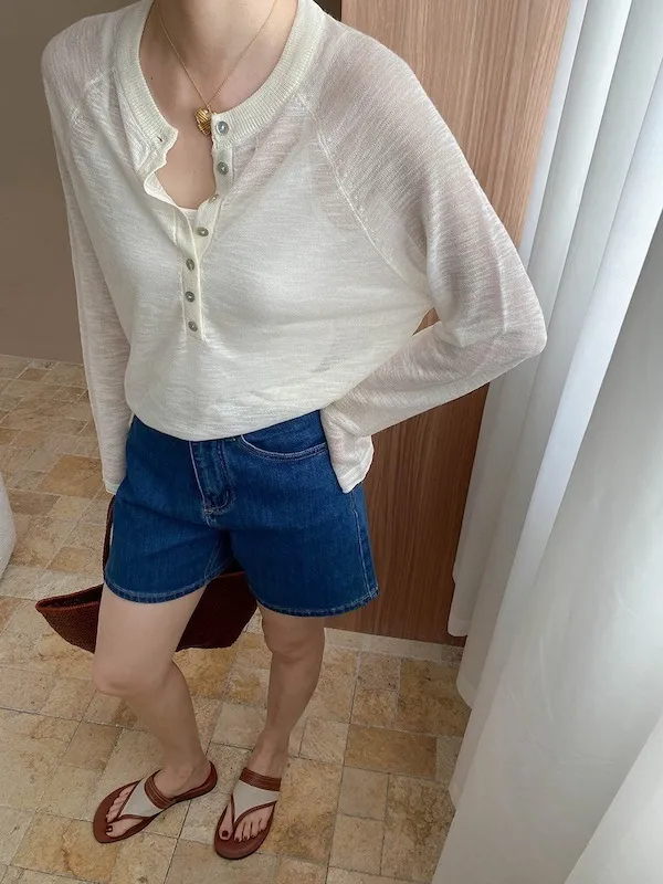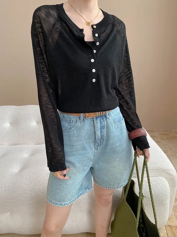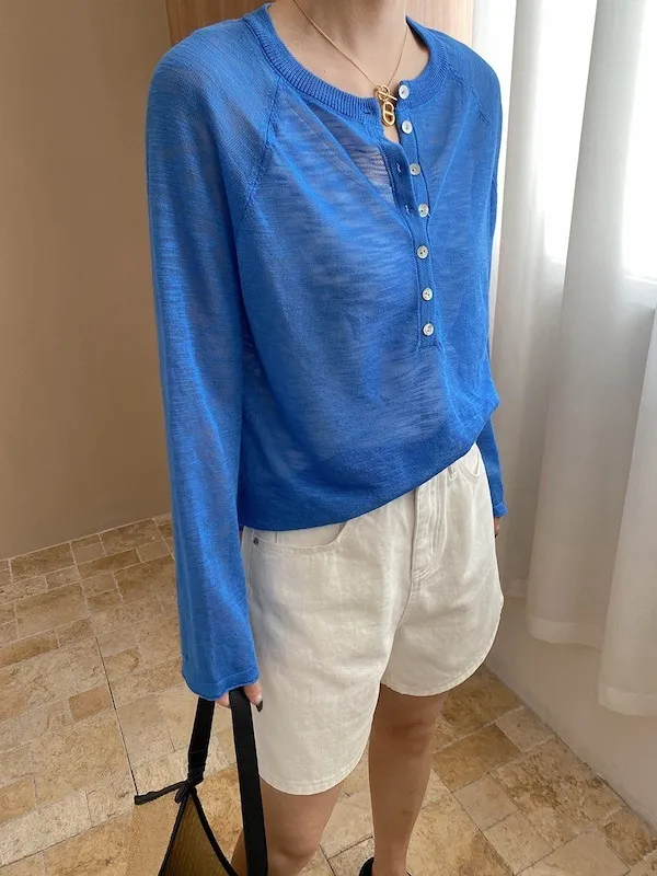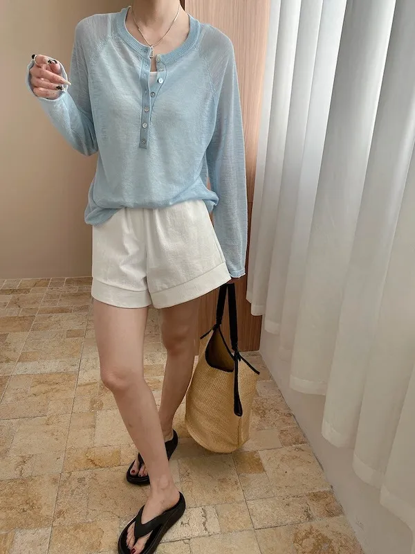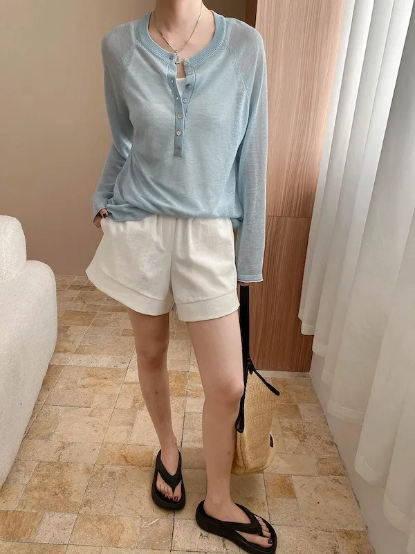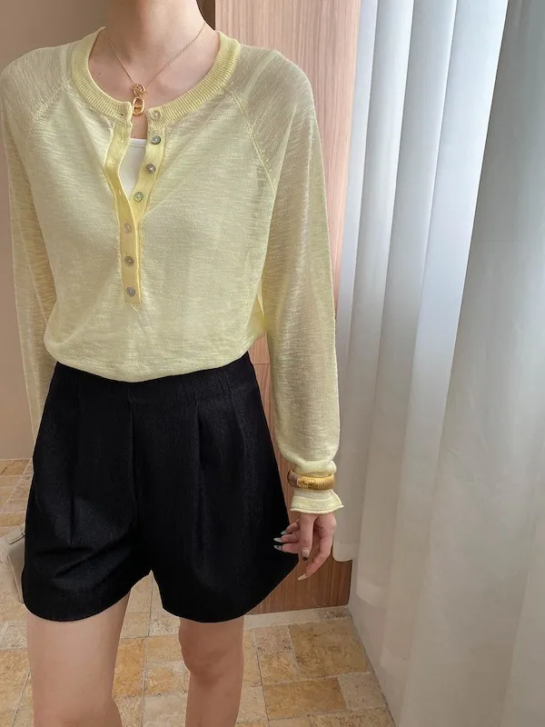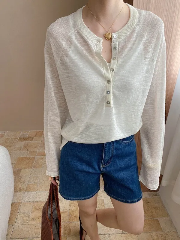 輕氧隨性 冰絲亨利領薄長袖針織衫 5色
