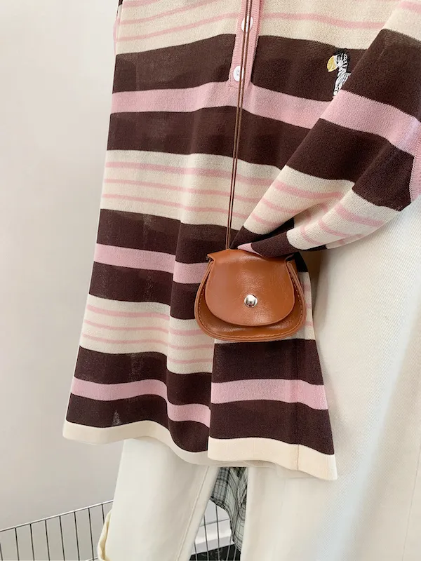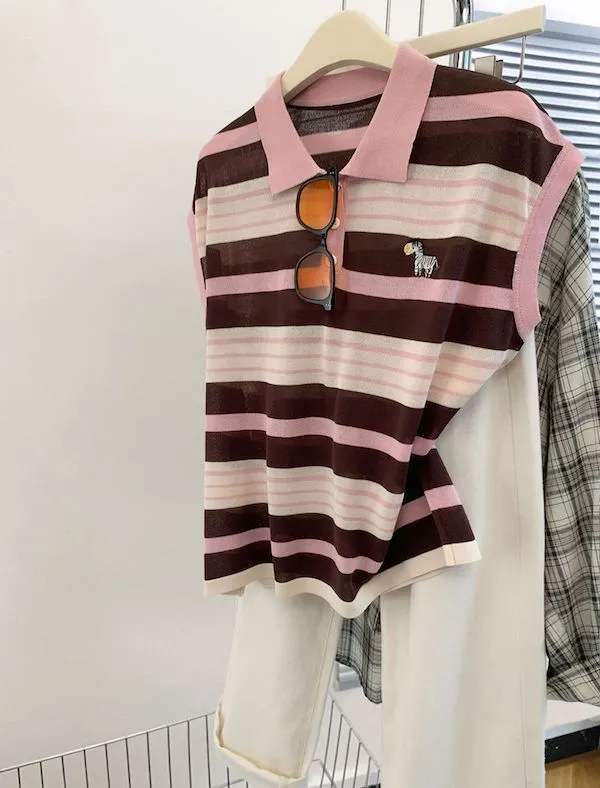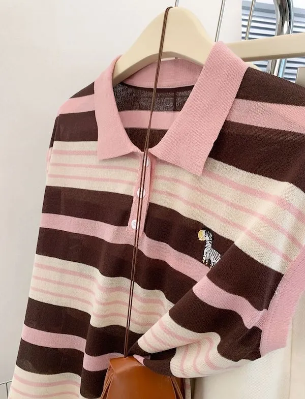 甜美時光 小狗刺繡條紋針織半袖Polo衫