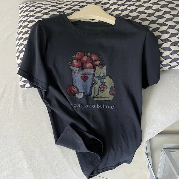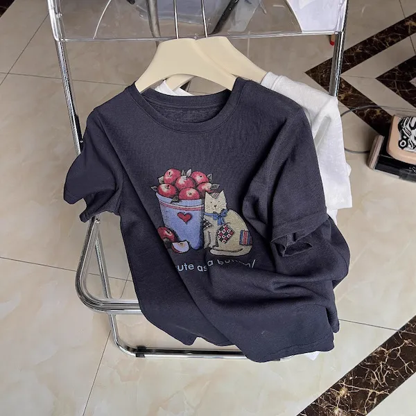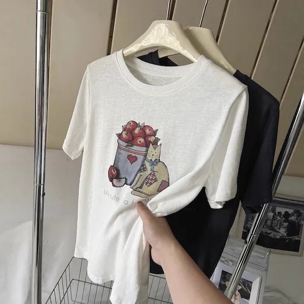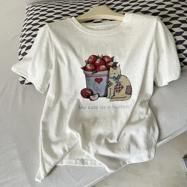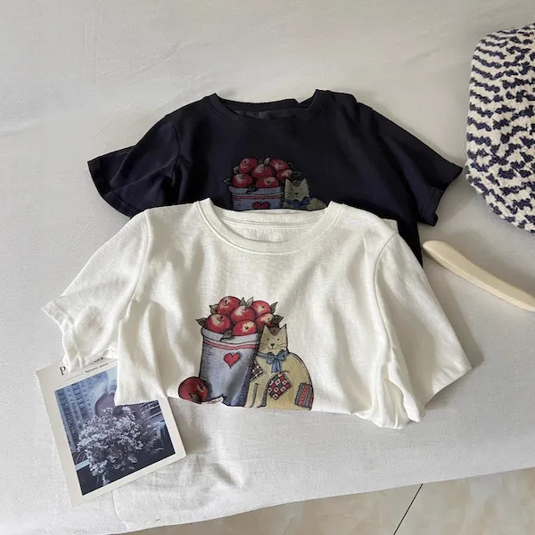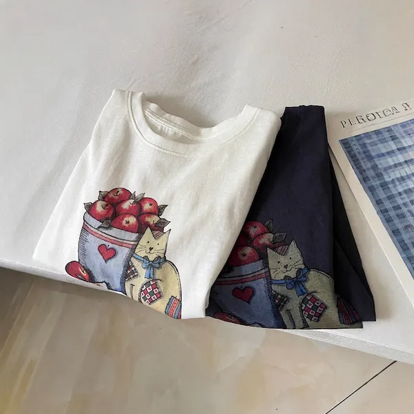甜心午後 貓咪蘋果印花寬鬆T恤 2色