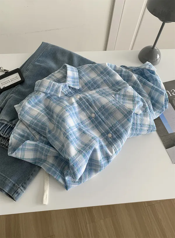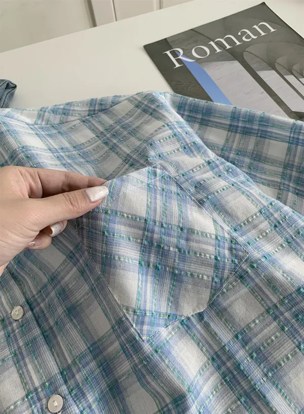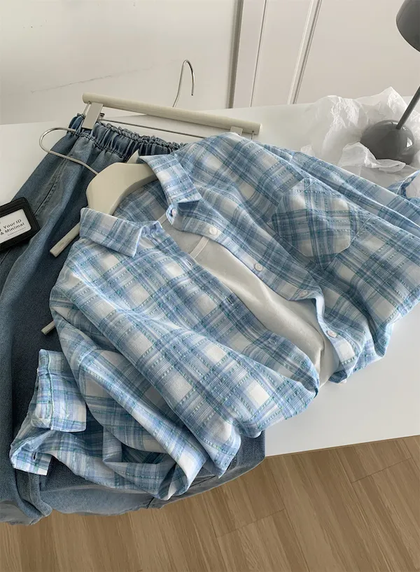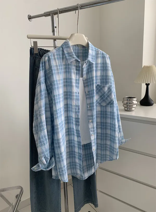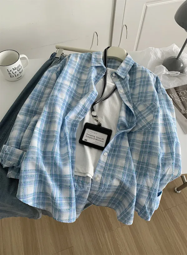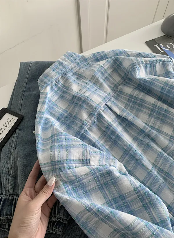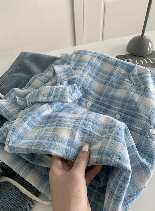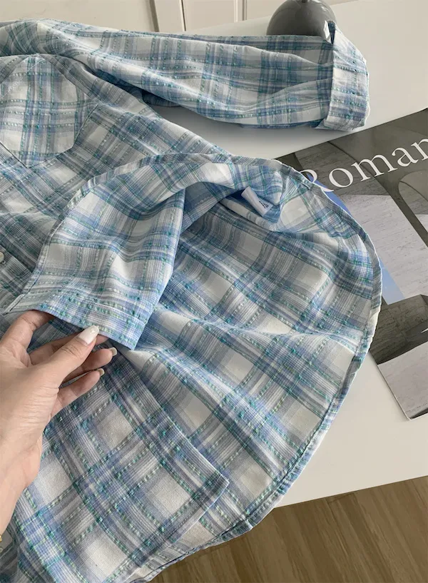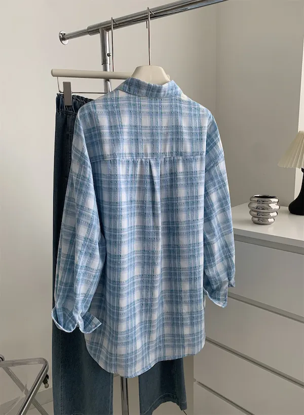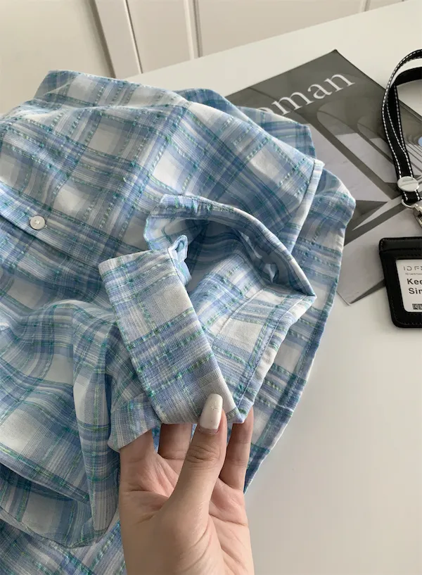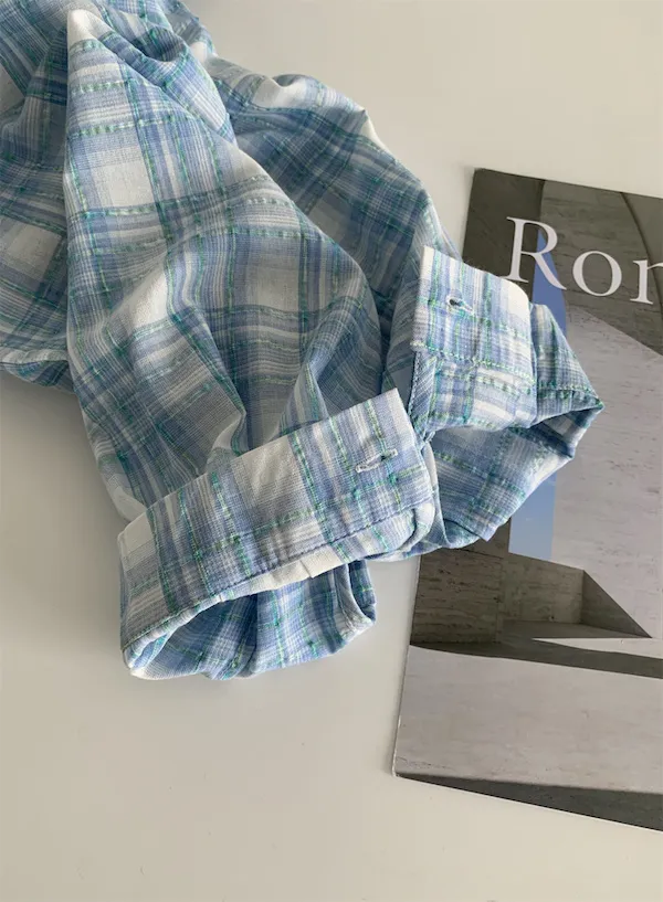 清晨漫步 撞色提花格子薄款長袖襯衫