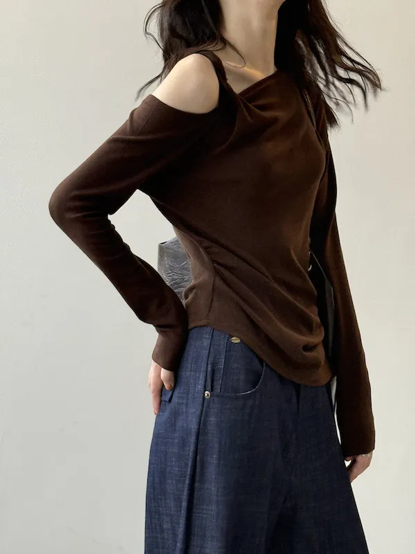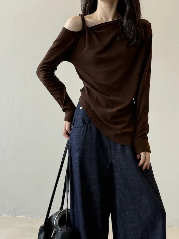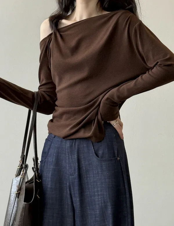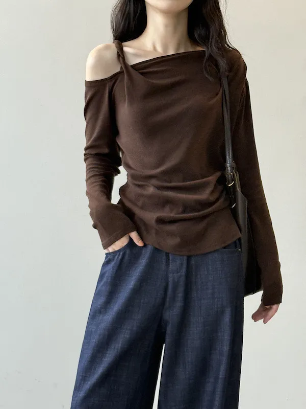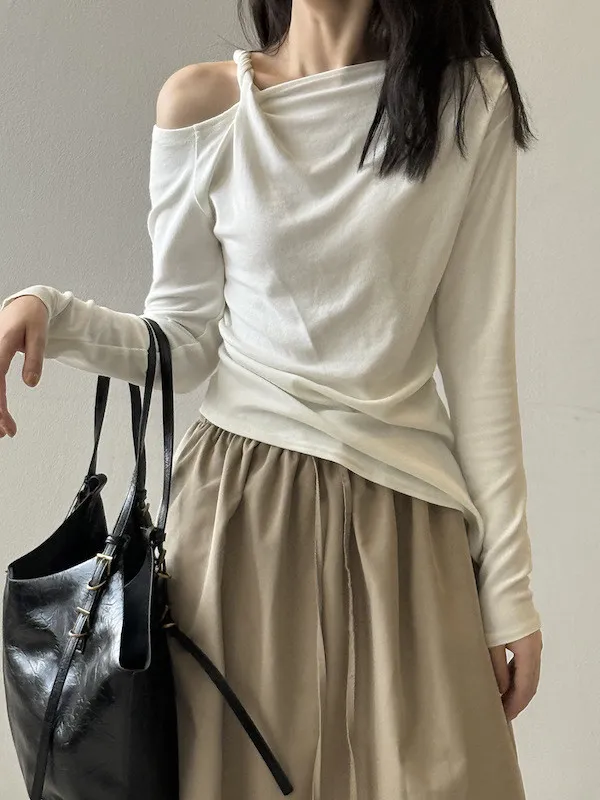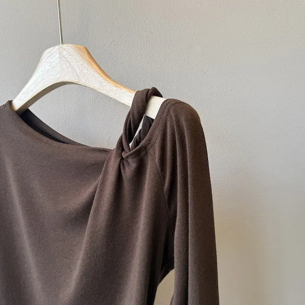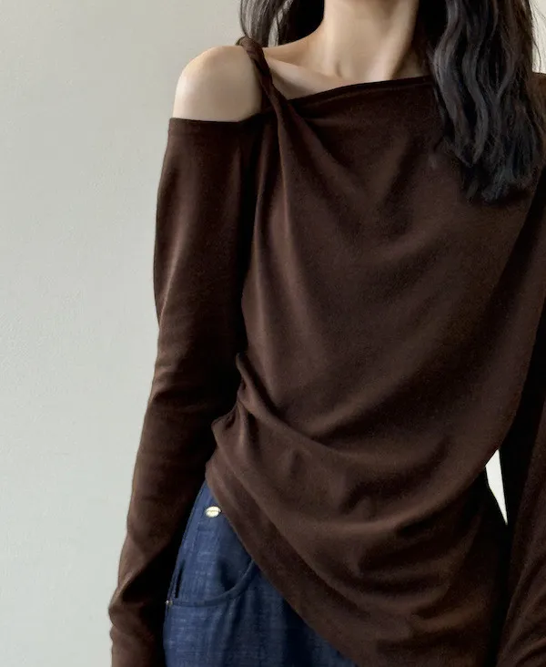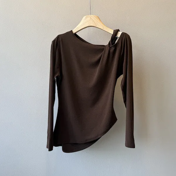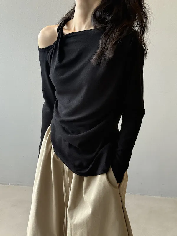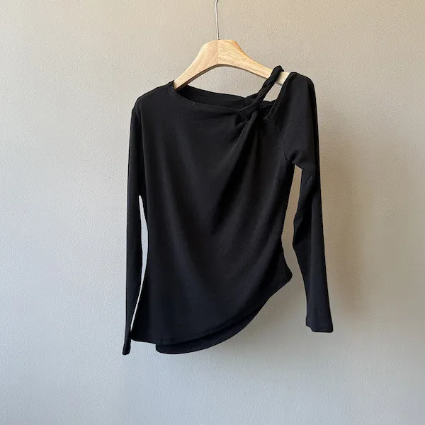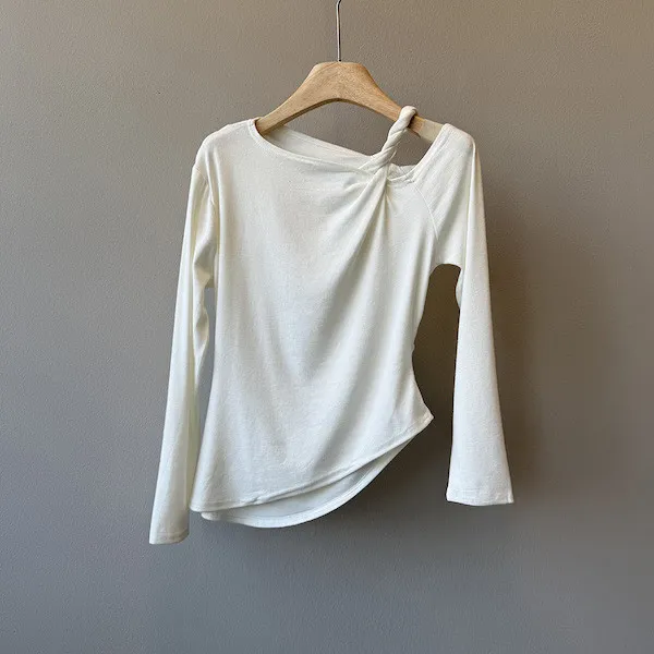 藝術隨想 斜肩扭結不規則長袖上衣 4色