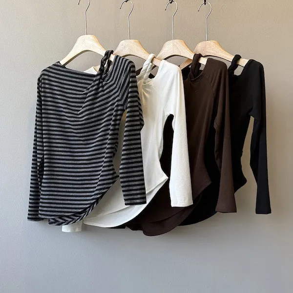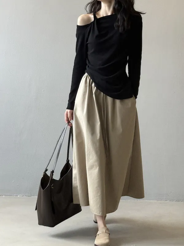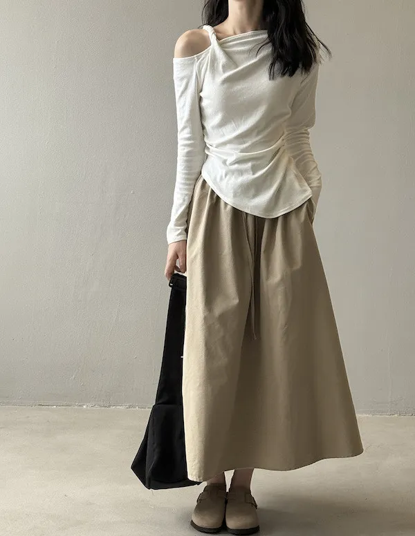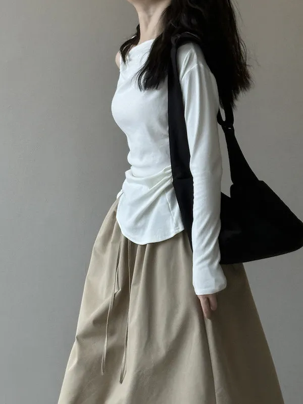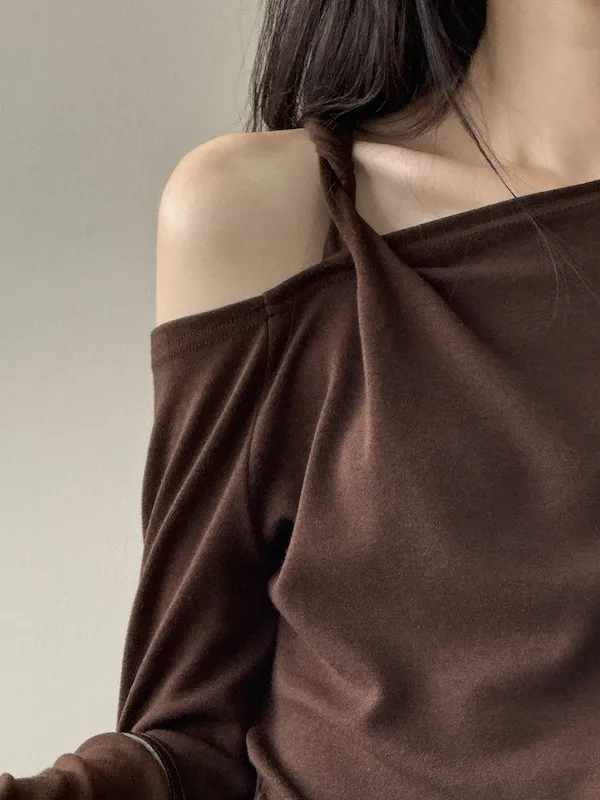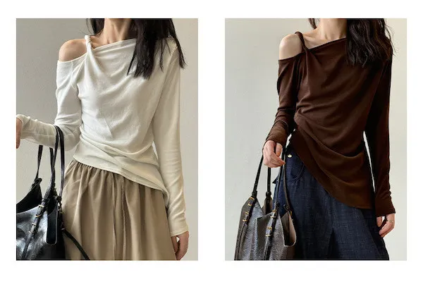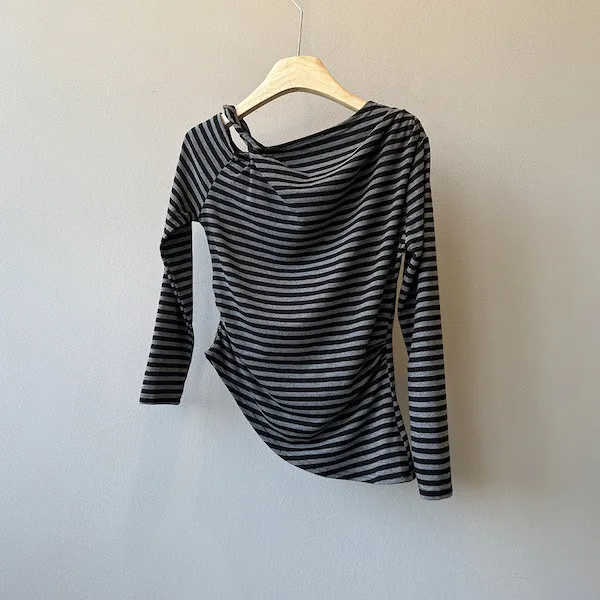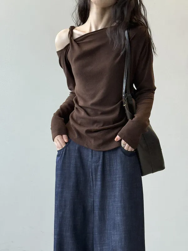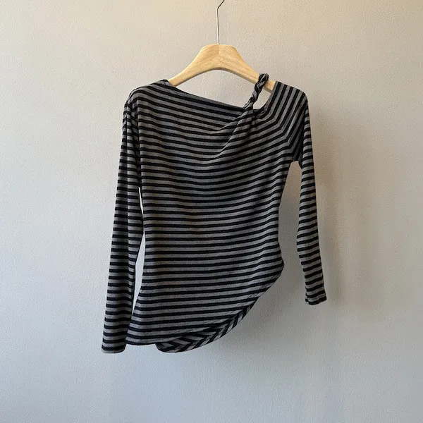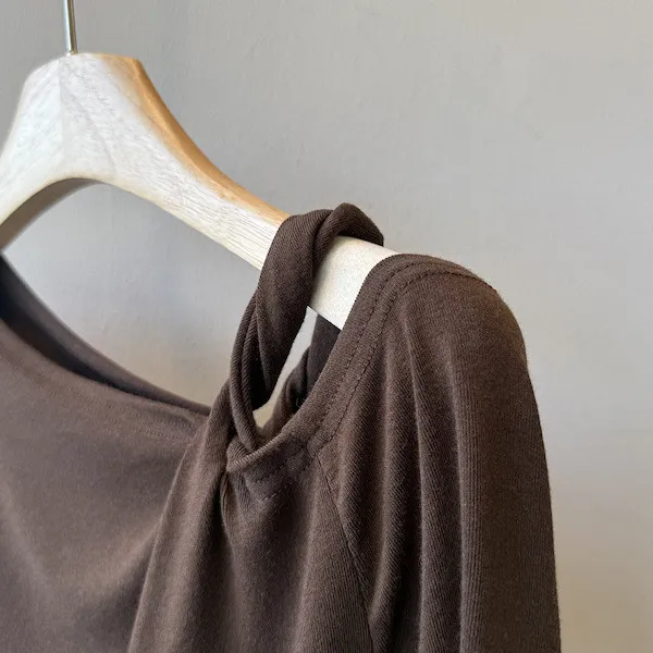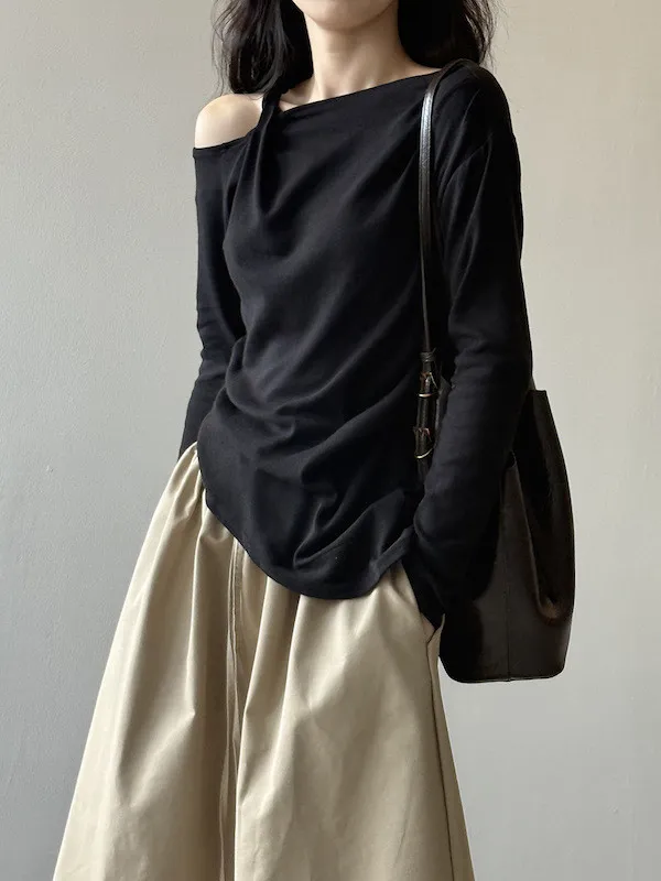 藝術隨想 斜肩扭結不規則長袖上衣 4色
