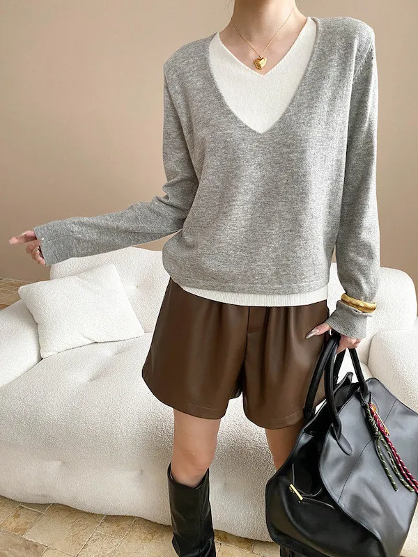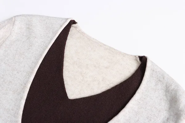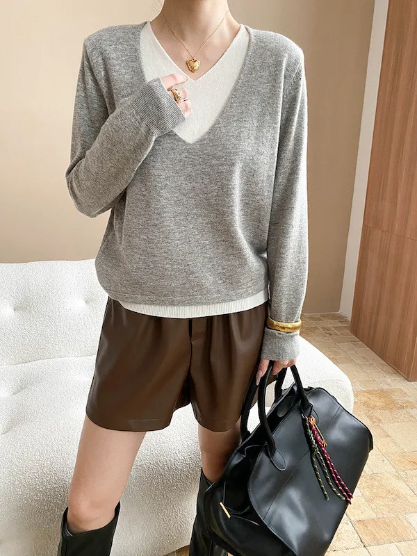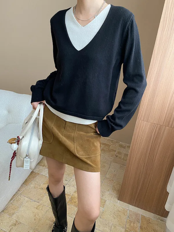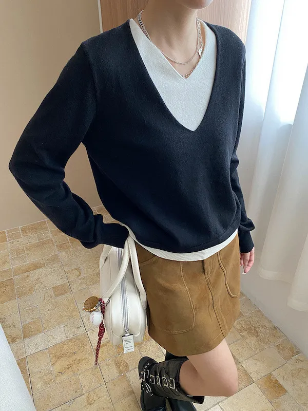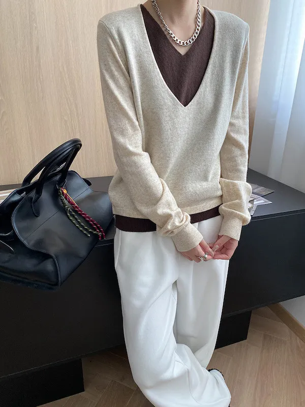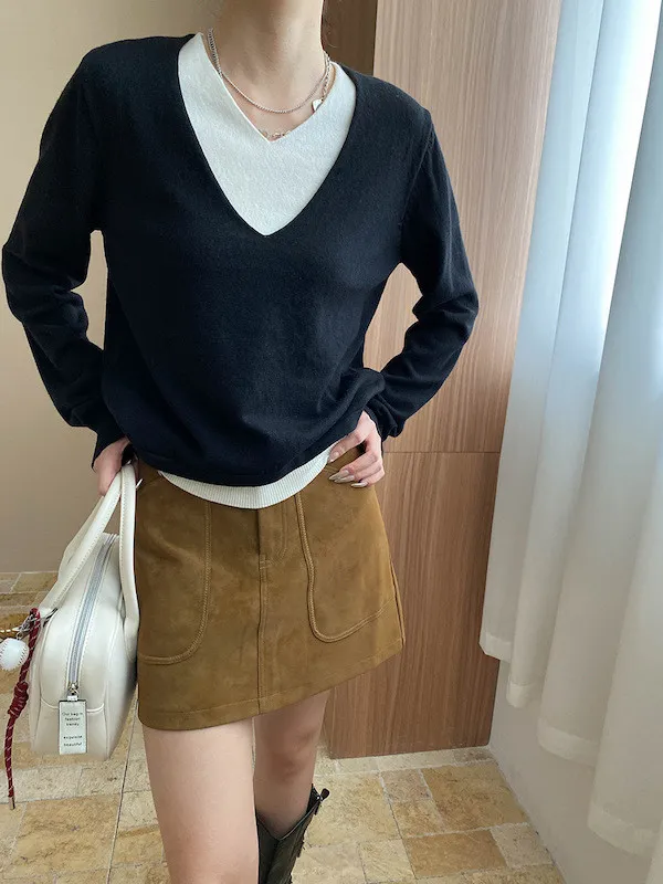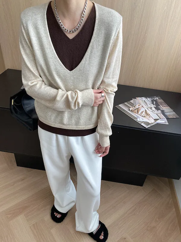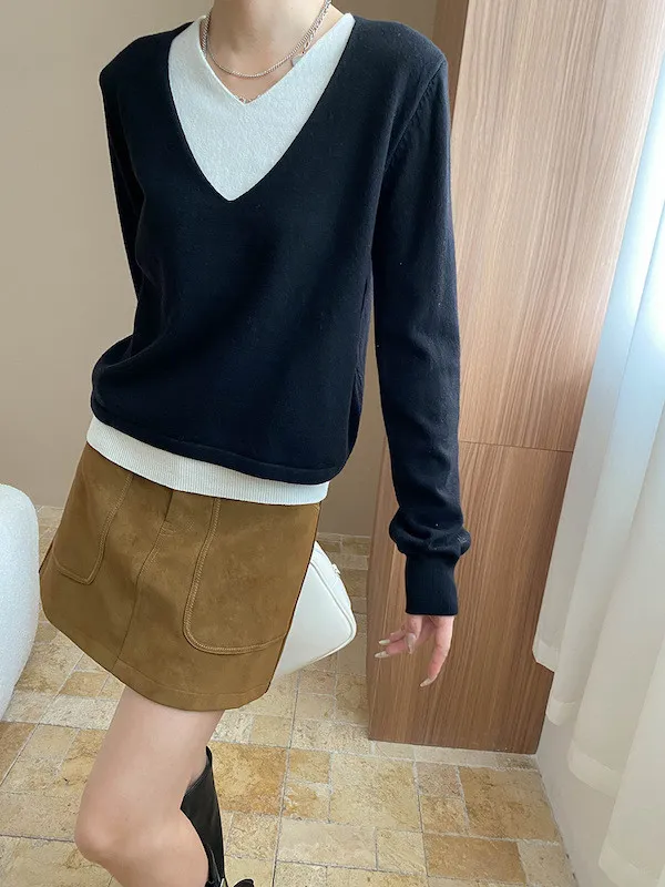 晨昏時光 假兩件撞色V軟糯領針織衫 3色