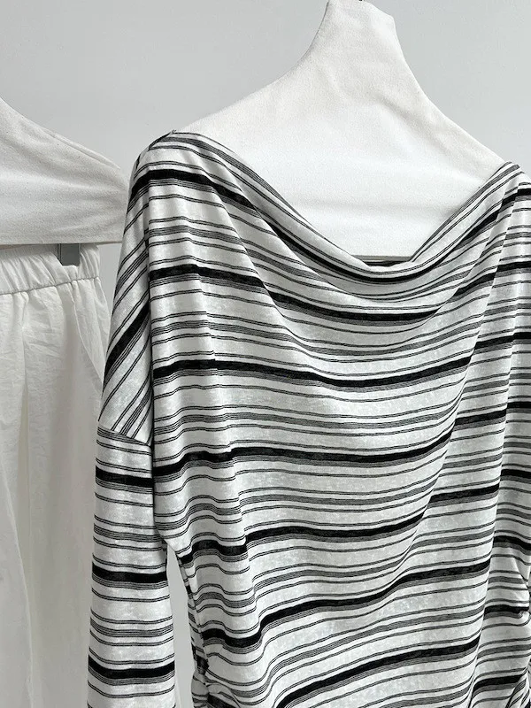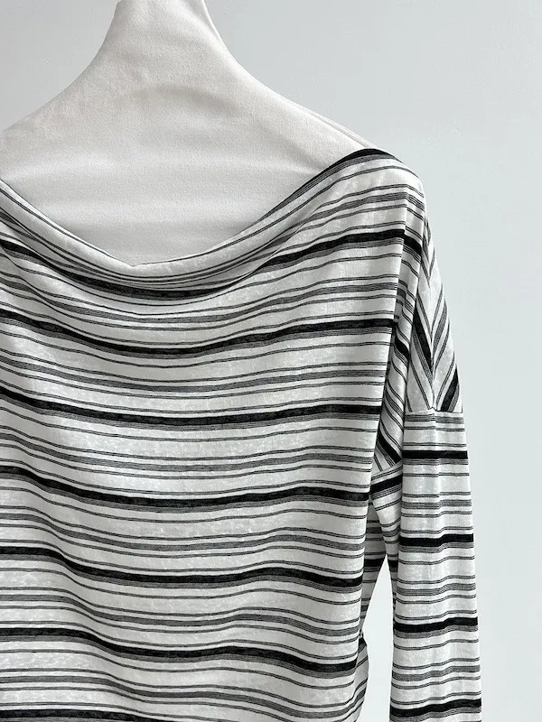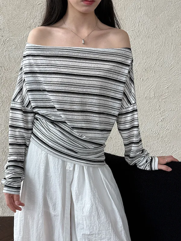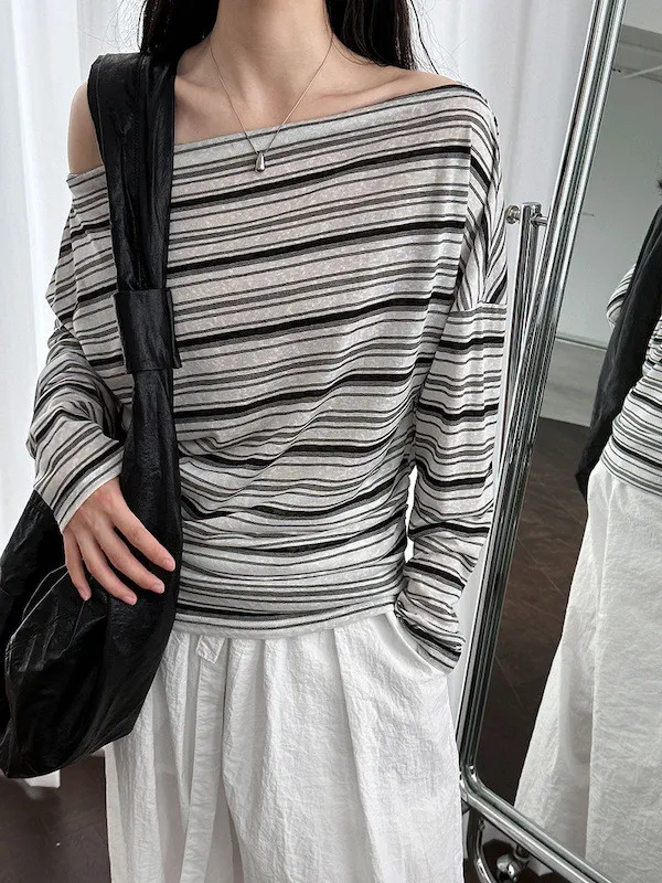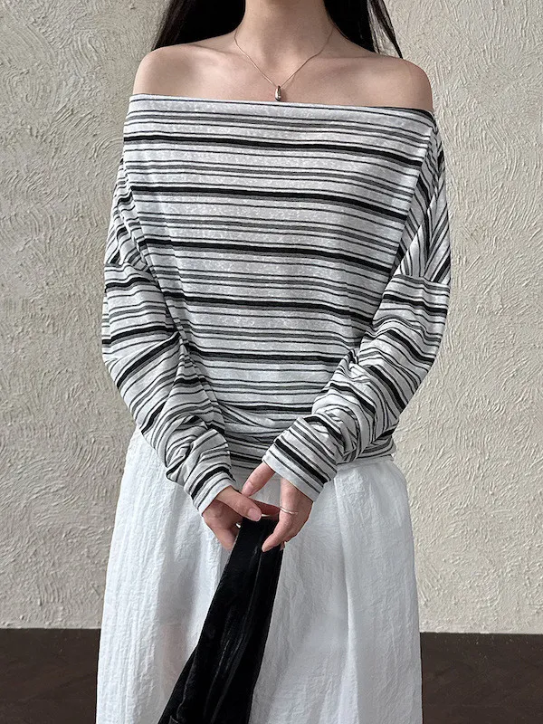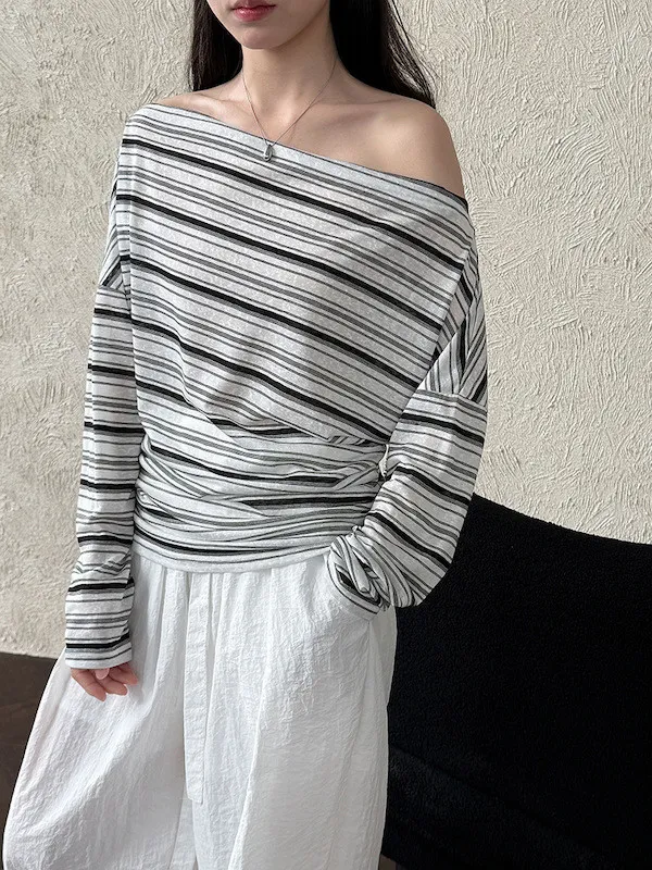 斜陽海岸 韓系條紋斜肩長袖上衣