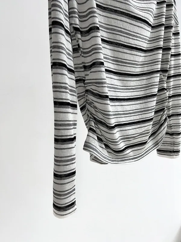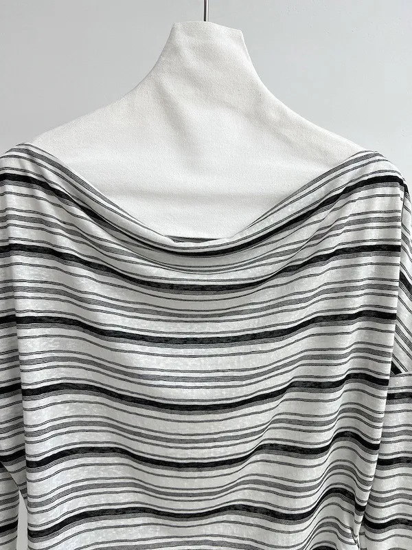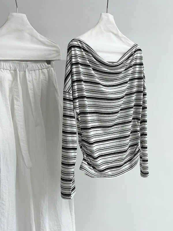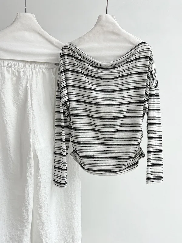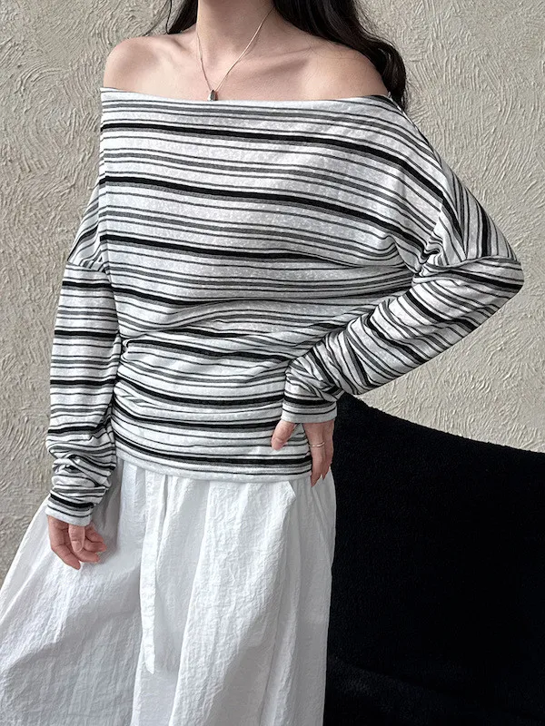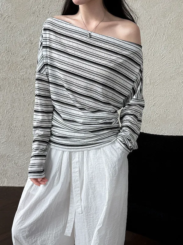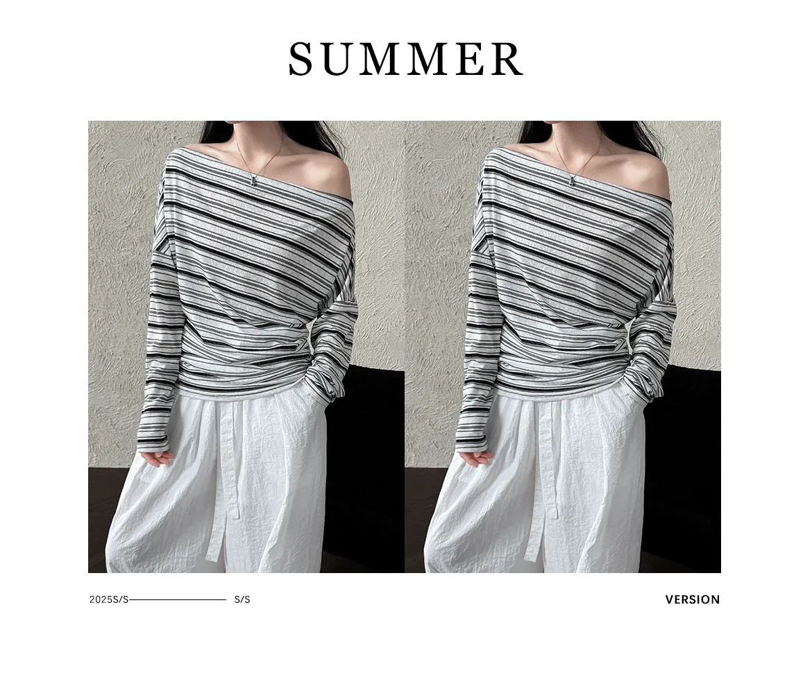 斜陽海岸 韓系條紋斜肩長袖上衣