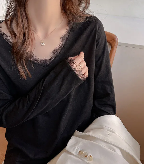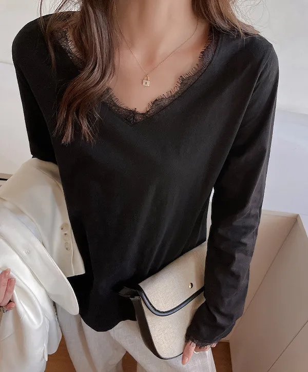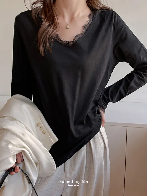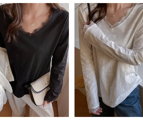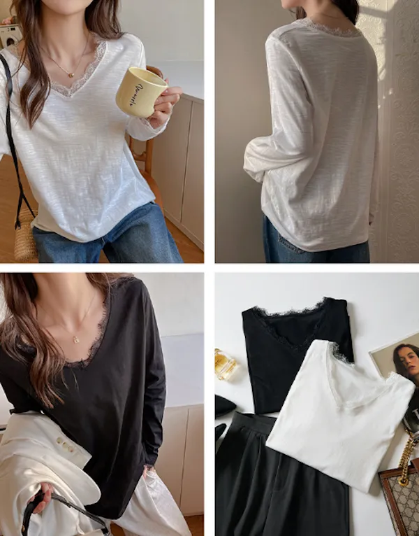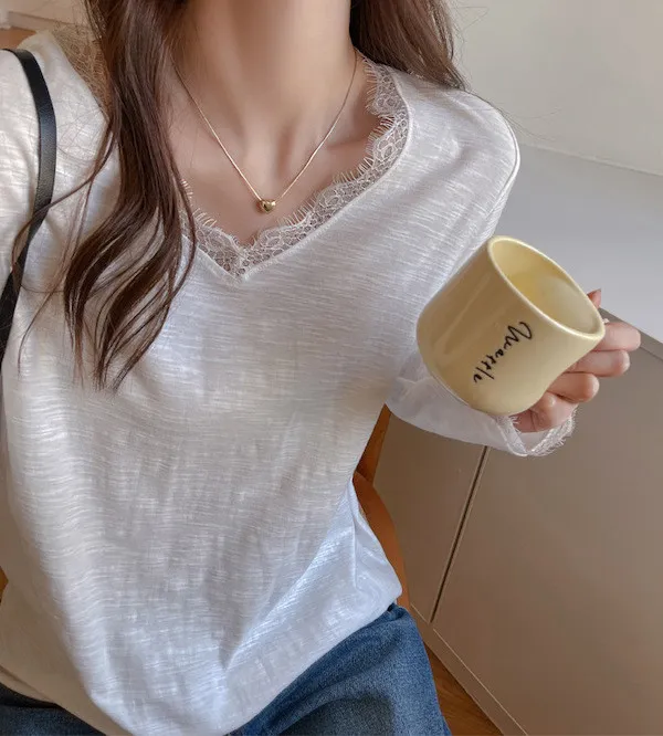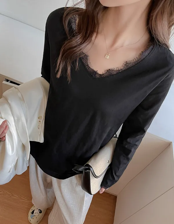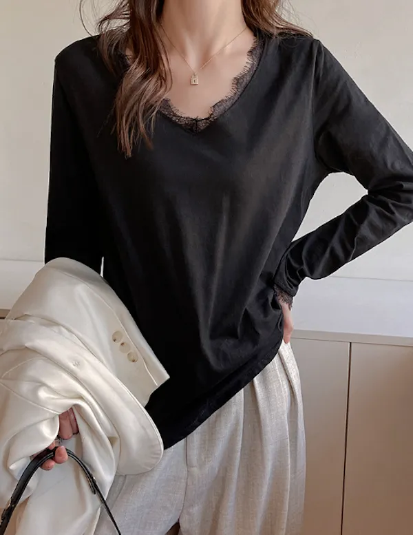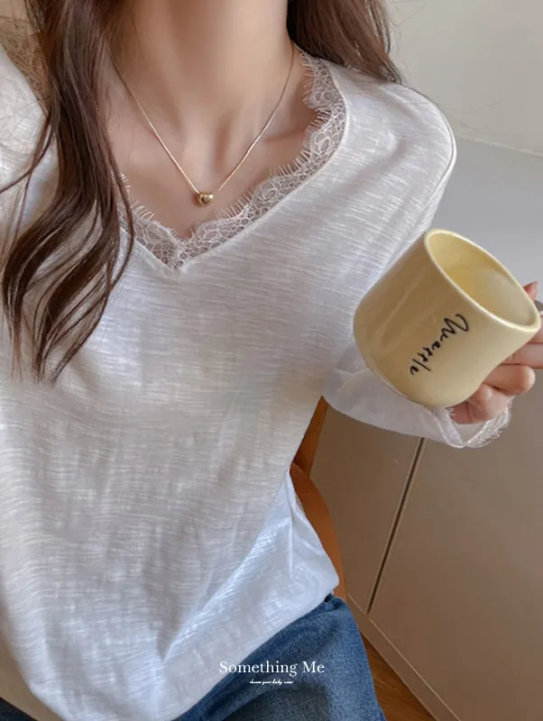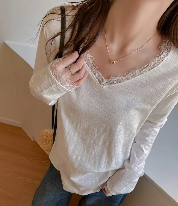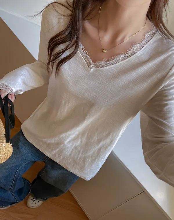 晨光微醺 V領蕾絲寬鬆長袖上衣 2色