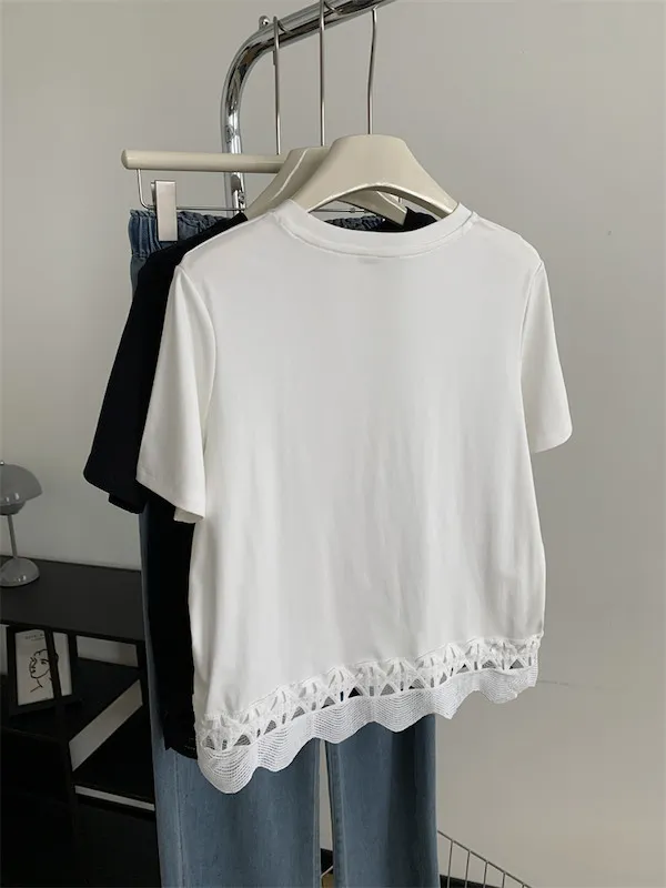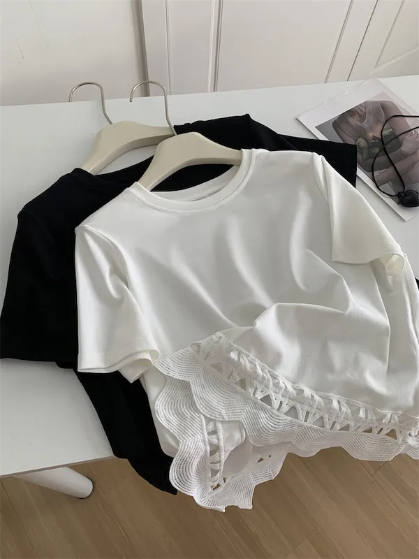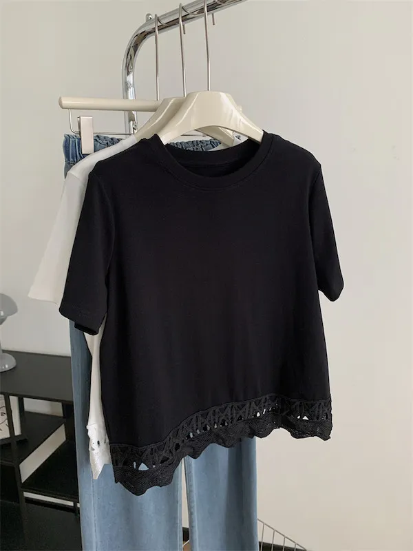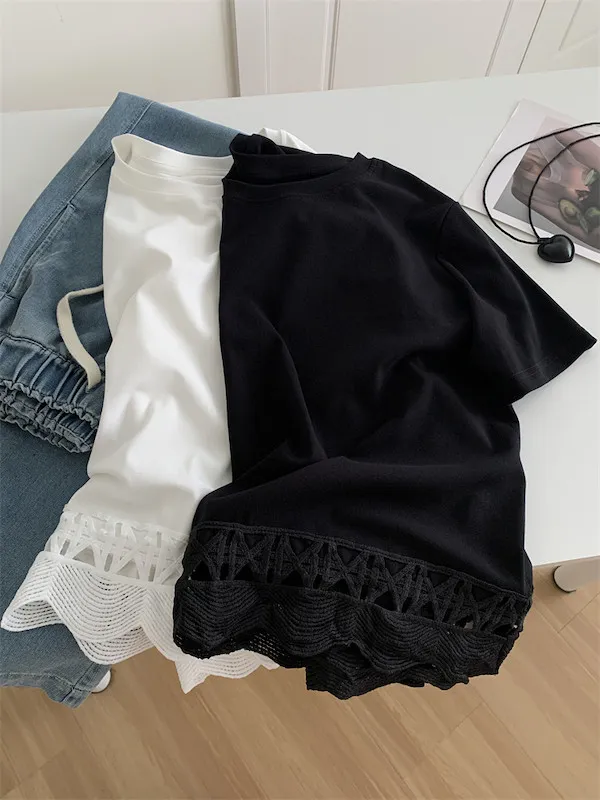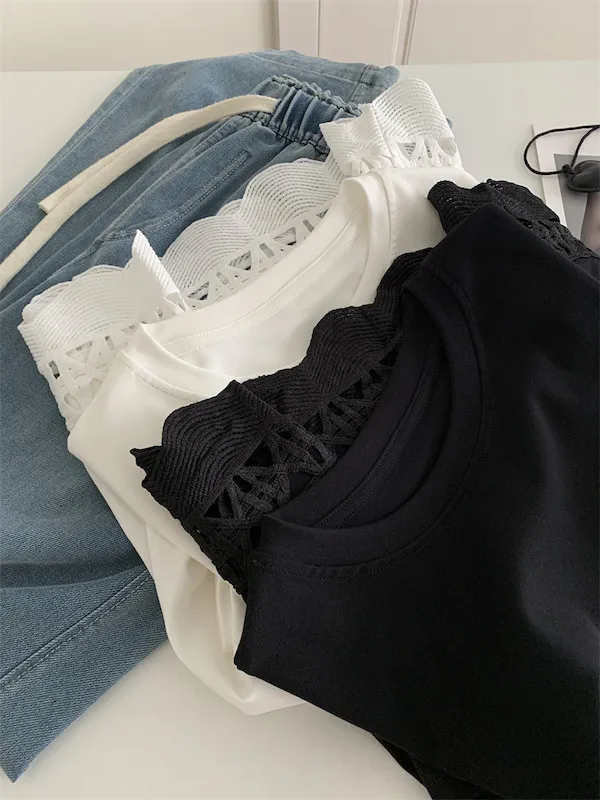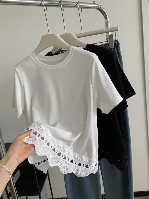 甜美鏤空花邊圓領短袖上衣 2色