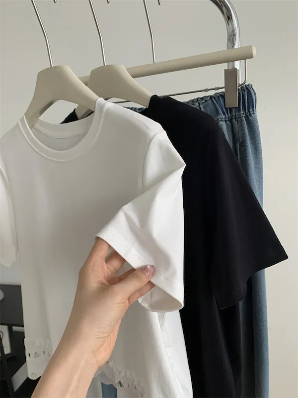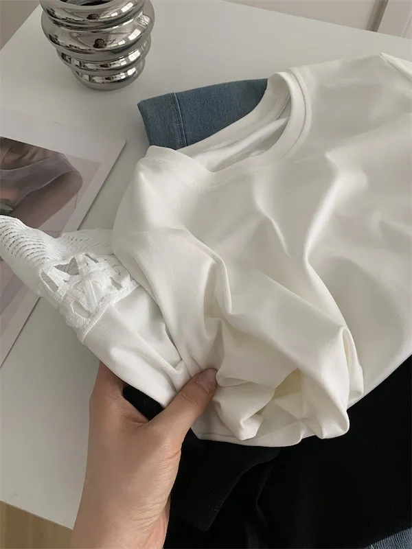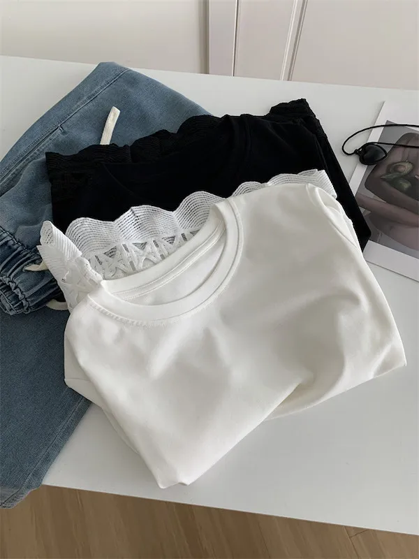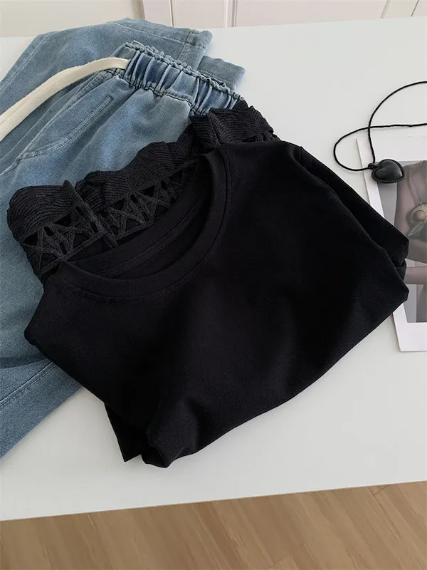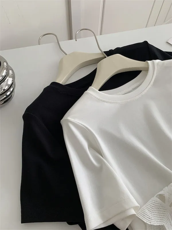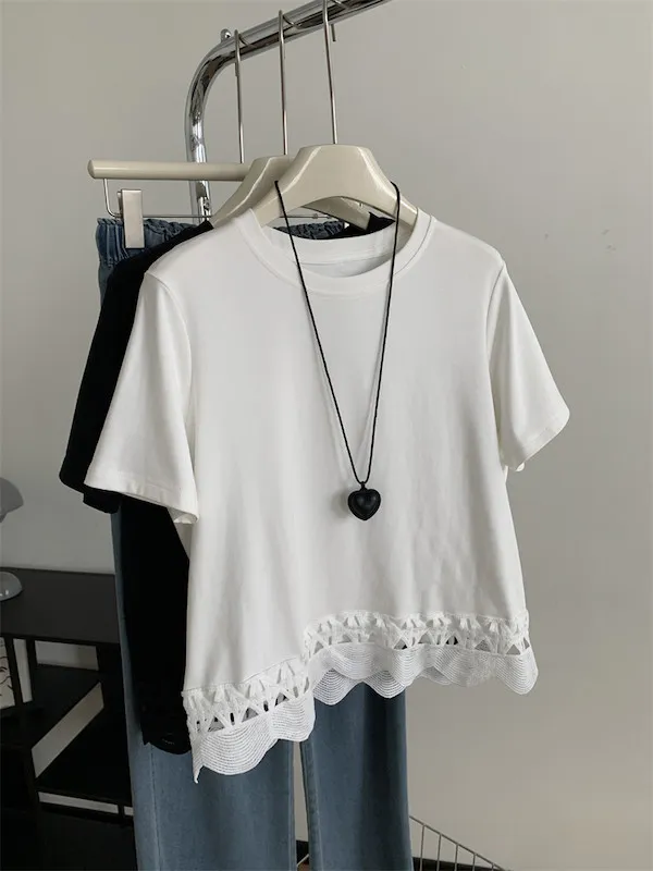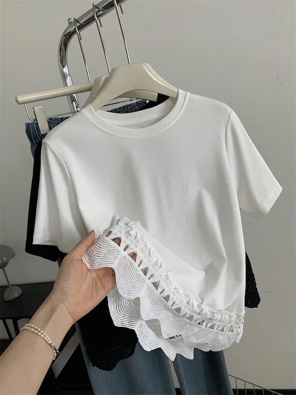 甜美鏤空花邊圓領短袖上衣 2色