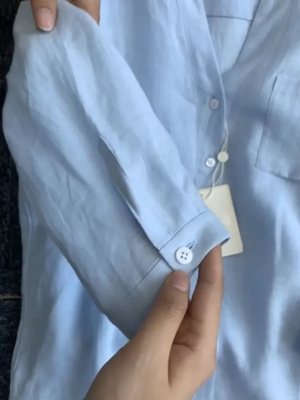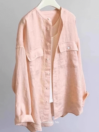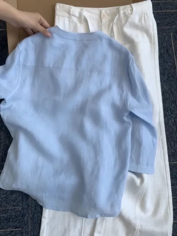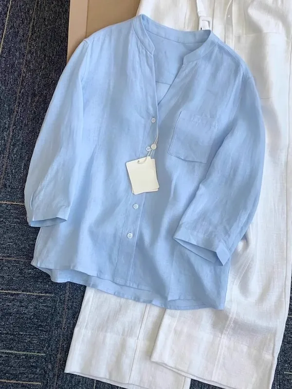 清晨薄霧 韓系亞麻V領五分袖襯衫 2色