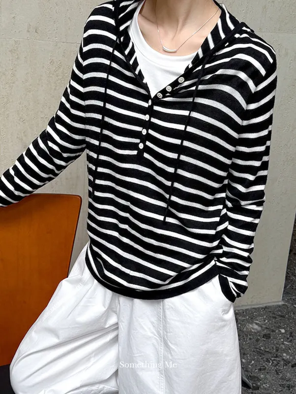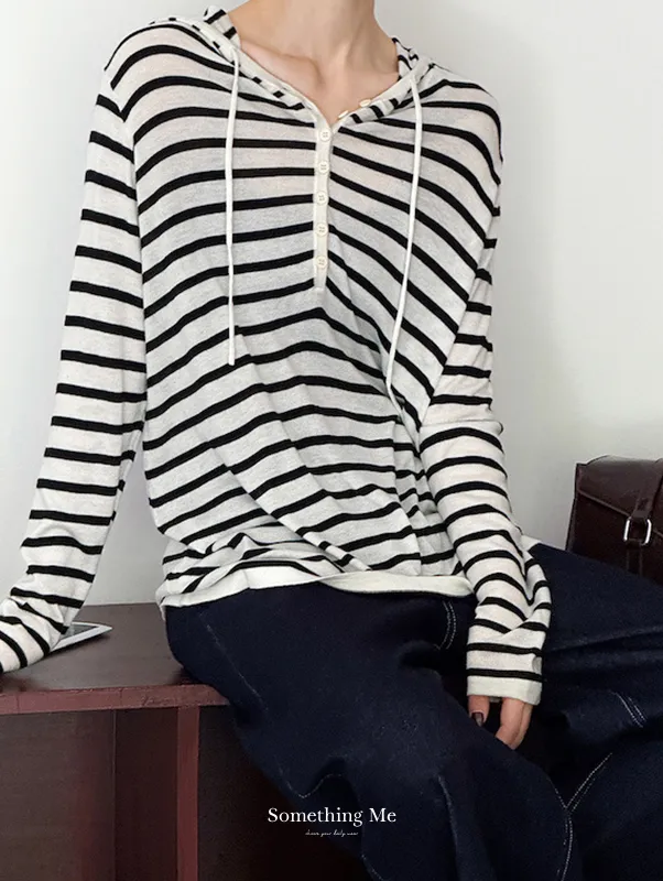 海風漫步 寬鬆條紋連帽長袖上衣 2色