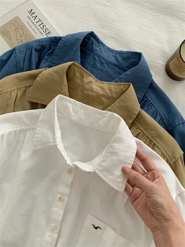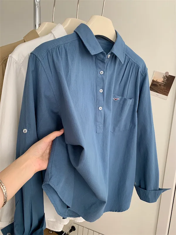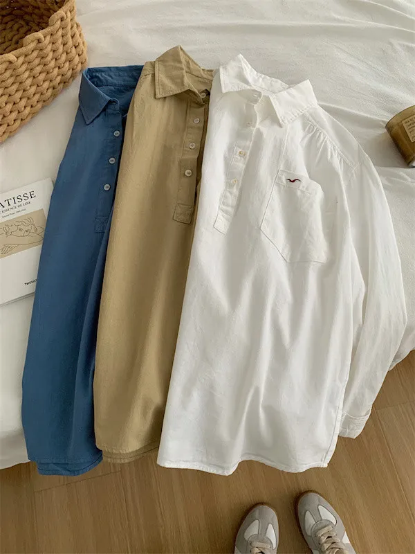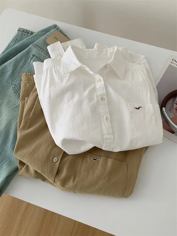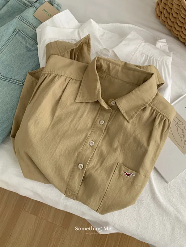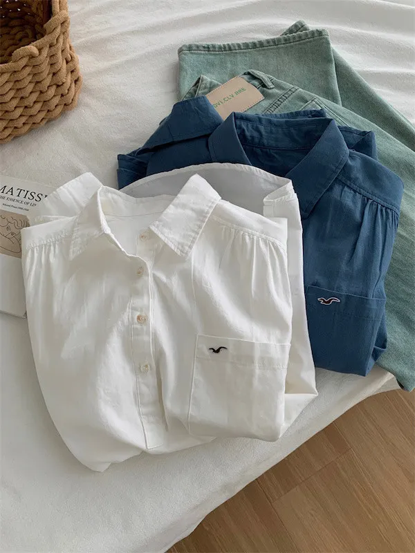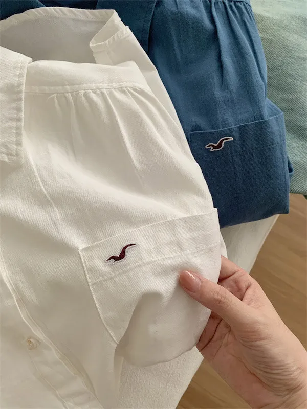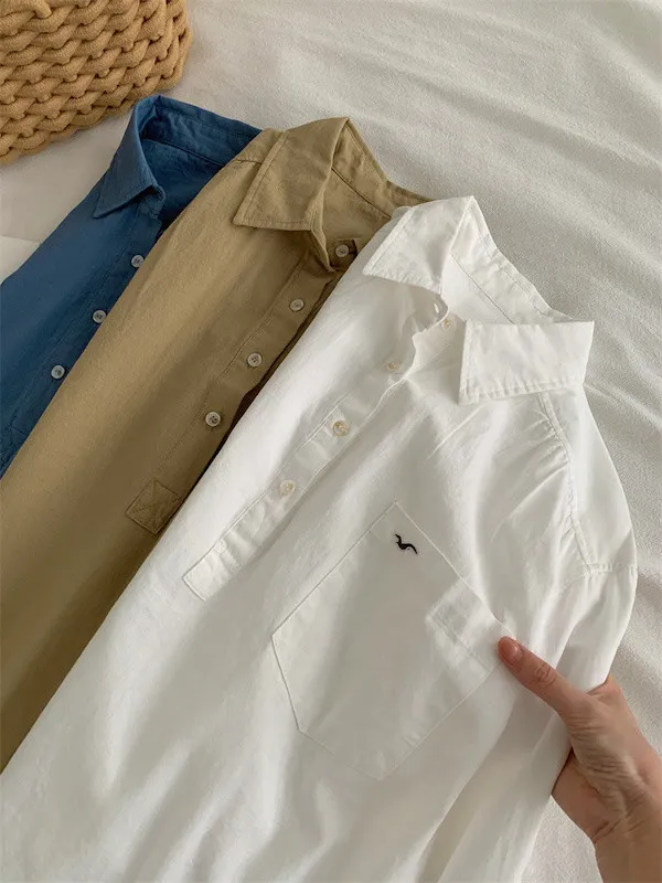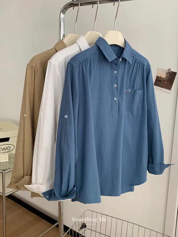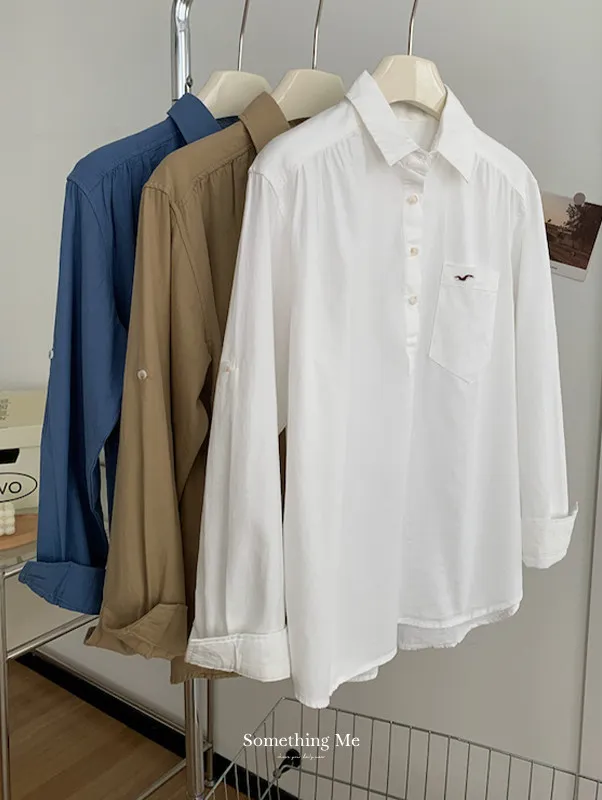 清晨微光 刺繡口袋水洗棉長袖襯衫 3色