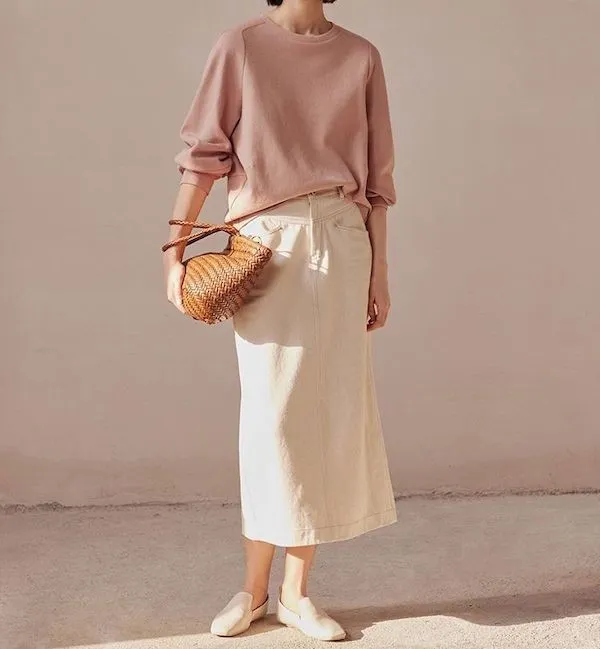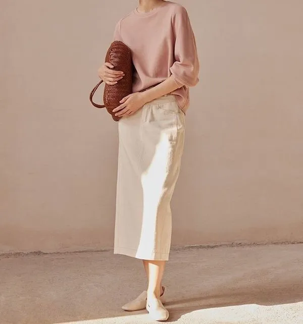 與BF250913 米色經典直筒開叉牛仔中長裙 搭配整套