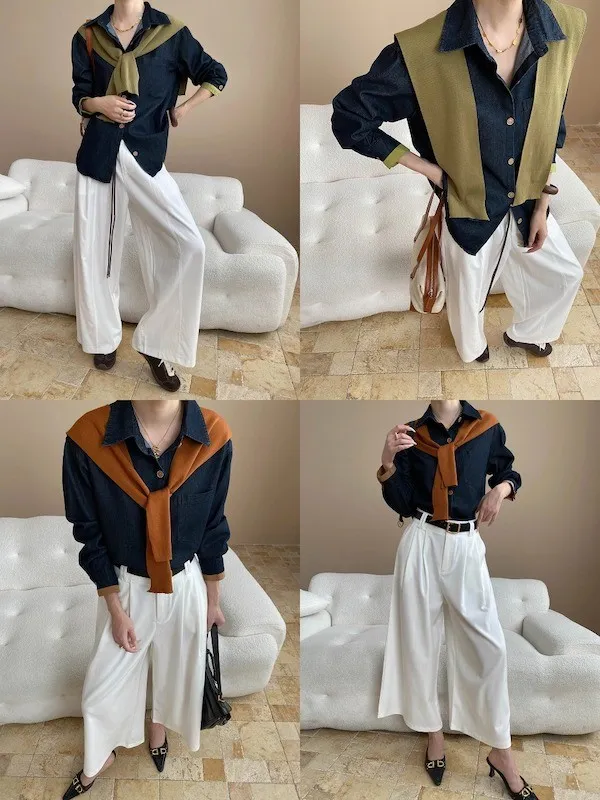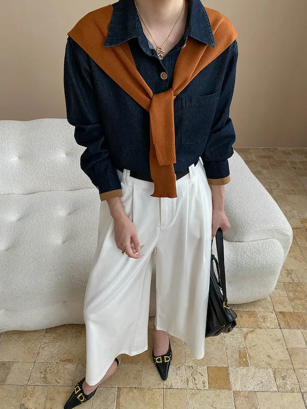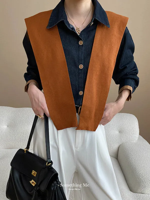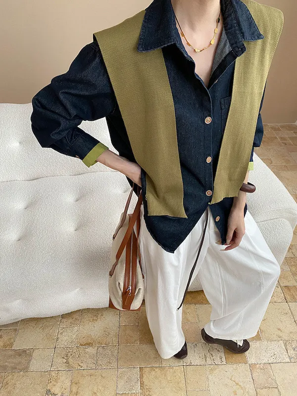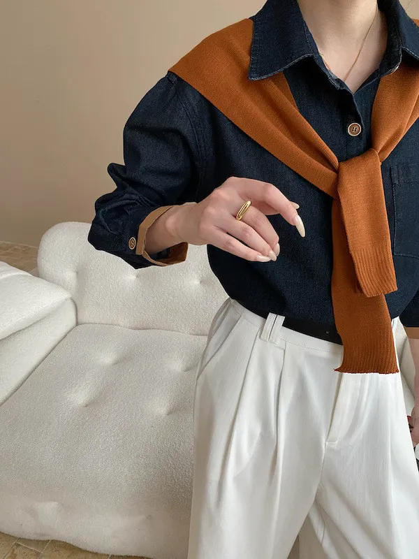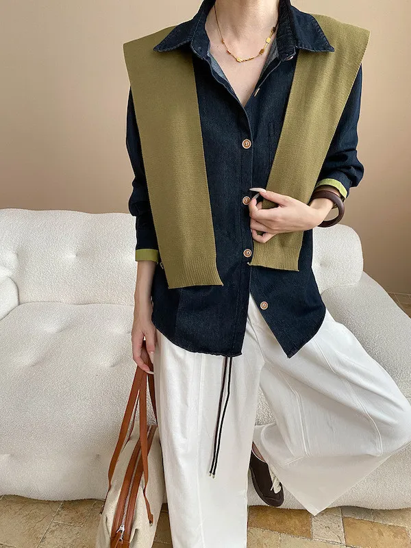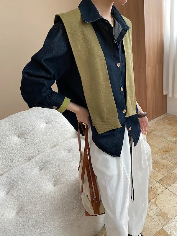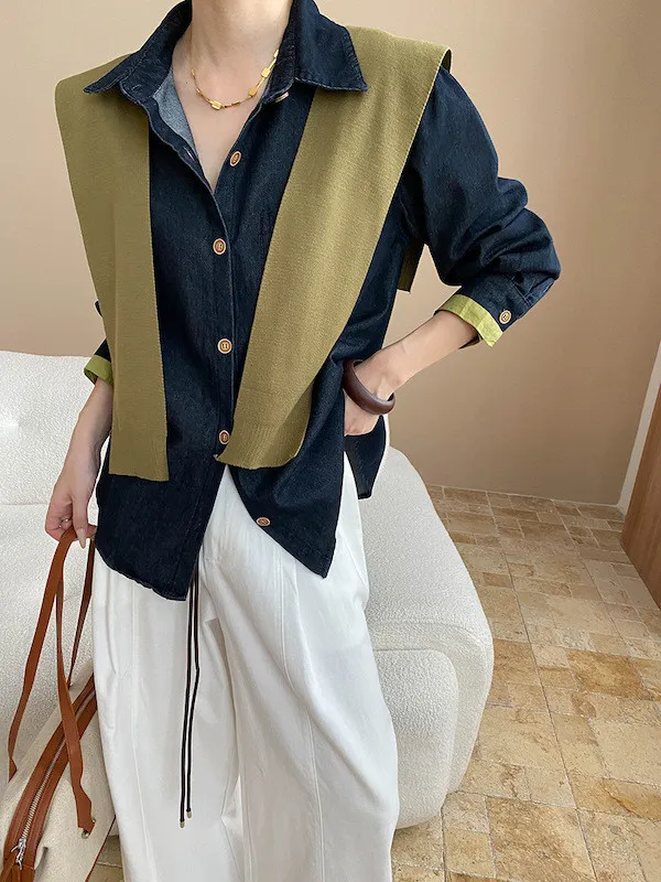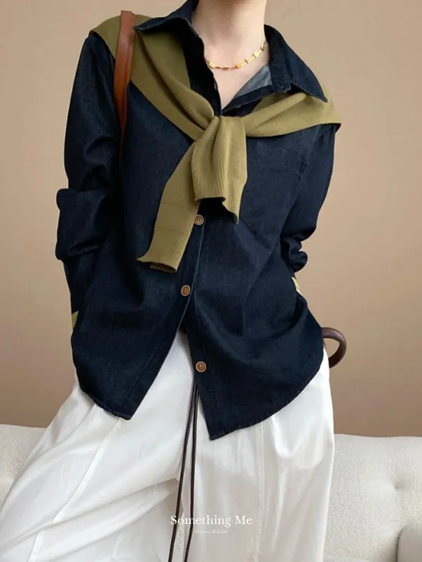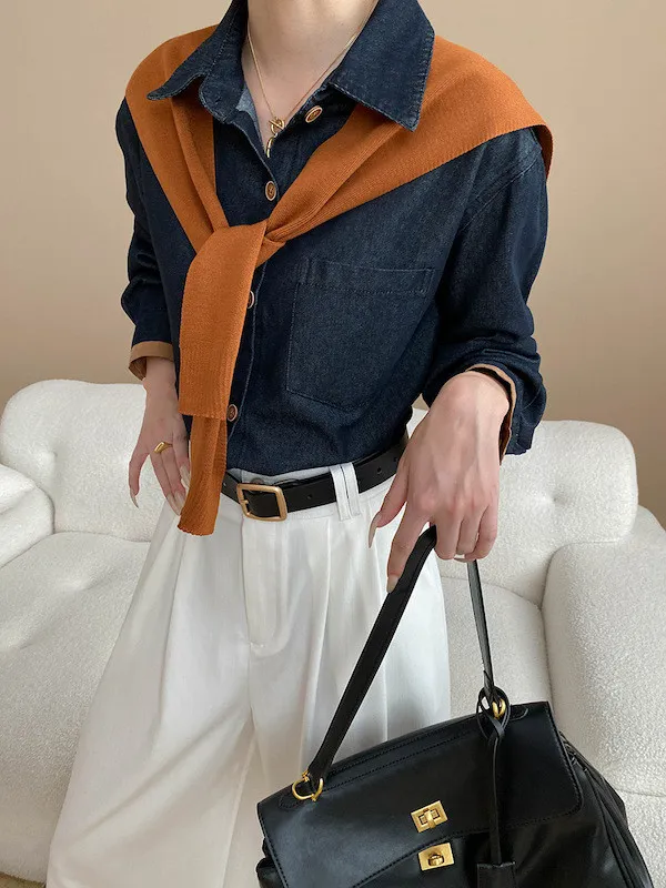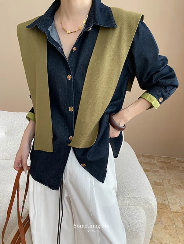 復古撞色牛仔襯衫(附袖口同色系披肩) 2色