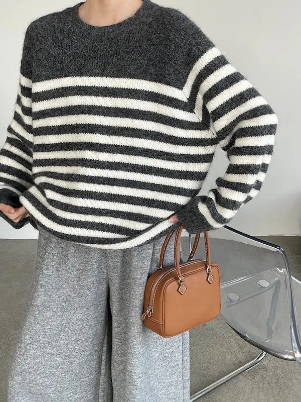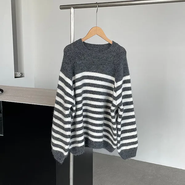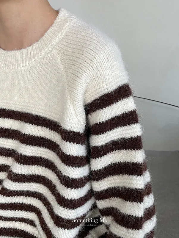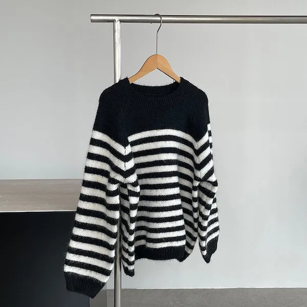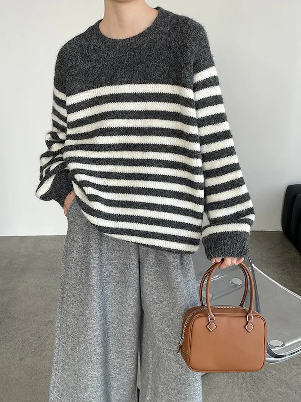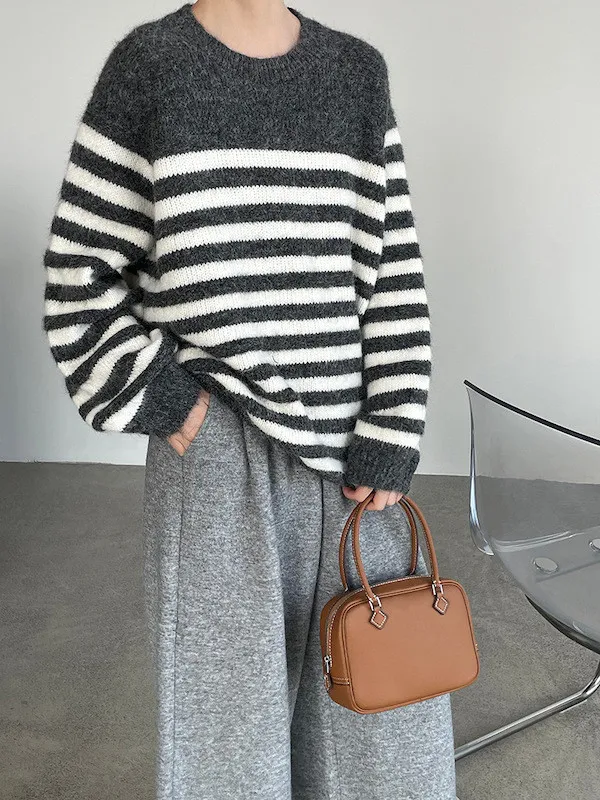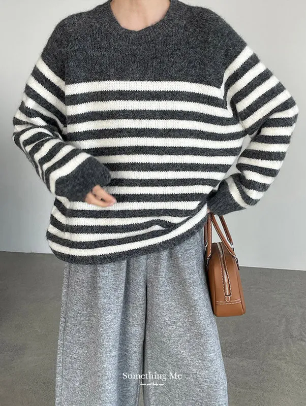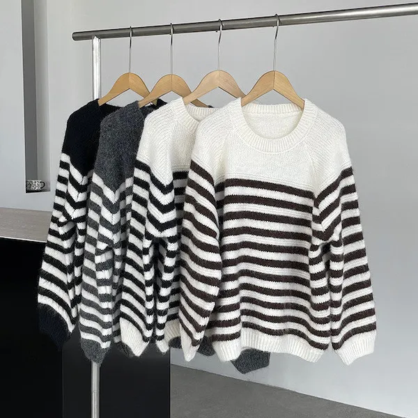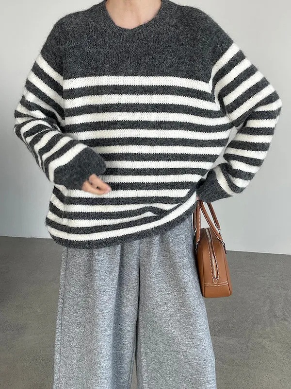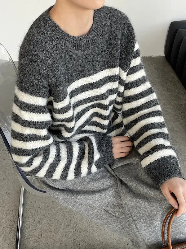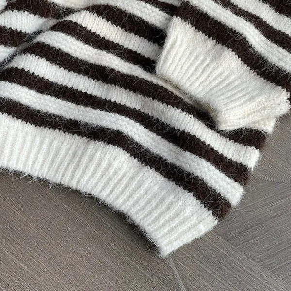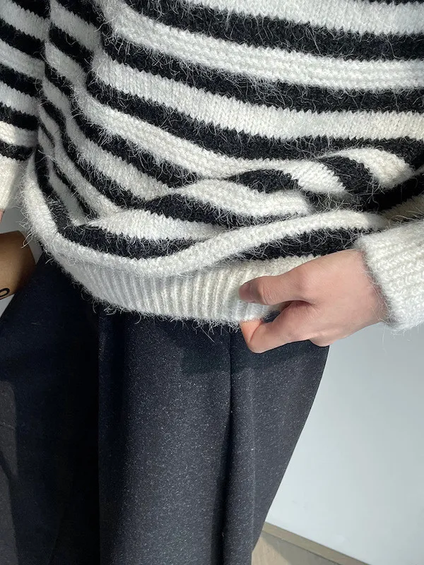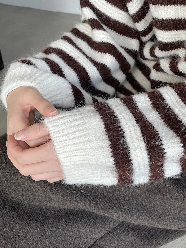 悠閒週末感 寬鬆撞色條紋羊毛針織毛衣 4色