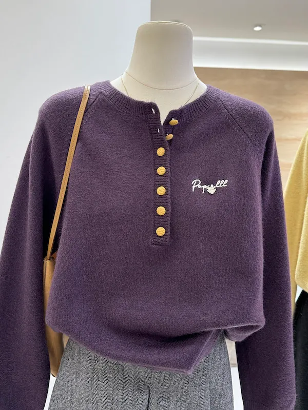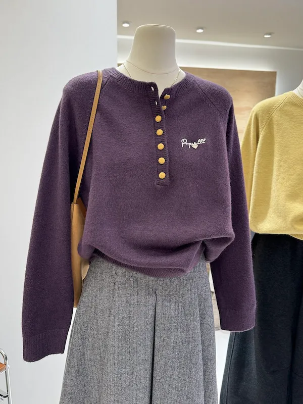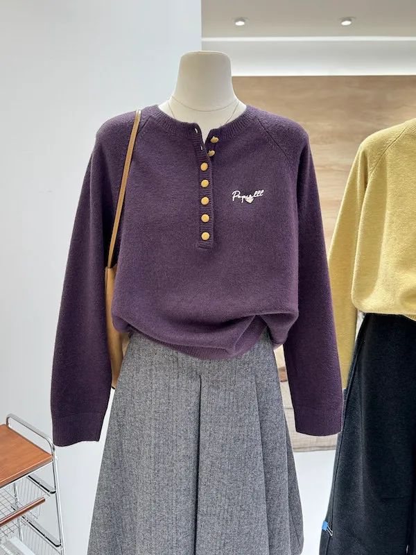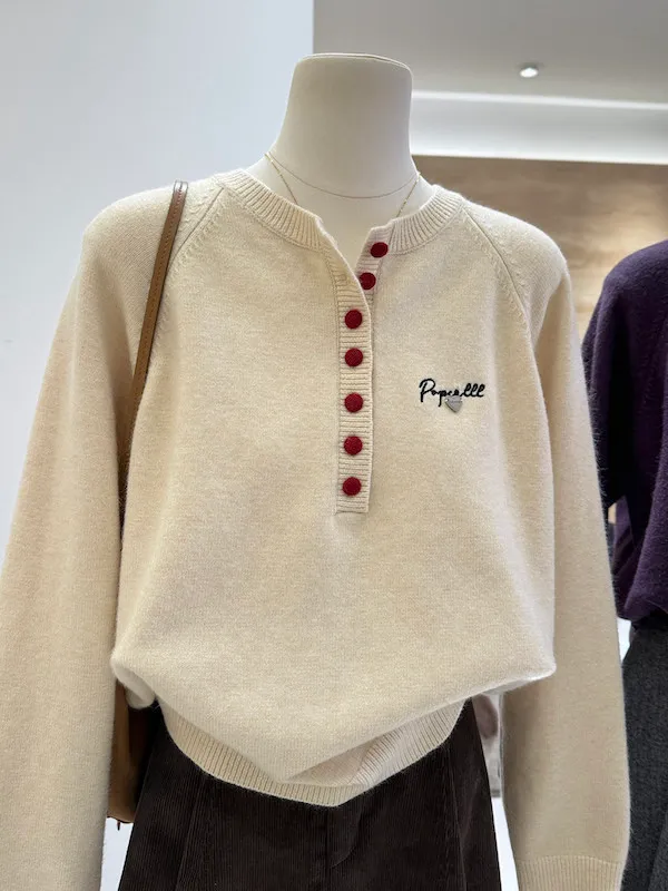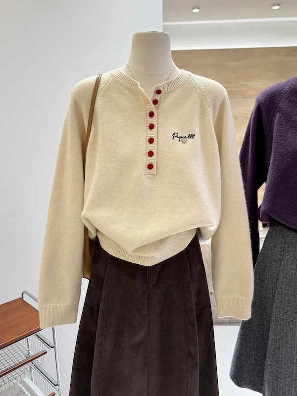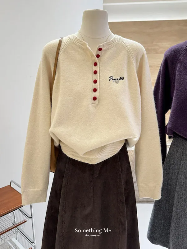 撞色排扣|復古字母刺繡半開領針織毛衣 2色