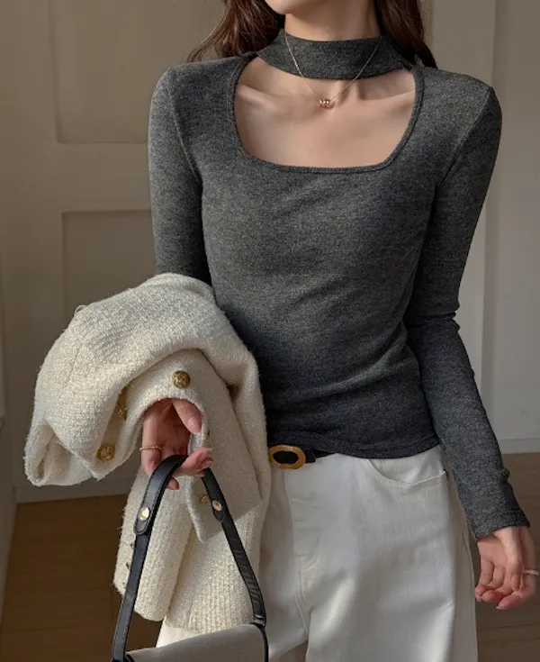 中領與方領間的交錯挖空,不僅修飾了鎖骨線條