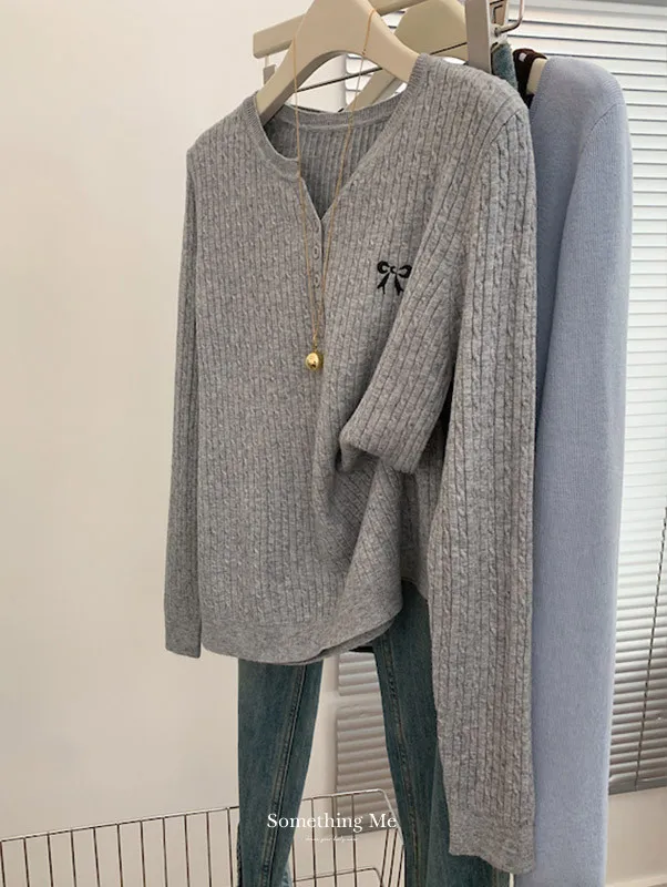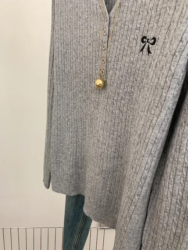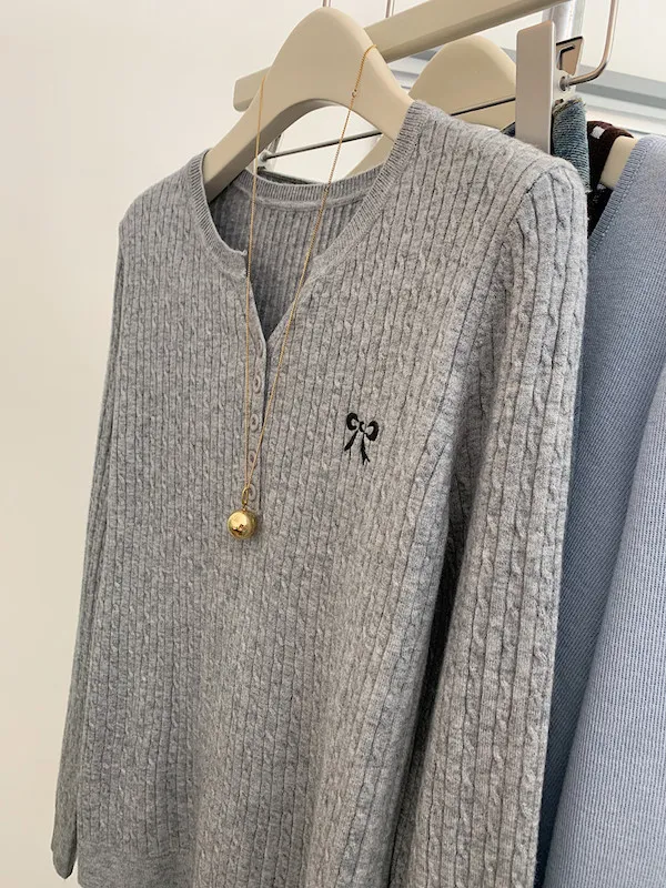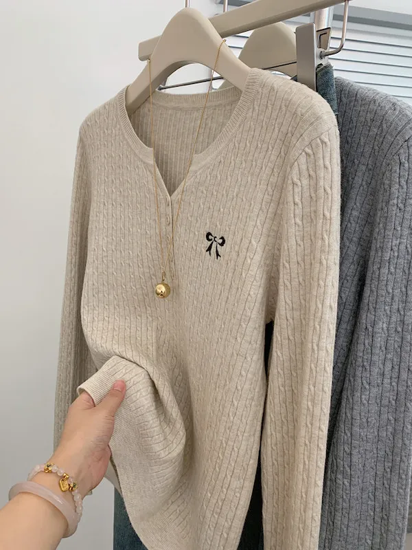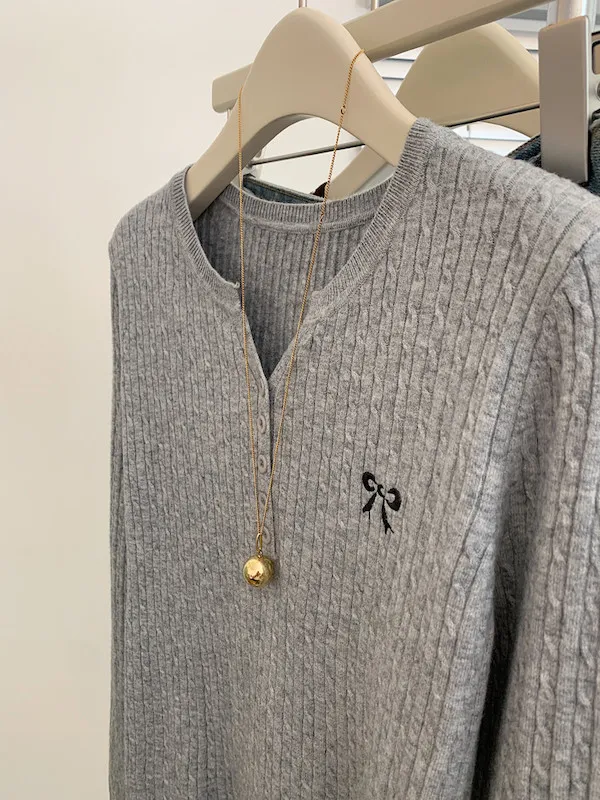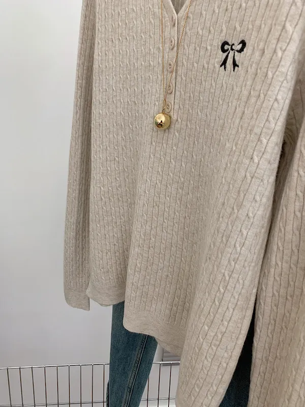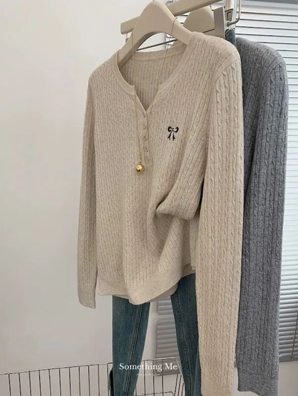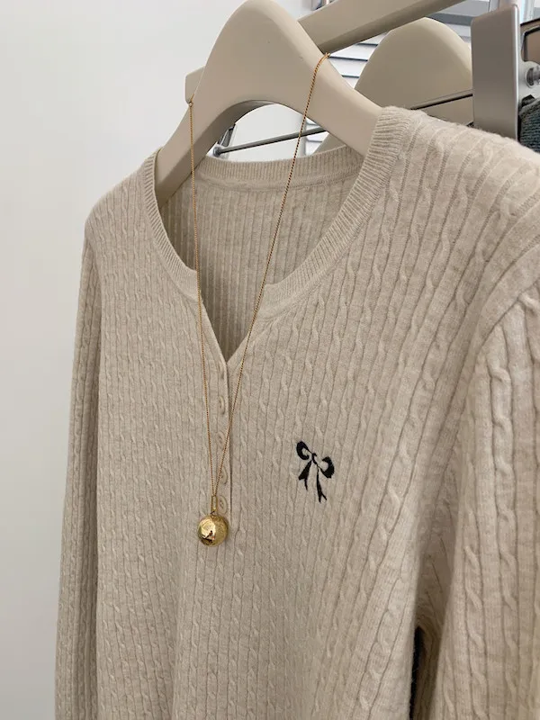 法式貴氣|蝴蝶結刺繡V領麻花針織衫 2色