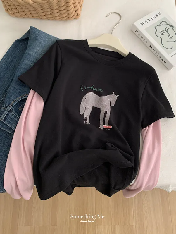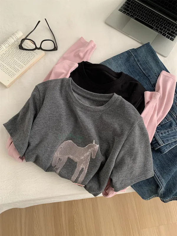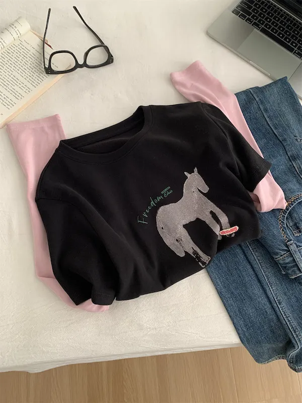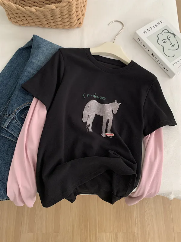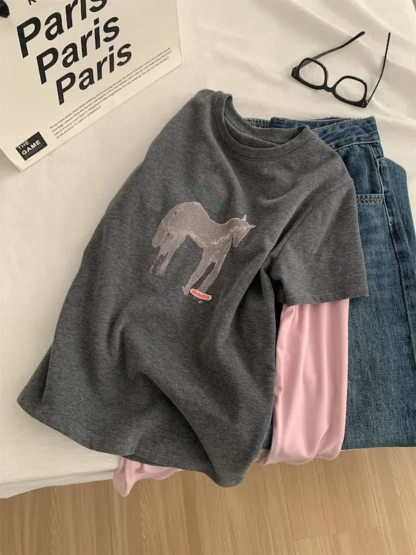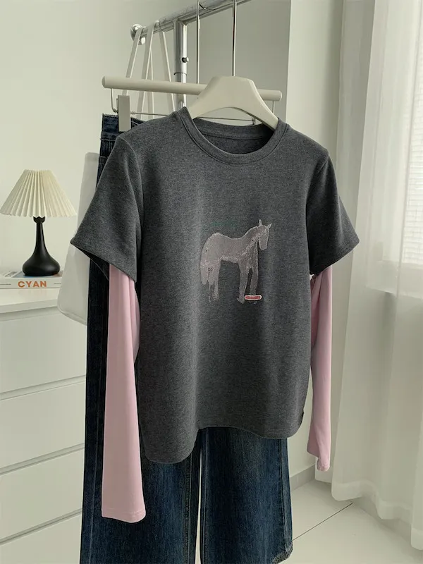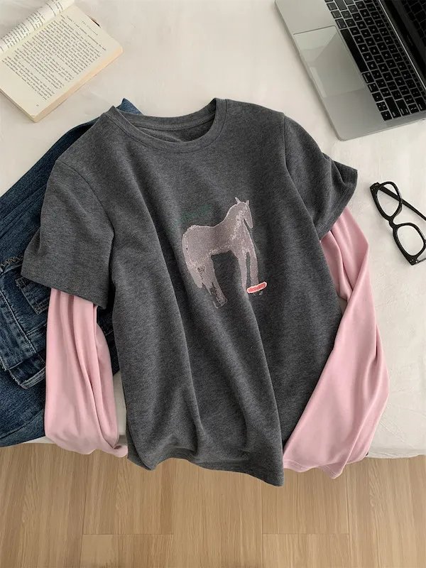 美式復古。假兩件小馬印花T恤 2色
