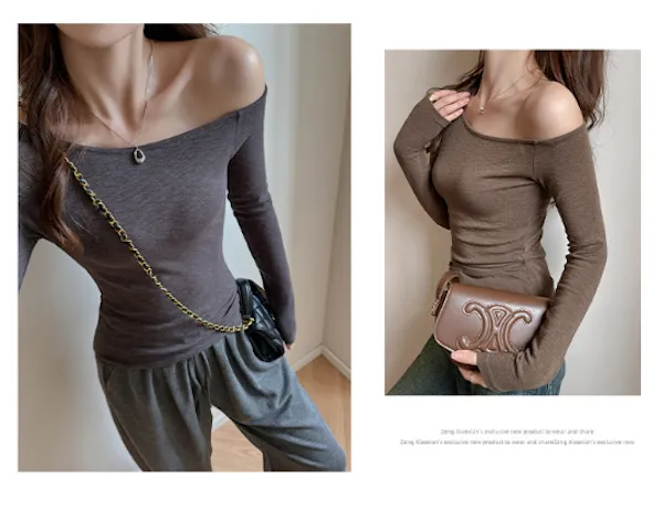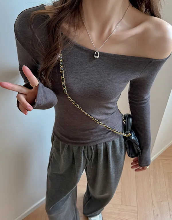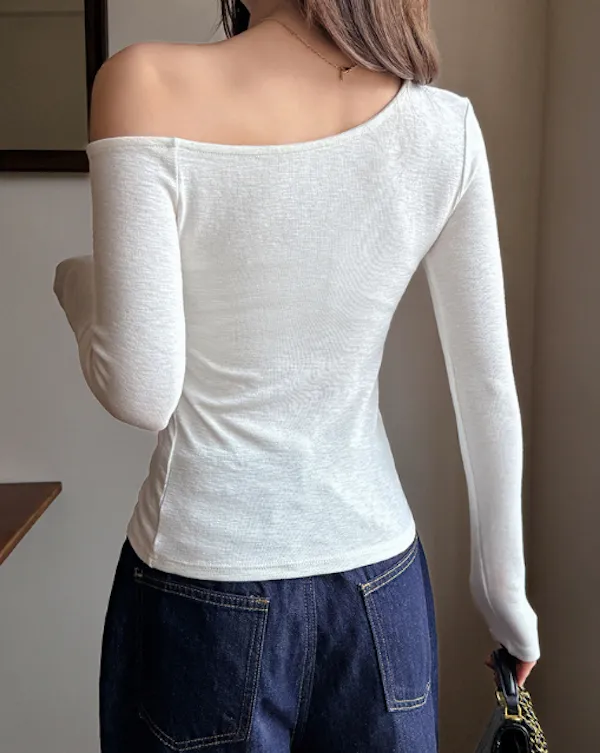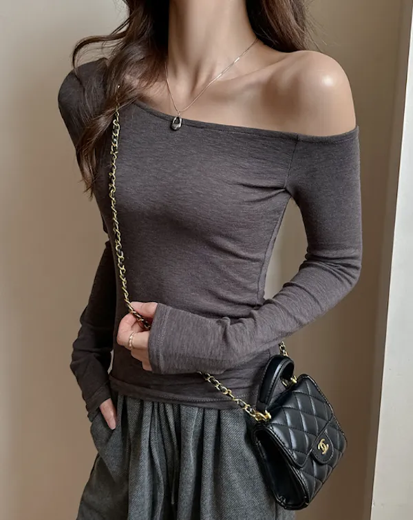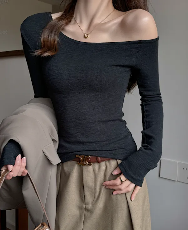 輕柔合身小性感斜肩長袖Tee 4色