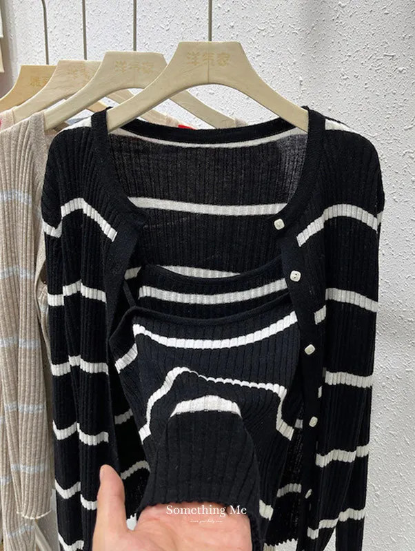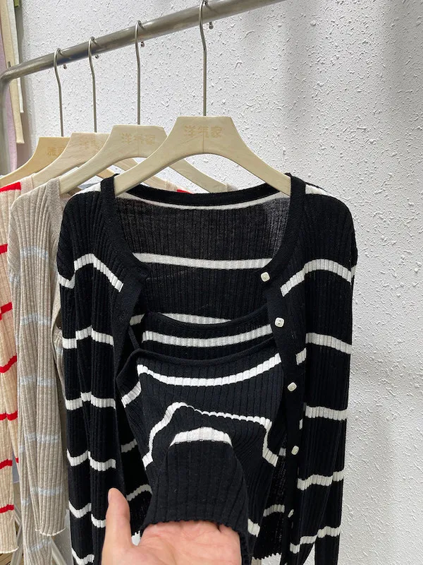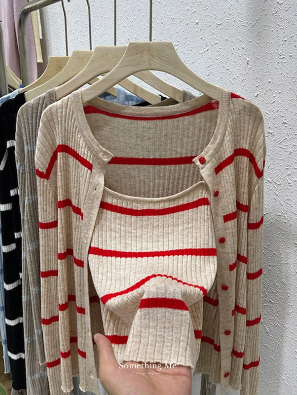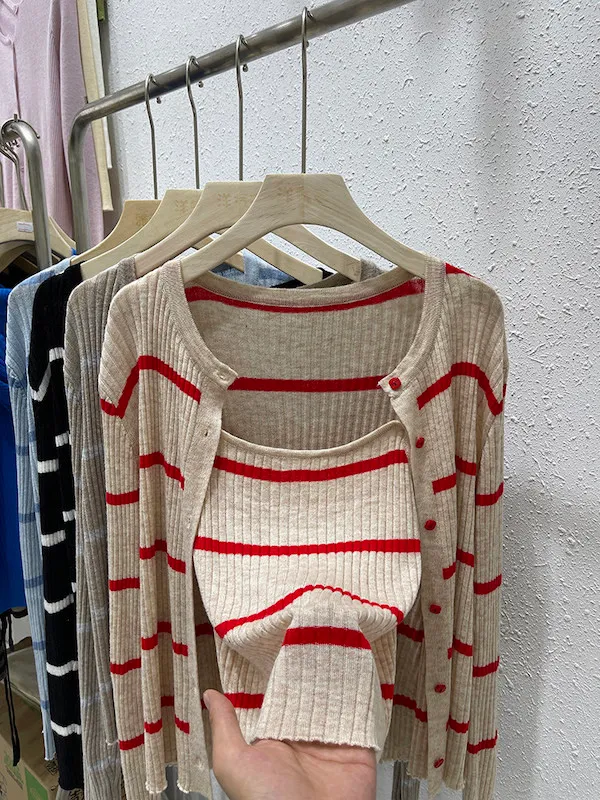 條紋針織開衫兩件套組(背心+外套) 2色