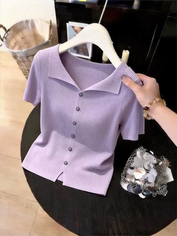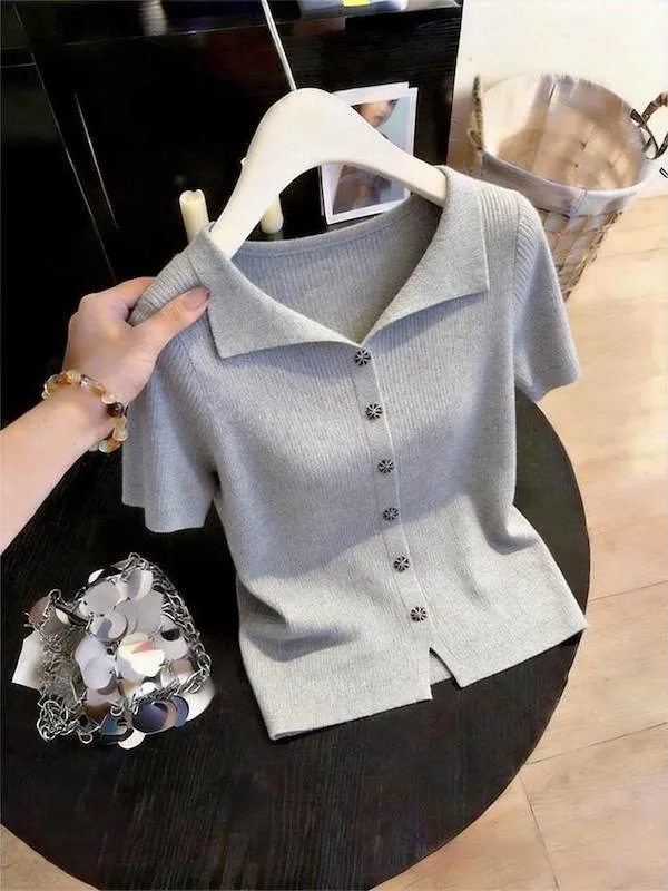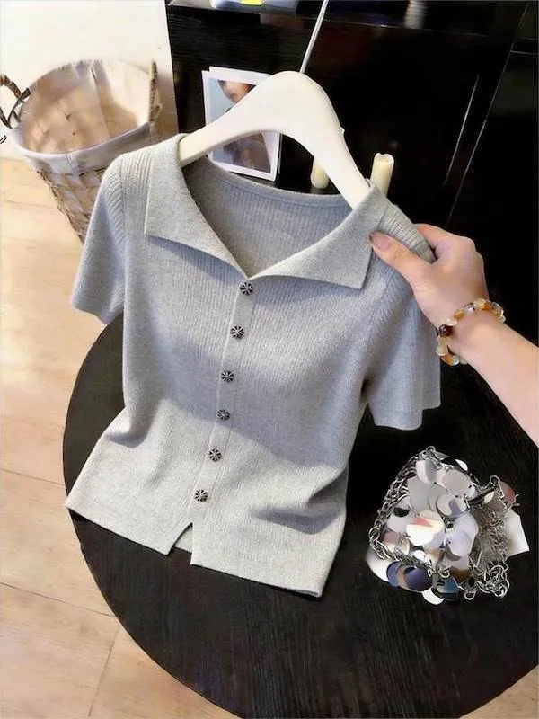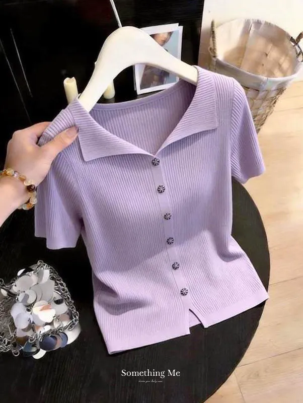 素雅輕奢感翻領簡約短袖針織上衣 2色
